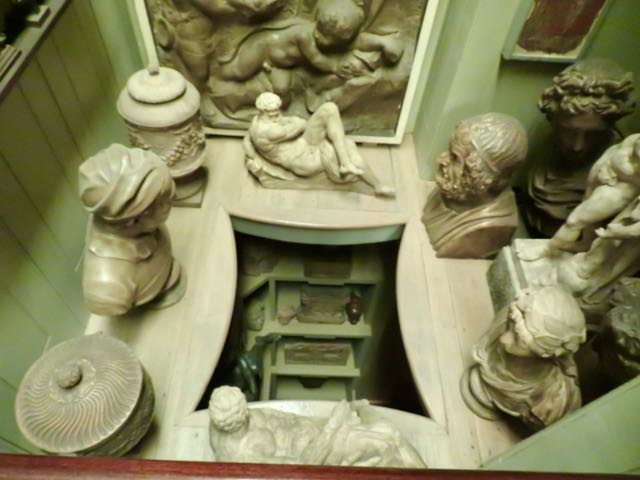The building housing the collection was Soane’s family home. When his collection outgrew the space, he bought the house next door, and then the house behind, and connected all of them with walkways and extension rooms. It is a maze. Here is a link to an amazing 3-D virtual tour of the Museum which is well worth a look.