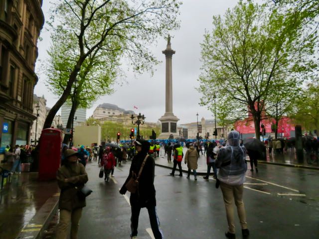 Central London is usually easy to navigate, but the many barricaded streets made passage very difficult. Every couple of blocks there was a spot in the barricades where minders would pull open the fences for about 30 seconds to hustle people across the street. (“Go, go, now! Hold, hold, hold!”) People would queue and push and then make a mad dash for the other side (all in very orderly fashion, of course, this is Britain). It was a relief to get out of the Green Park crush and stroll through St. James Park – my favorite.