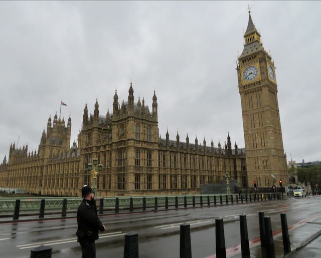 Exiting St. Magnus, we walked along the Thames walk to Tower Pier to catch a ferry upriver to Westminster Pier. The day was partly sunny (Brit speak), with rain lurking in dark but picturesque cumulus clouds.