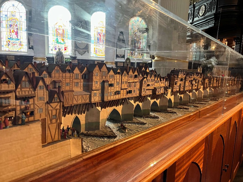 …and a 12 foot long scale model of the medieval London Bridge (NOT the one in Lake Havasu) created by the Worshipful Company of Plumbers which is housed in the church’s vestry. You know what we came to see. The model faithfully reflects the bridge’s architecture and setting in the Thames – running boats under the bridge when the tide was high was a very dangerous occupation then – as well as the bustle and chaos of hundreds of people doing business and trying to cross the bridge simultaneously. It’s brilliant.
