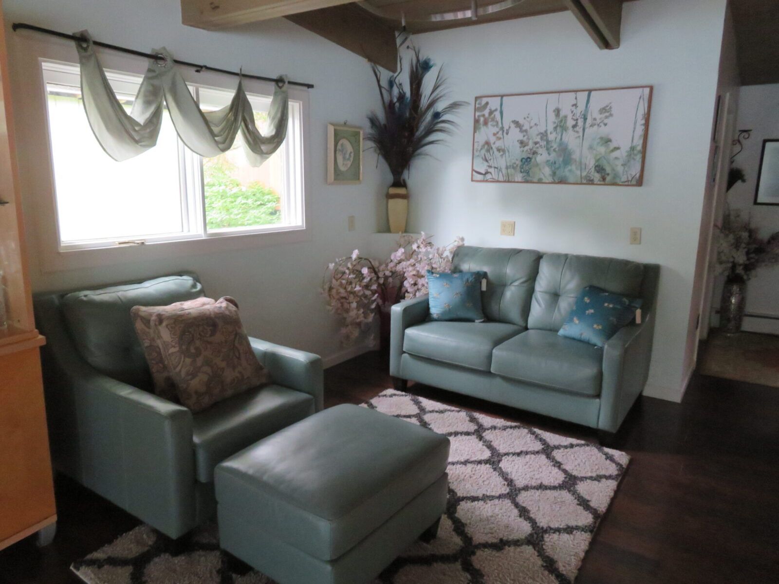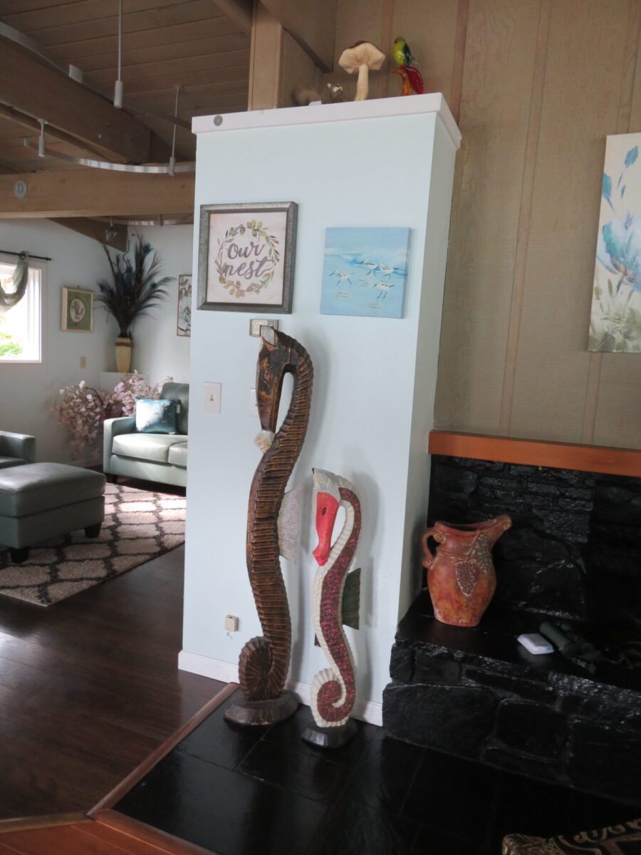 Now the strangeness. The house seemed to be two structures that had been merged together, resulting in some really funky plumbing and wiring. When we arrived, hot water wasn’t making it to some of the bathrooms and the heat wouldn’t turn off – we sweltered for the first couple of days. A plumber and a heating guy eventually came and fixed things (we heard grumbles about this not being their first visit) so that was a win. Although there were lots of comfortable chairs positioned around the house, there were no side tables to hold a book or beverage, and almost no reading lamps, upstairs or down.