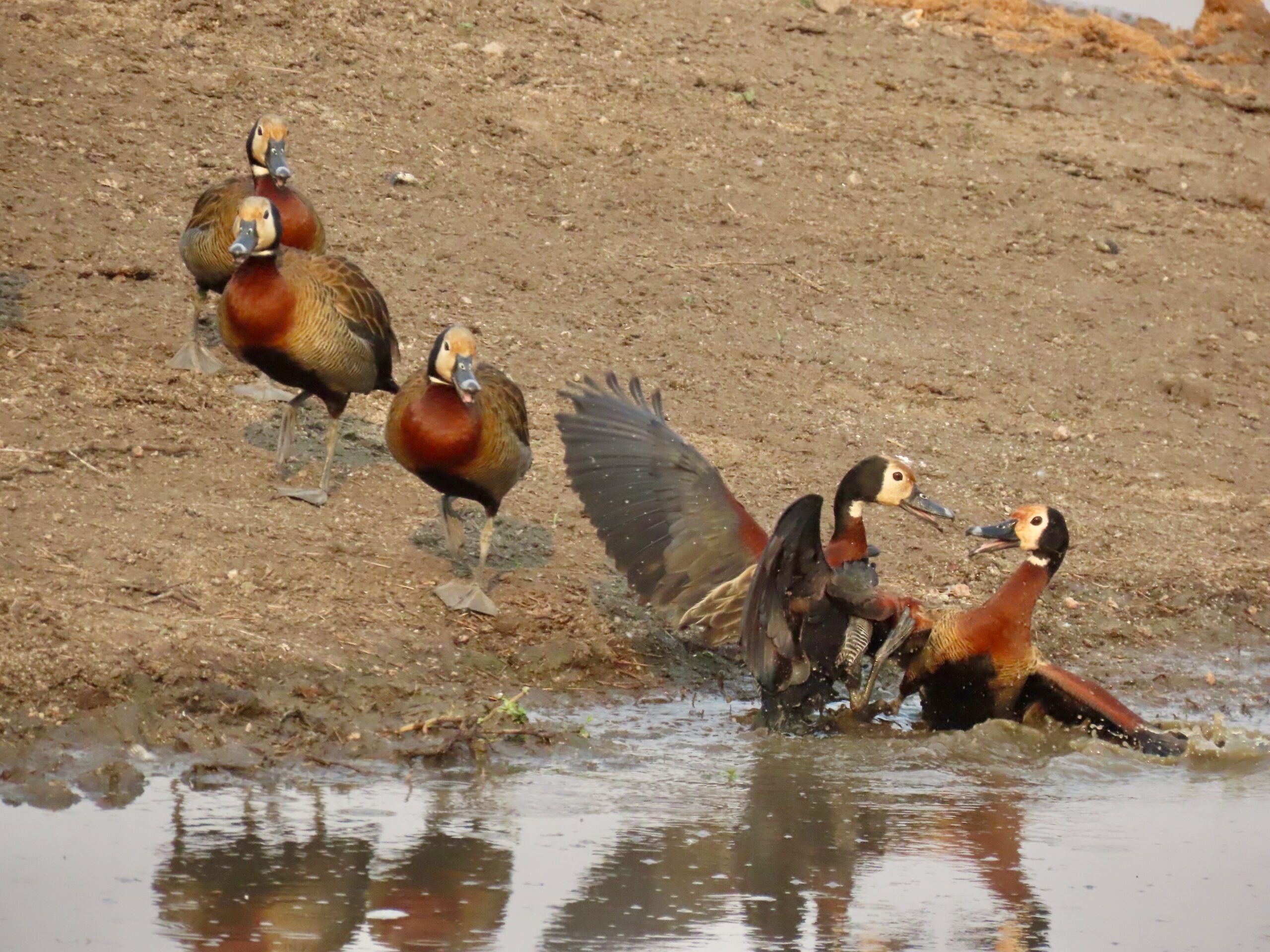 Suddenly, two male ducks started squabbling, flapping up into the air to dive-bomb one another, squawking noisily all the time.