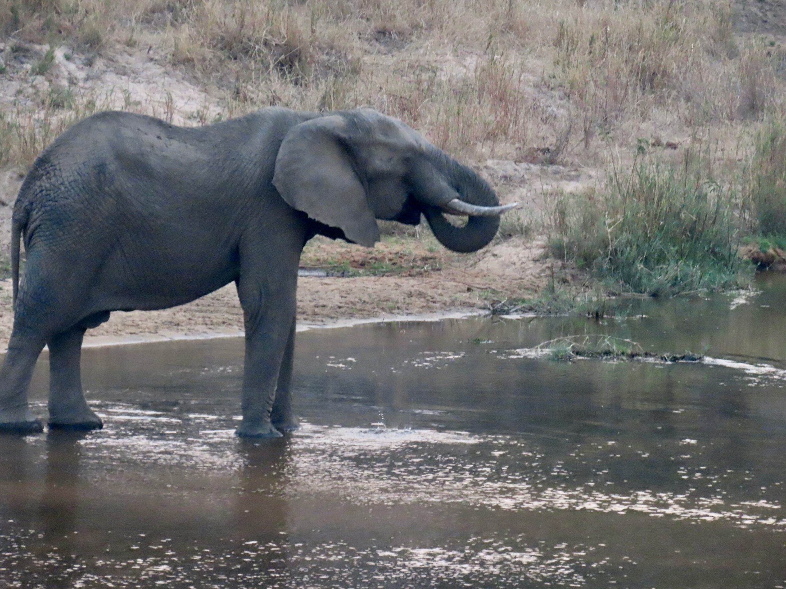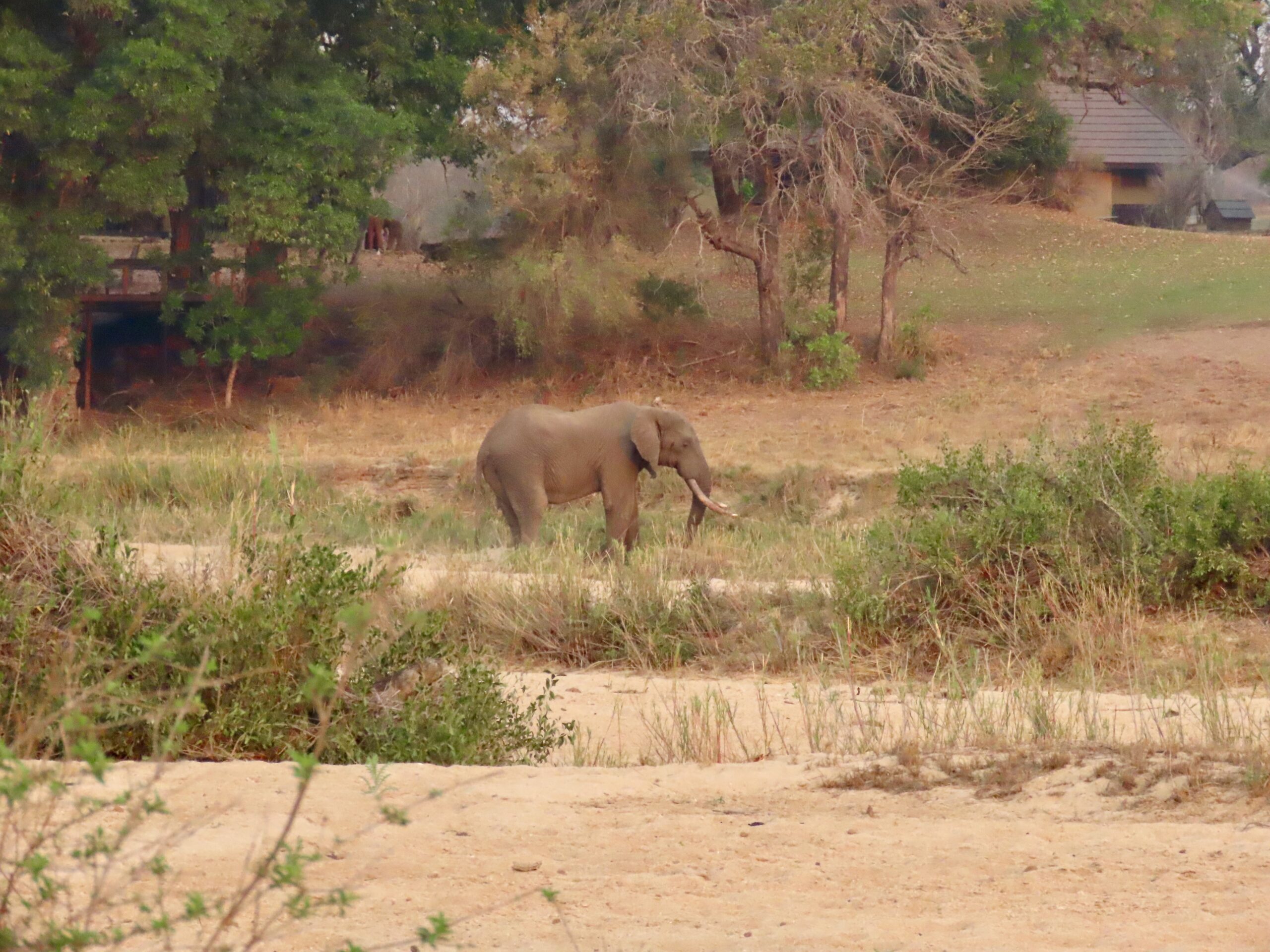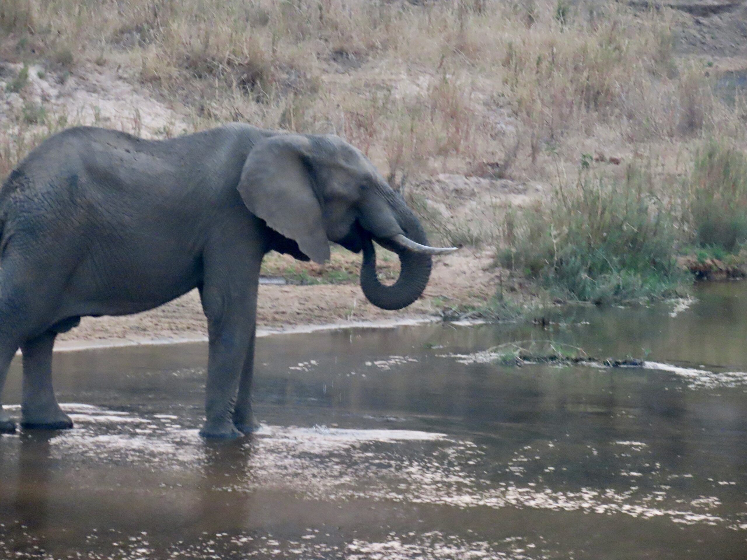 Two large bull elephants passed within 2 feet of the vehicle as we headed back in the dusk. Mike also spotted a scrub hare in the dark – swinging a lamp side-to-side finding a lump in the dark that he somehow recognizes as a critter. (Note that lamps are never used on diurnal animals, since their eyes react differently, causing them to freeze in fear.)