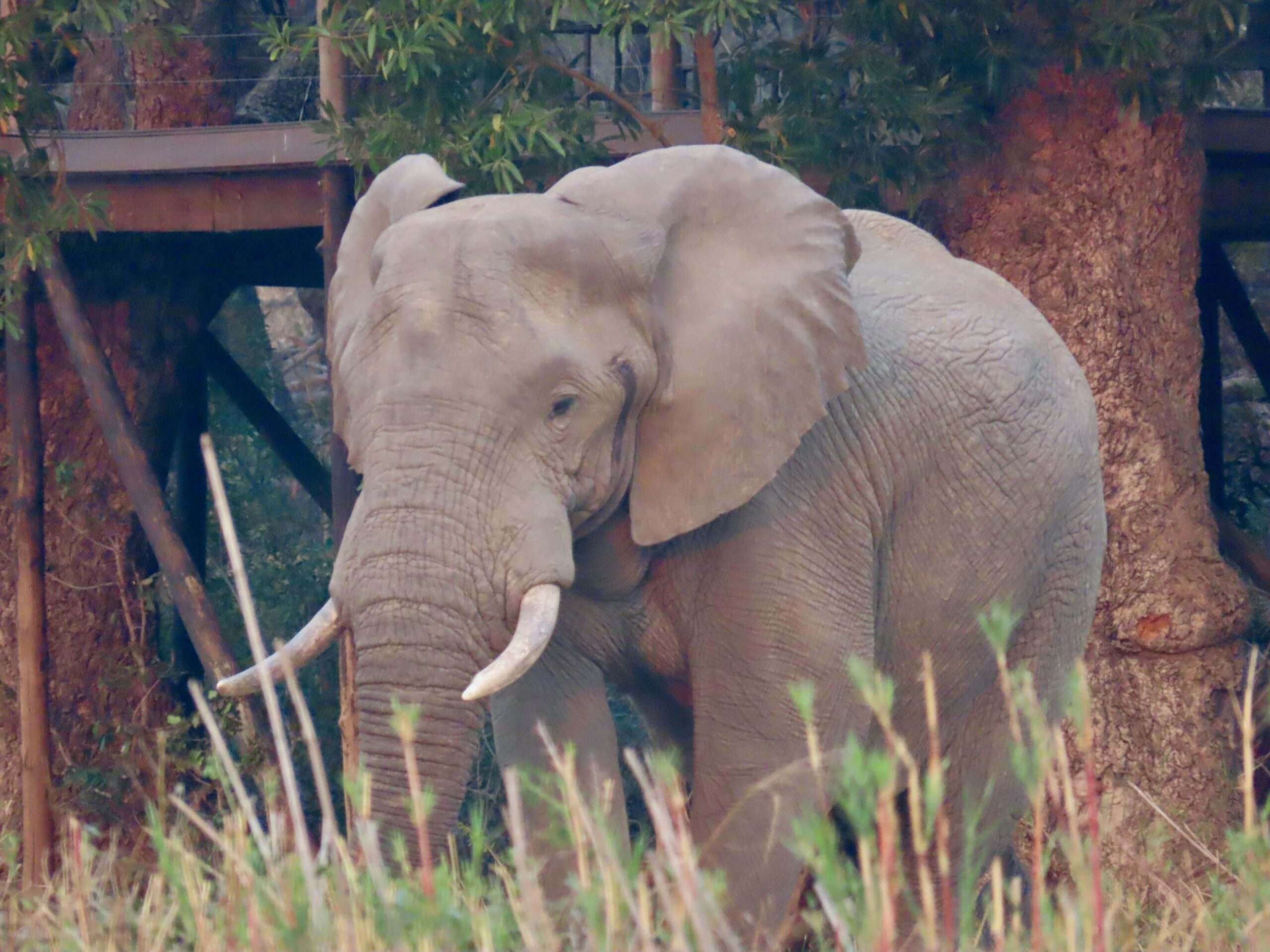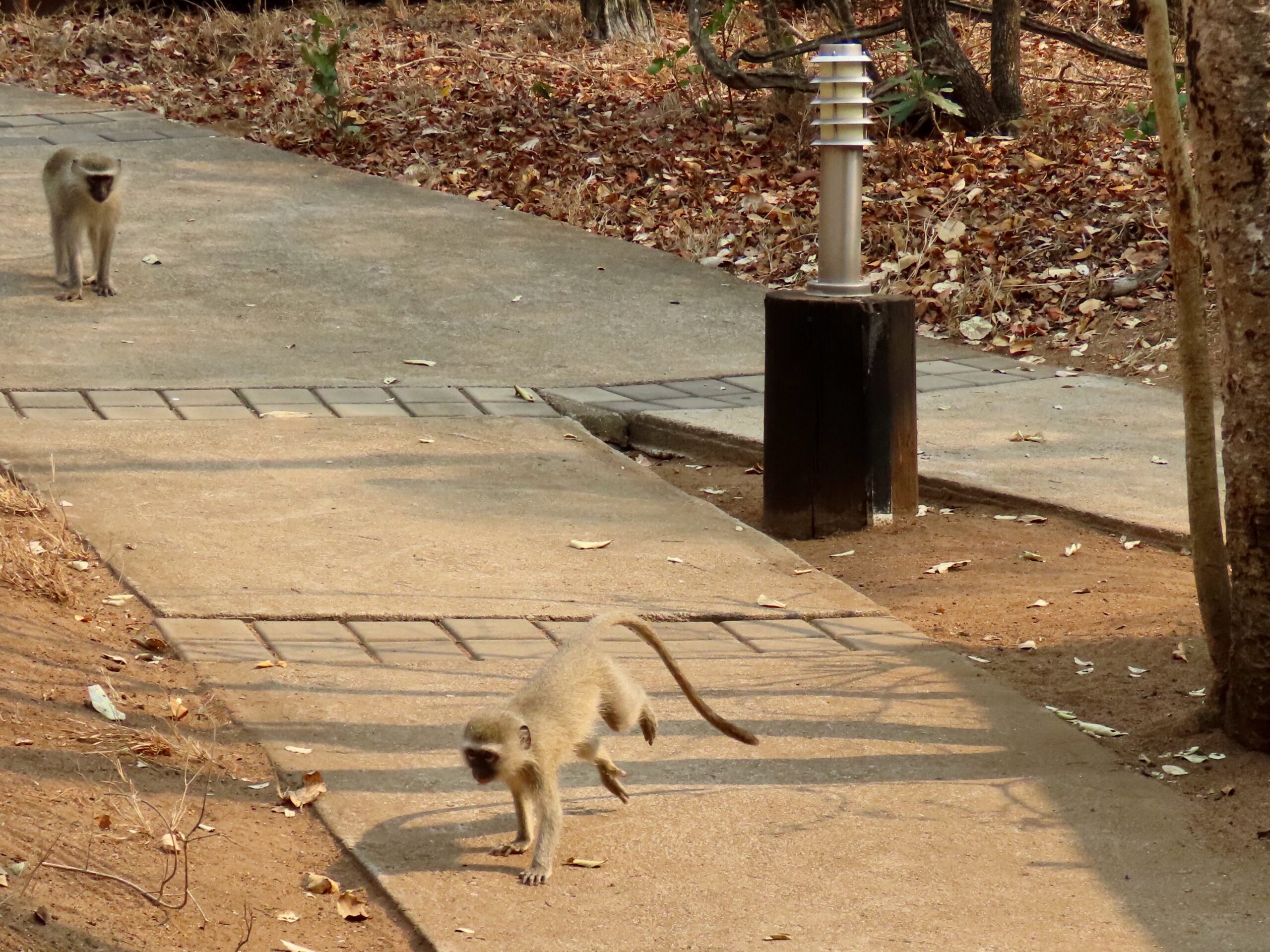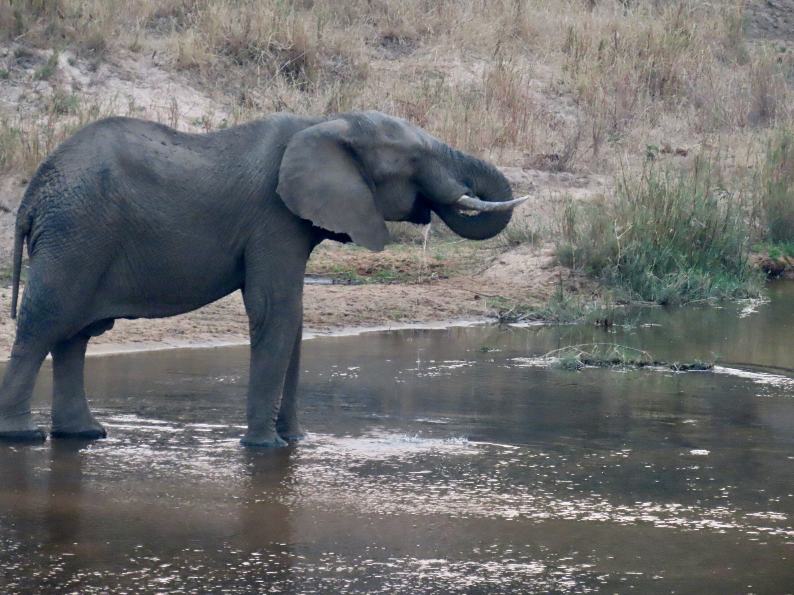 Two large bull elephants passed within 2 feet of the vehicle as we headed back in the dusk. Mike also spotted a scrub hare in the dark – swinging a lamp side-to-side finding a lump in the dark that he somehow recognizes as a critter. (Note that lamps are never used on diurnal animals, since their eyes react differently, causing them to freeze in fear.)