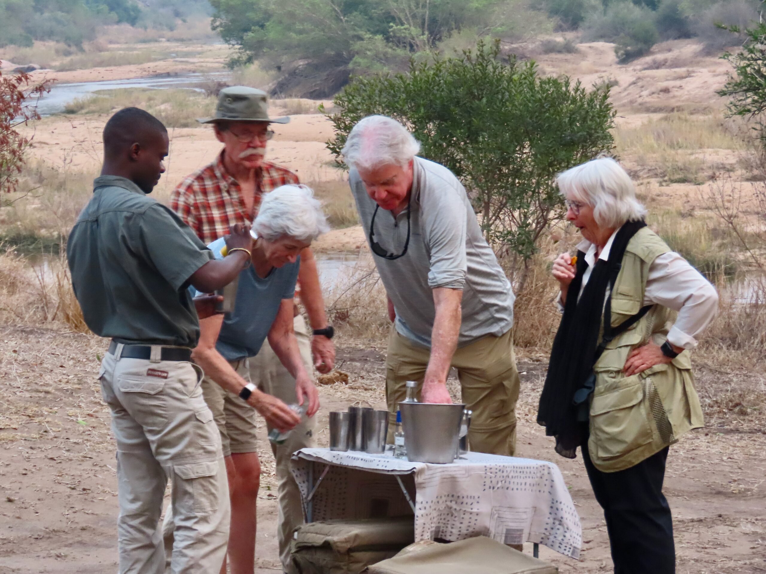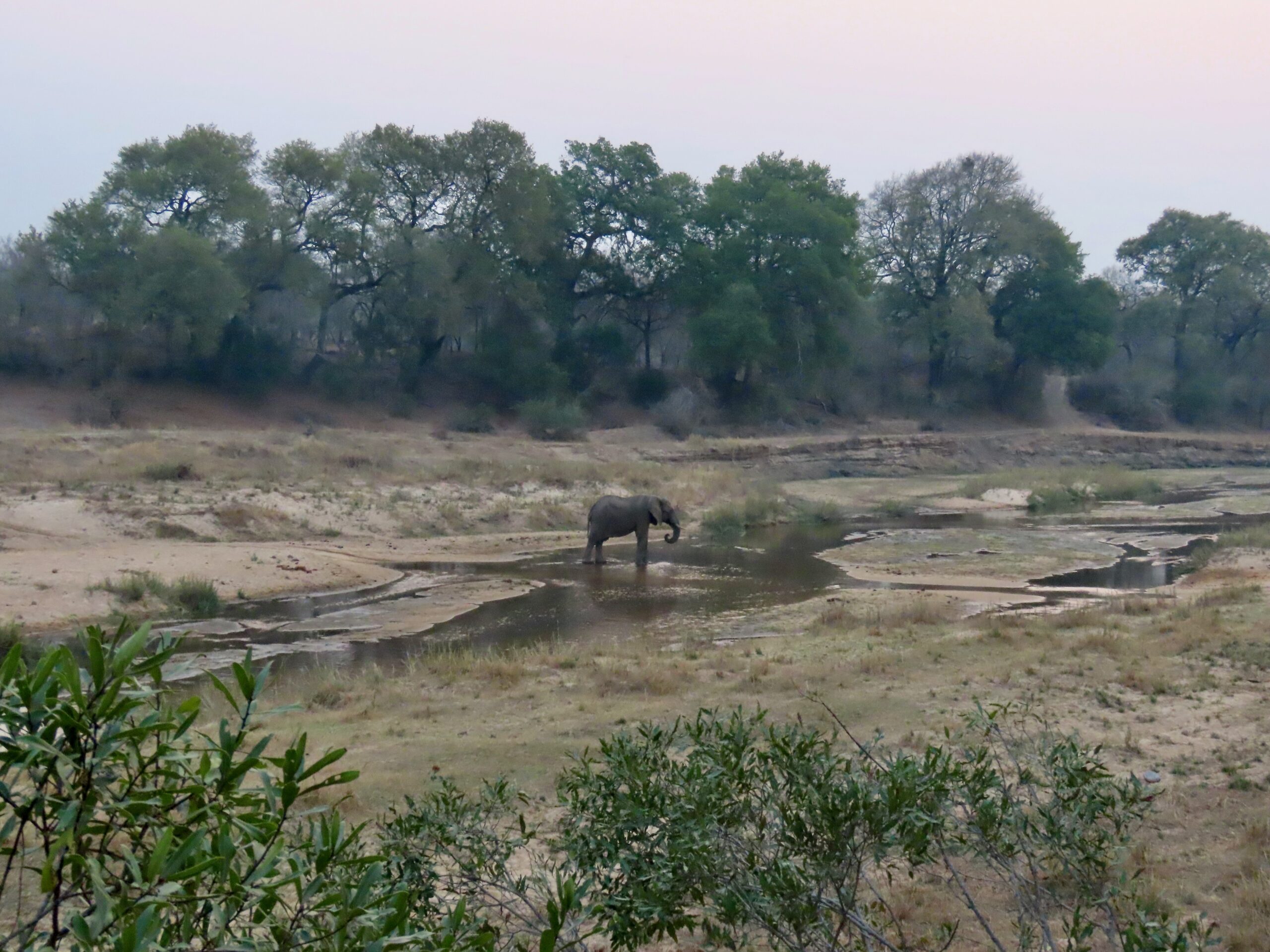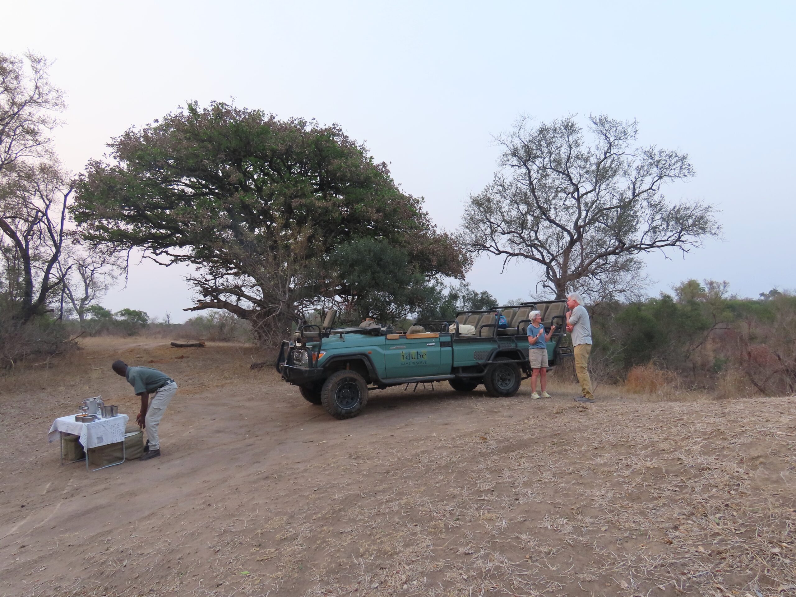 By Wednesday morning, we had the routine down: collected from our chalets like goslings at 5:30 am and escorted to the lounge for a quick hit of beverages and muffins. Into the safari vehicle by 6am to greet dawn in the bush. About 4 hours hacking around looking for wildlife (broken by a “coffee stop” for more beverages and cookies), then back to camp for an (enormous) breakfast ~ 10am.