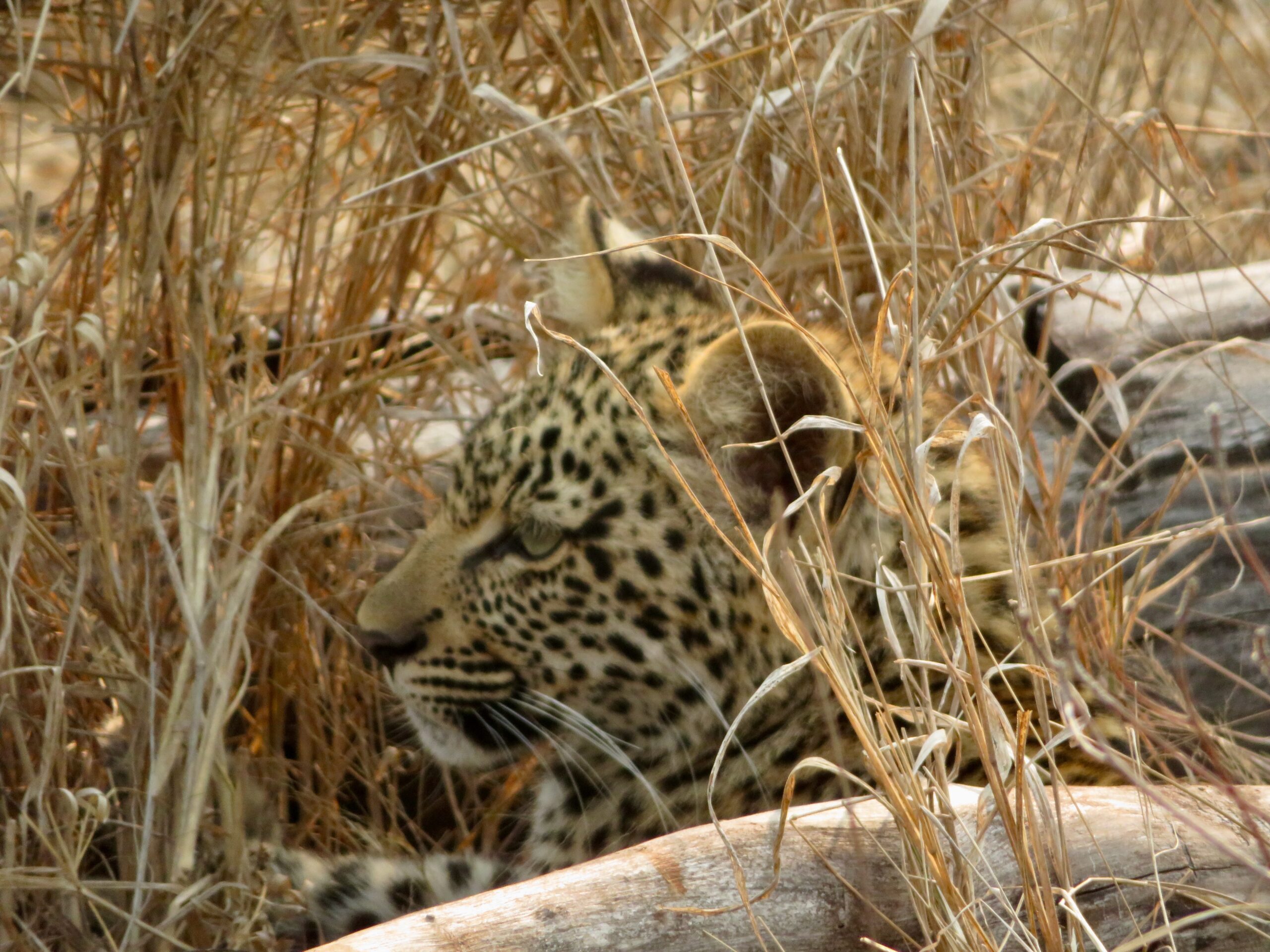 The leopardess was finally spotted walking through the brush and followed to the spot were she had stashed her cubs along with breakfast – half a duiker carcass from yesterday’s kill.