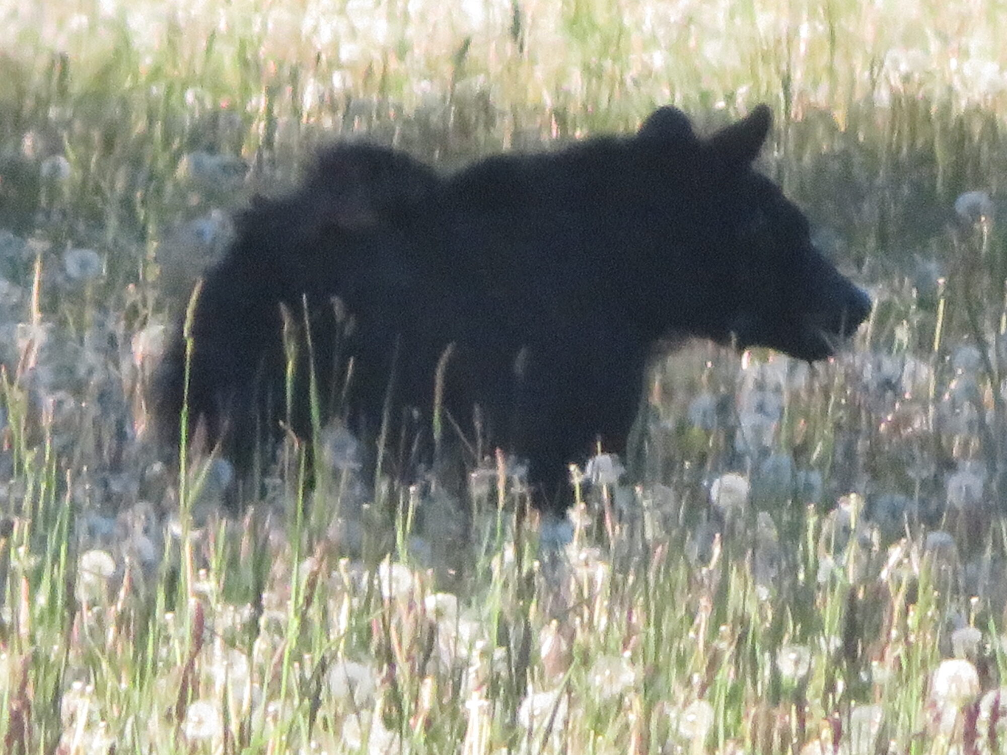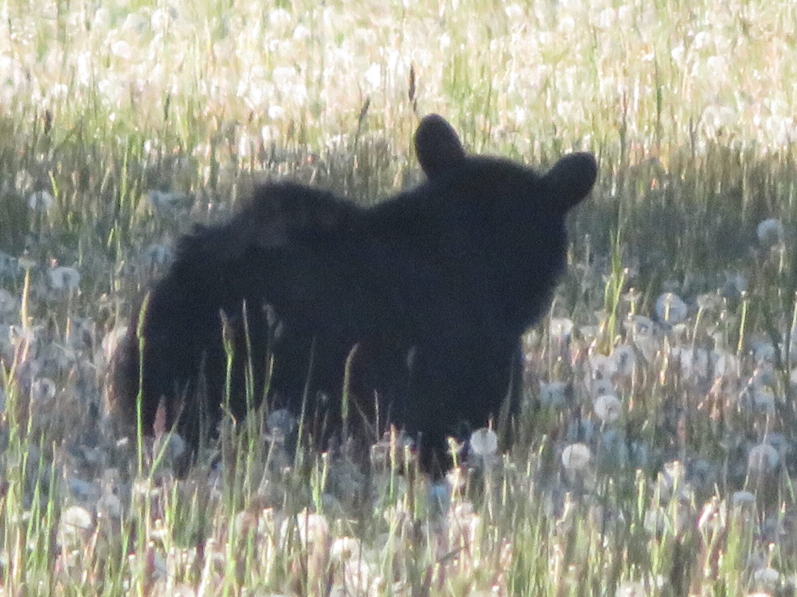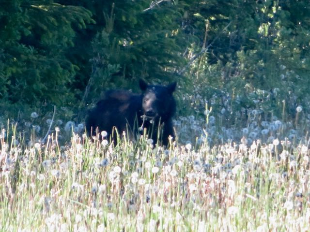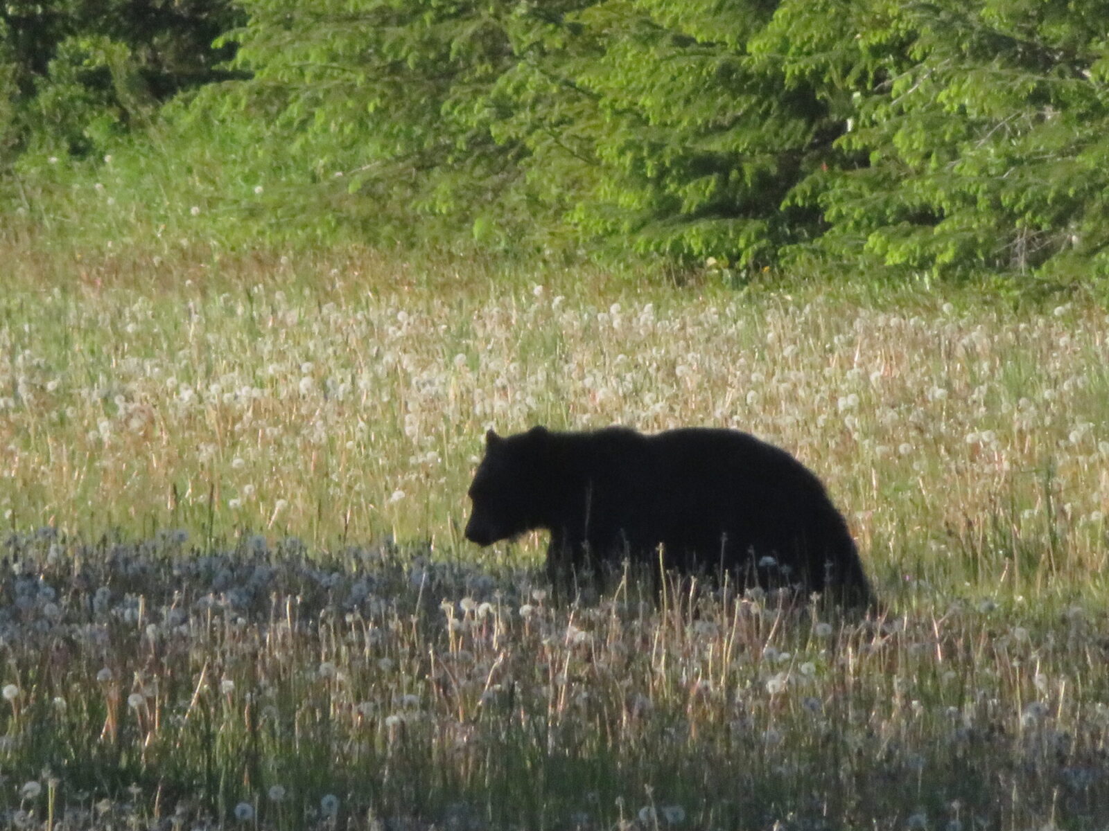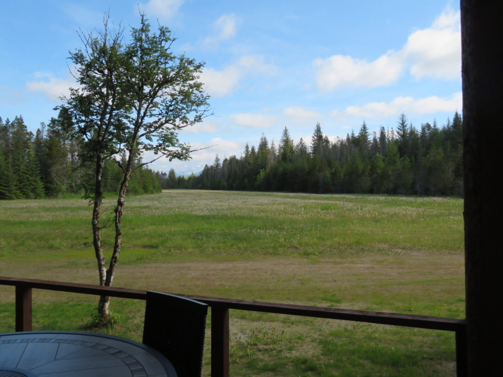 One lovely feature was this deck overlooking a meadow (formerly an airplane landing strip) filled with wild strawberries. We were told that the meadow gets a lot of wildlife visitors, and we were fortunate to see a little black bear bear munching in the meadow on our next-to-last day.Â
