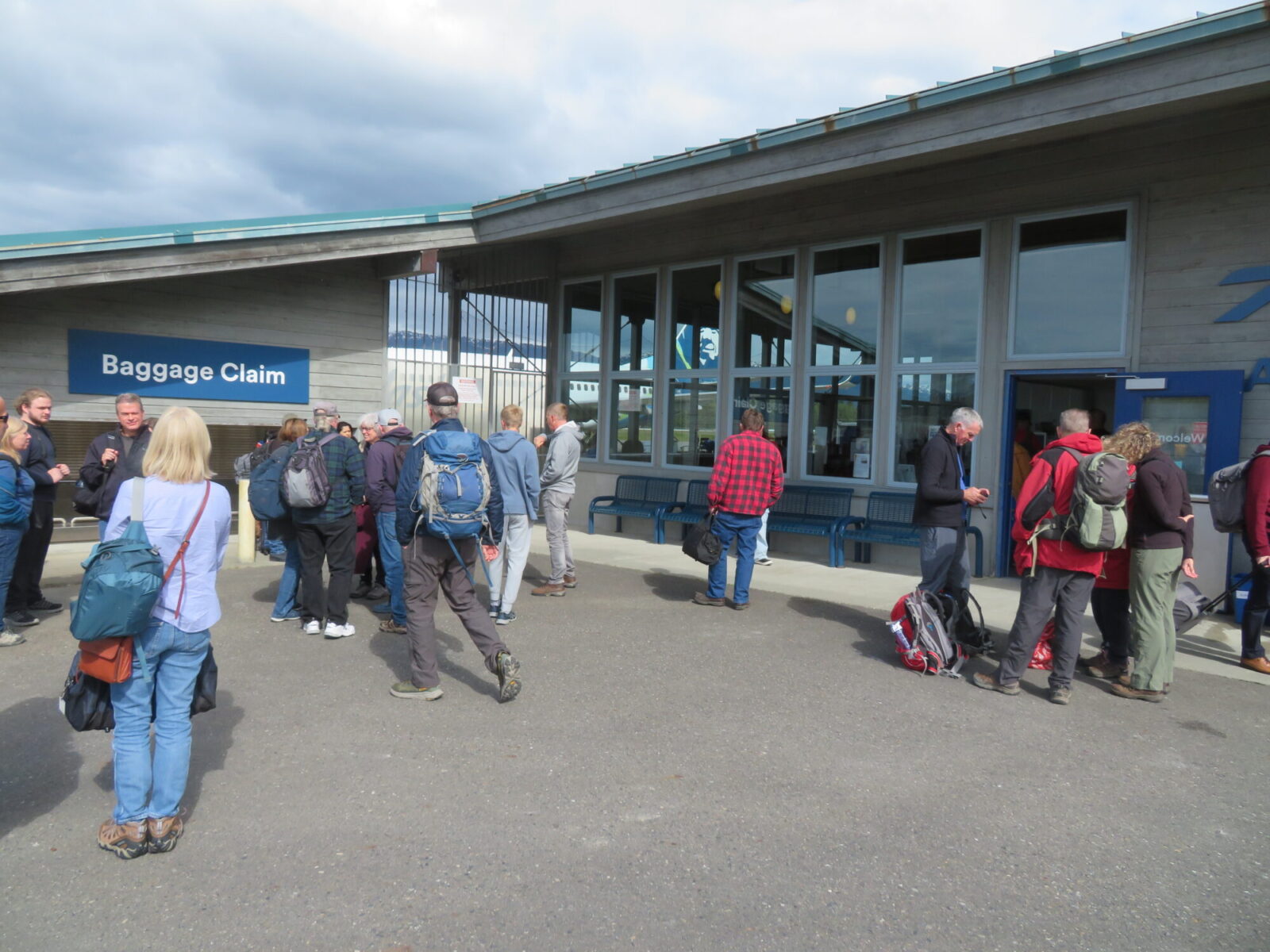 We had originally booked the ferry from Juneau to Gustavus, a six hour voyage through what looked to be beautiful waters. But the ferry company cancelled that day’s boat (and only that day’s boat) so we had to rebook on Alaska Air. In-the-air time for this flight was 12 minutes – less time than it took the crew to go through the safety briefing. The plane had the feel of a commuter bus, with locals greeting one another and catching up on gossip. One woman brought a 50 pound bag of Costco dog food on board as her carry-on.