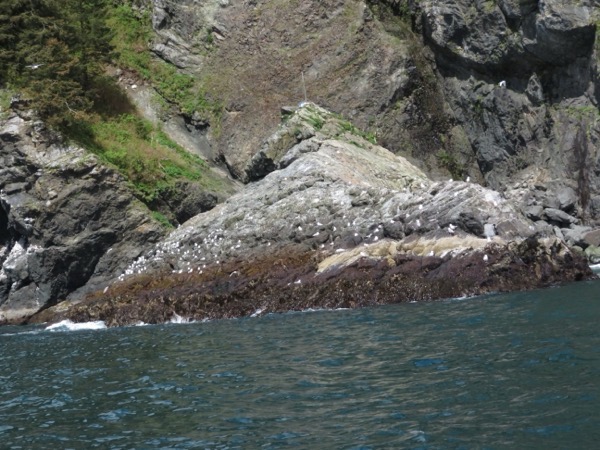 Our 3+hour tour (cue Gilligan’s Island theme) took us cove-hopping down the west side Resurrection Fjord past Callisto Head for a glimpse of Bear Glacier (part of the Harding Icefield), and east across the inlet to islands and cliffs with seabirds nesting, then turning north to return to the Seward harbor.