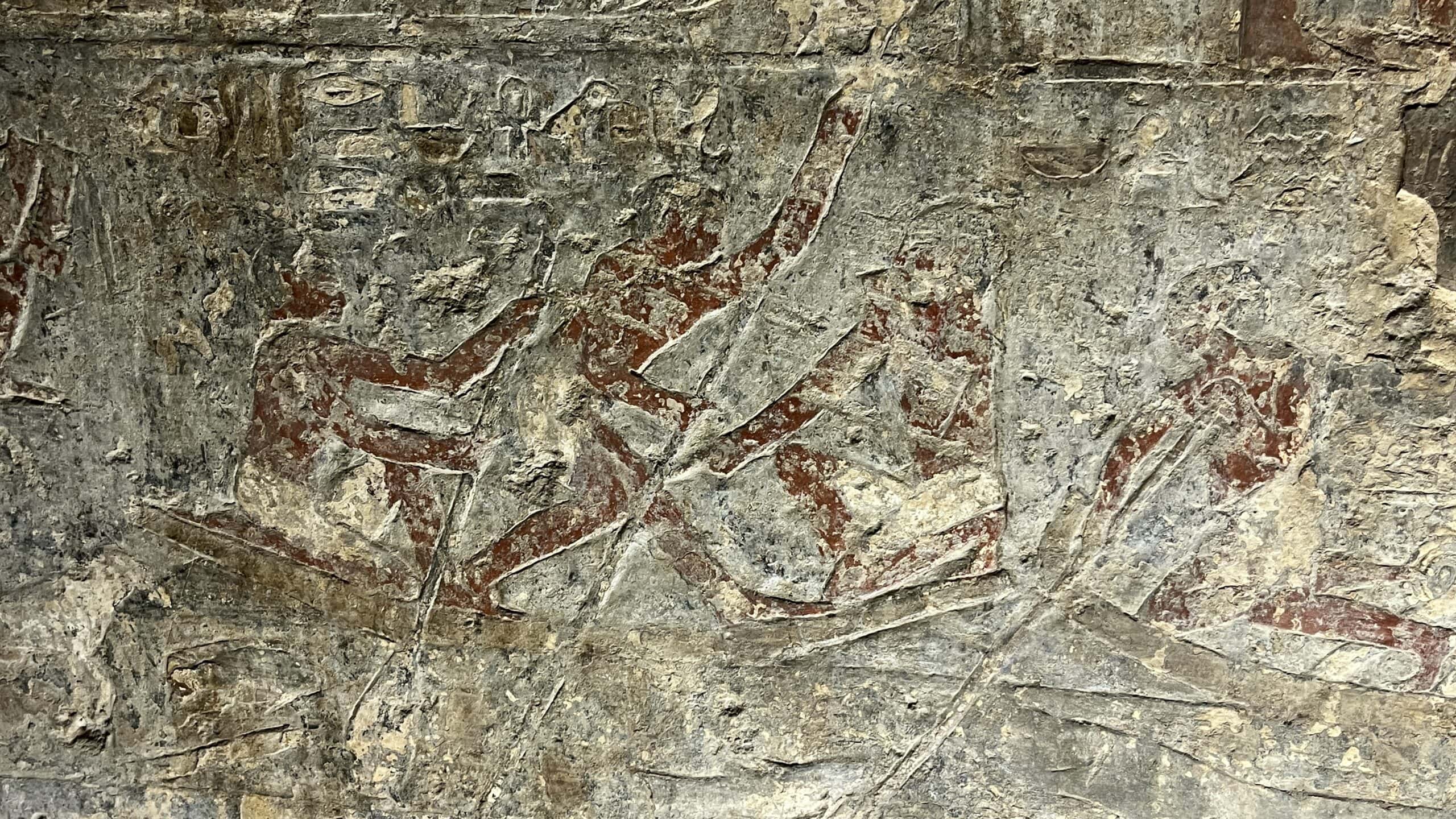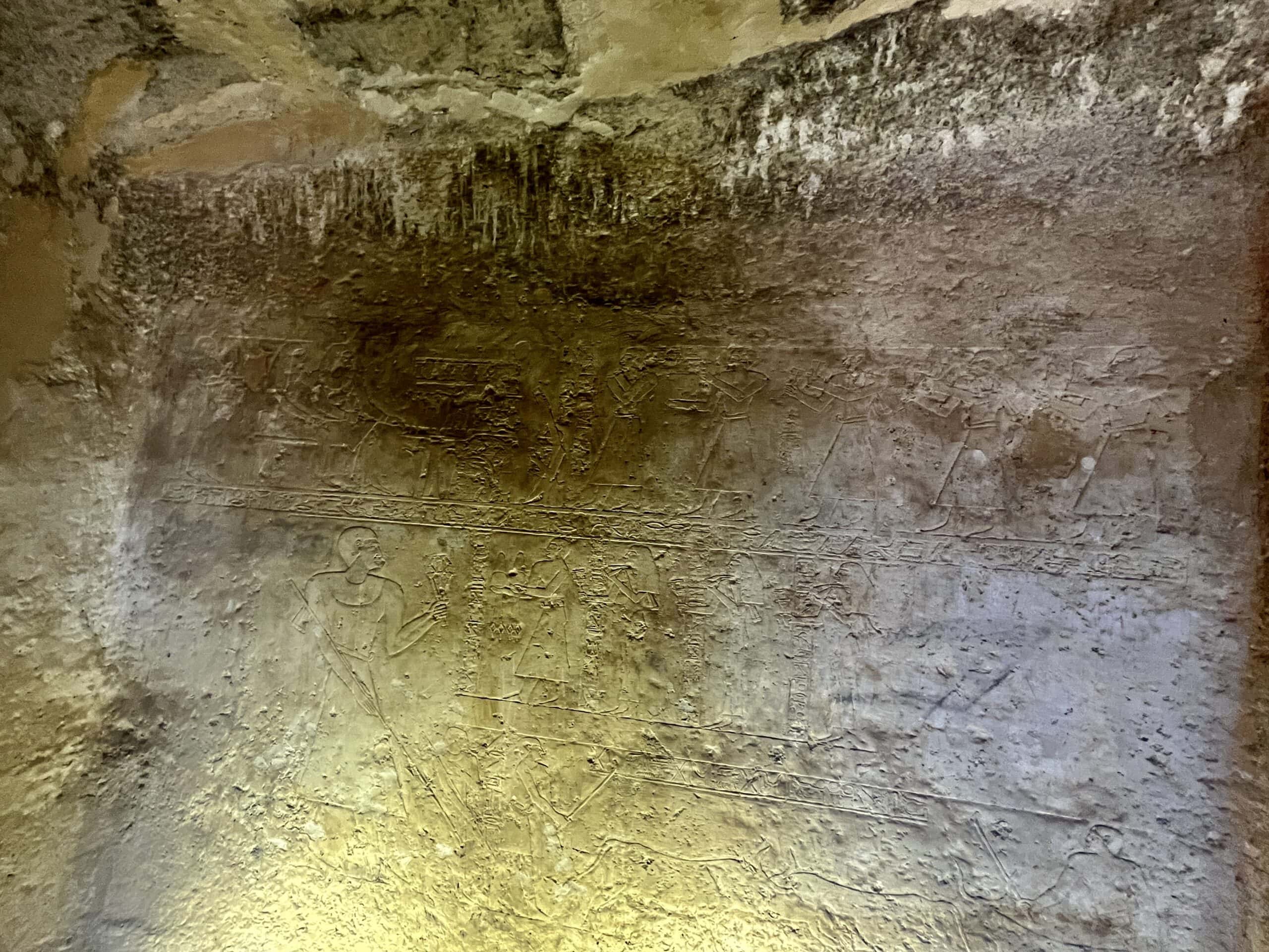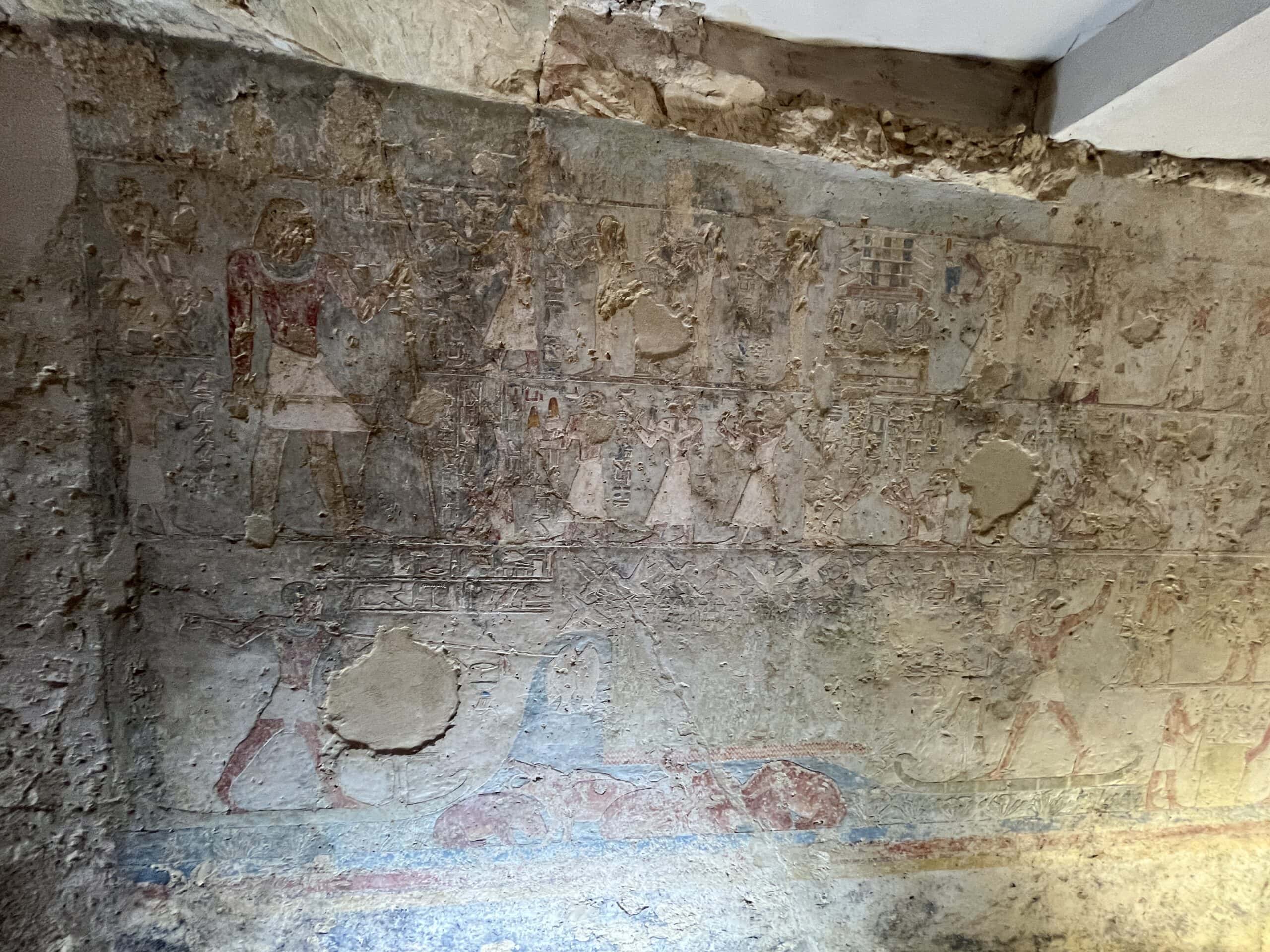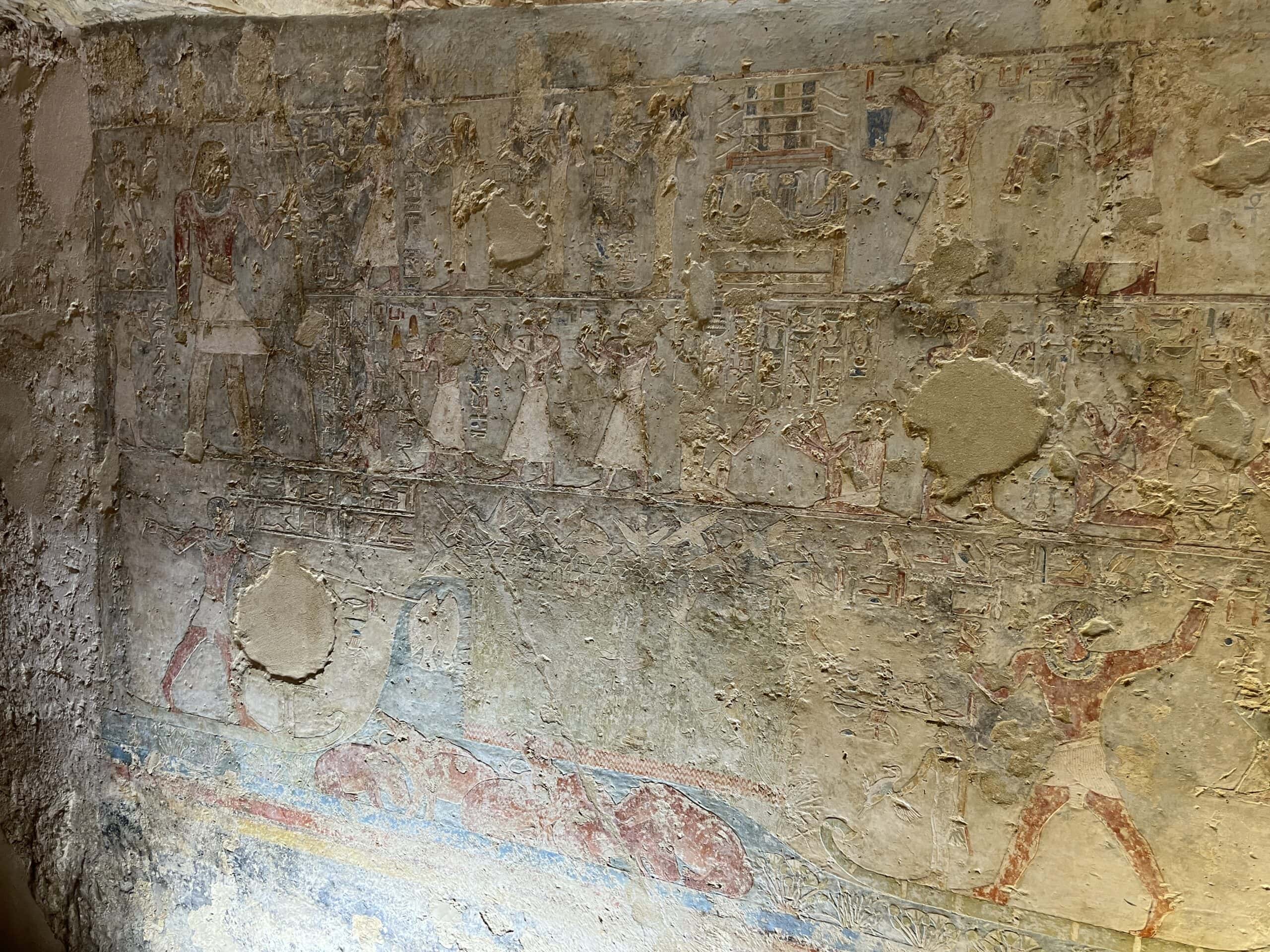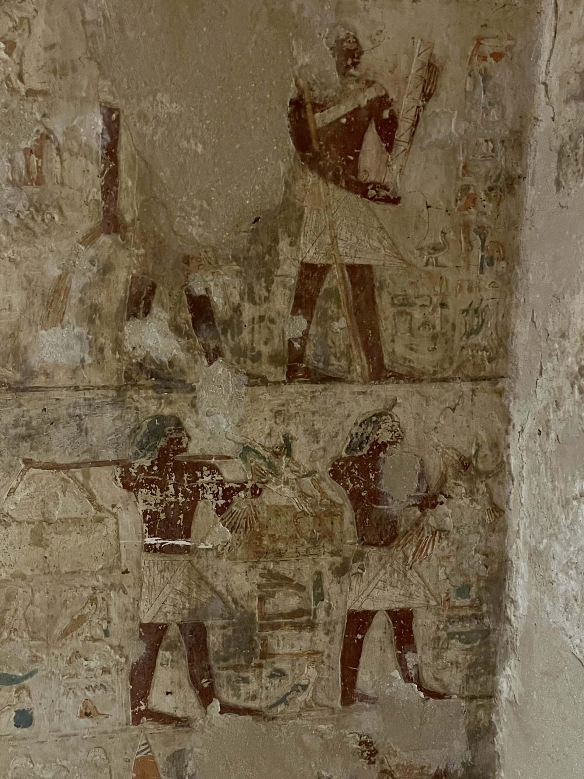 The chapel walls are decorated with both paintings and low reliefs. One wall closely mirrors the “fishing in the marshes” scene from the mastaba of Mereruka, including a crocodile lurking below the papyrus boat and species-specific images of Nile fish.