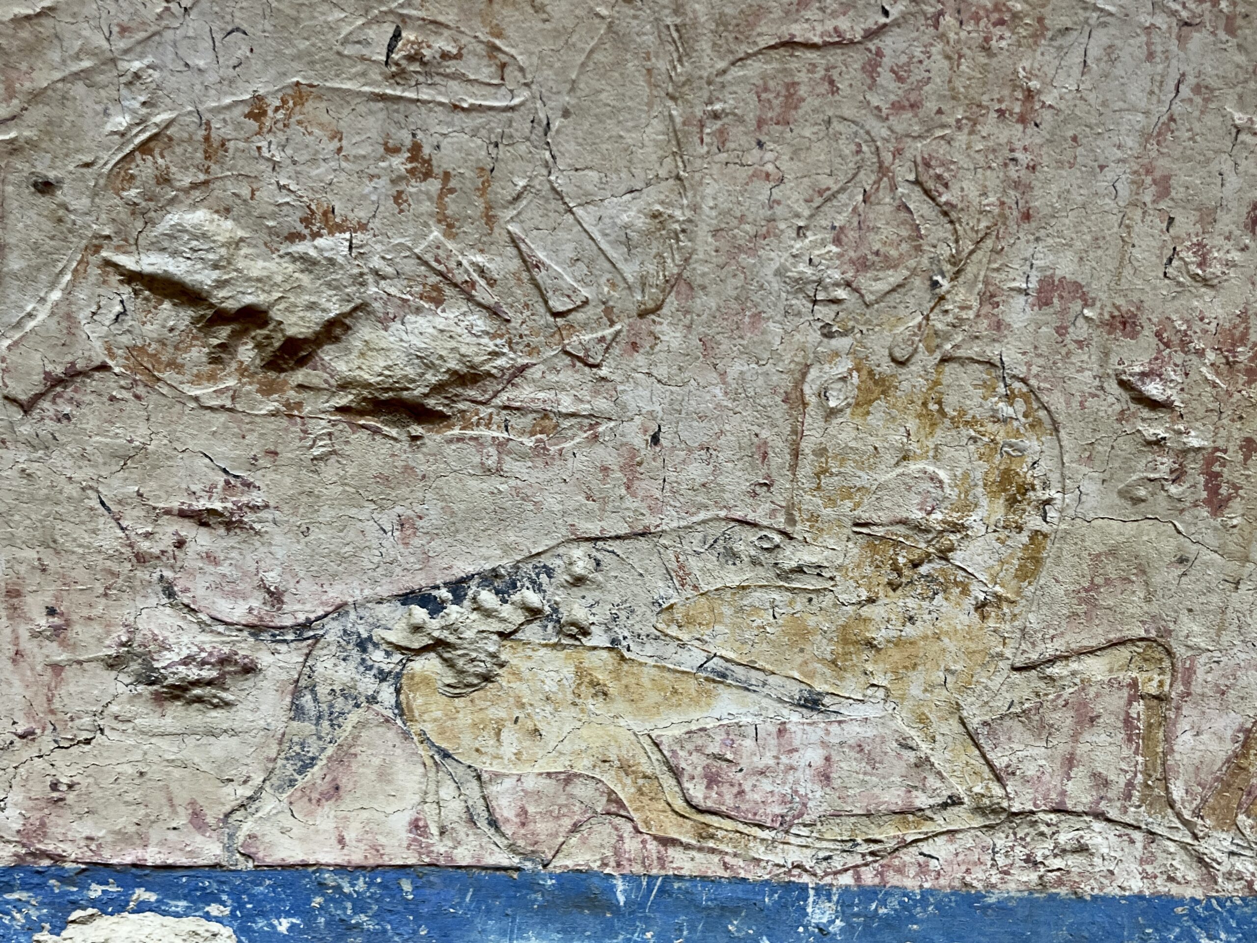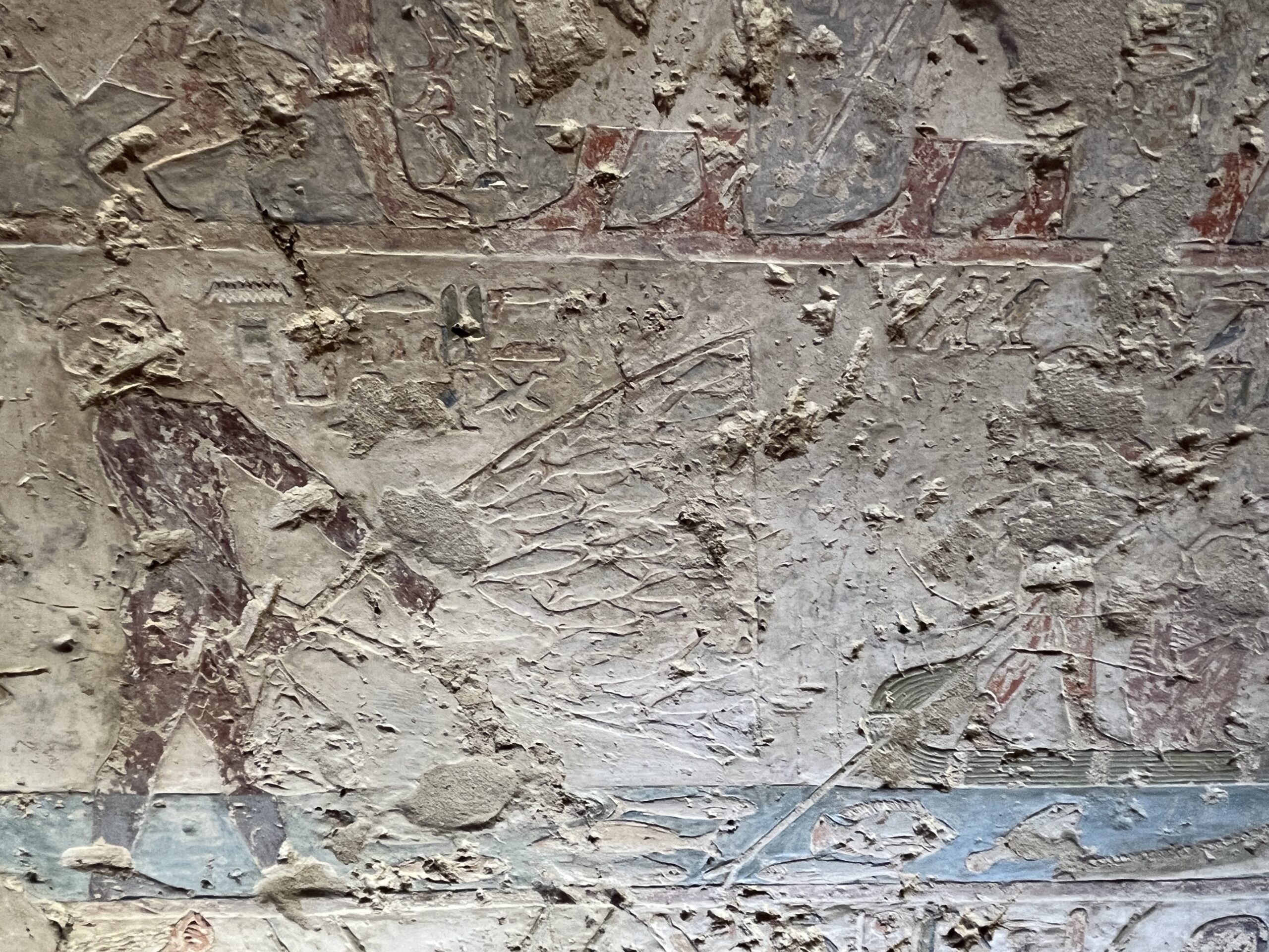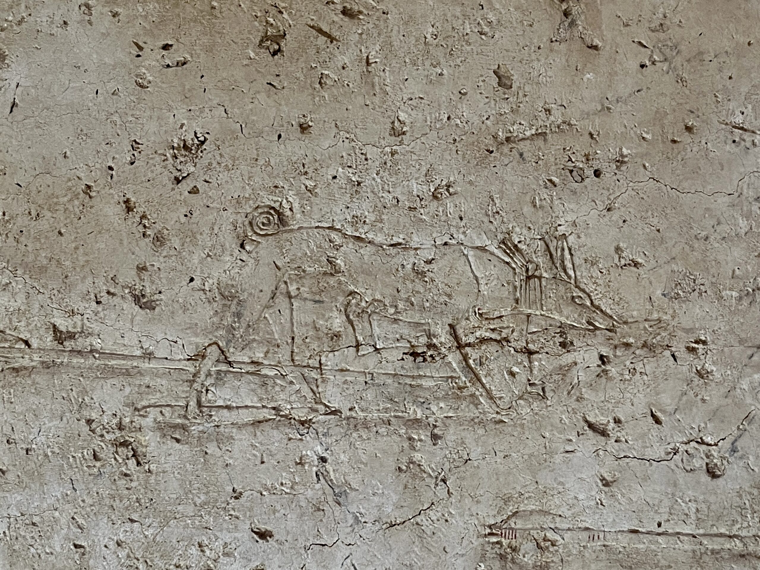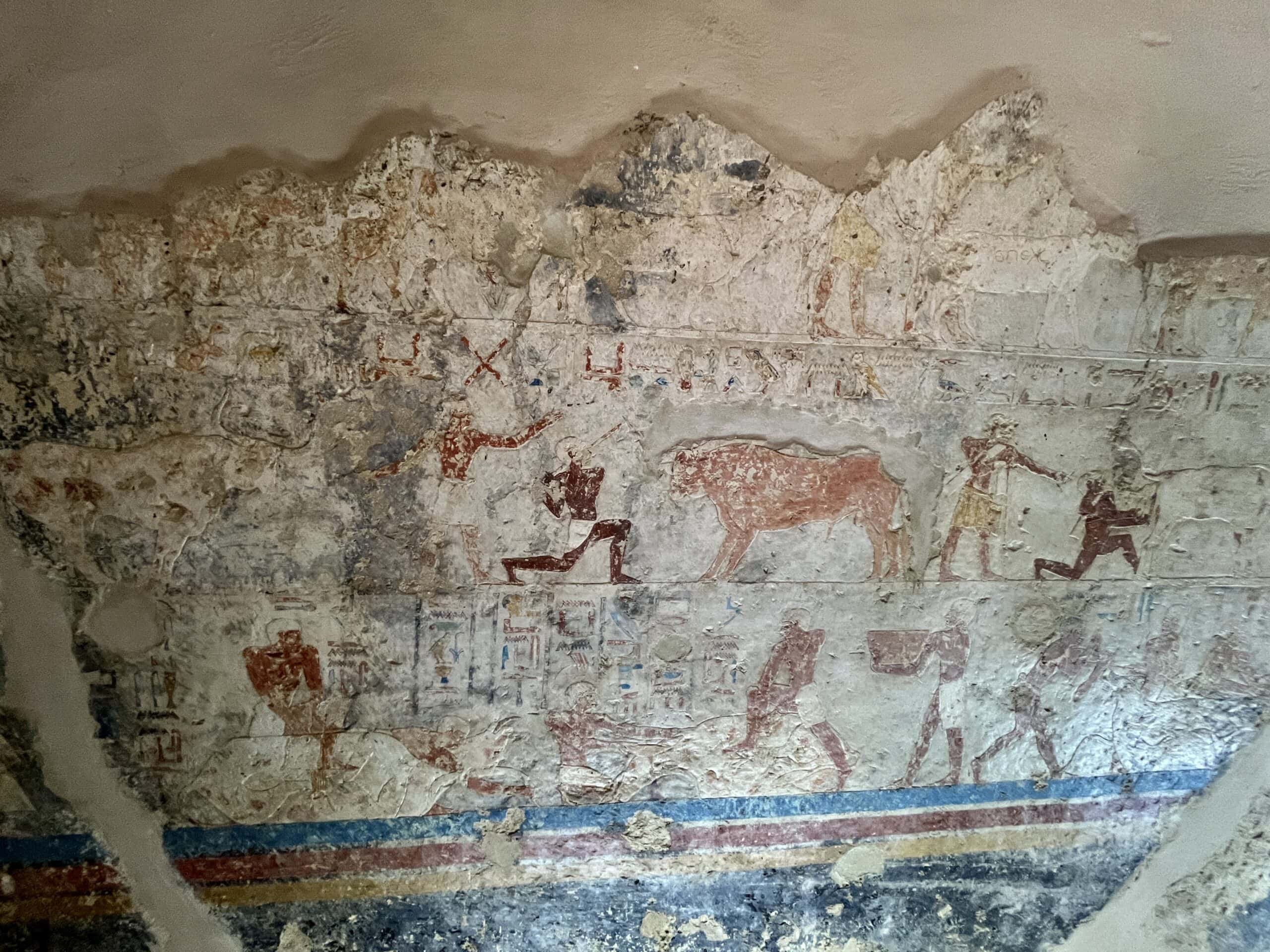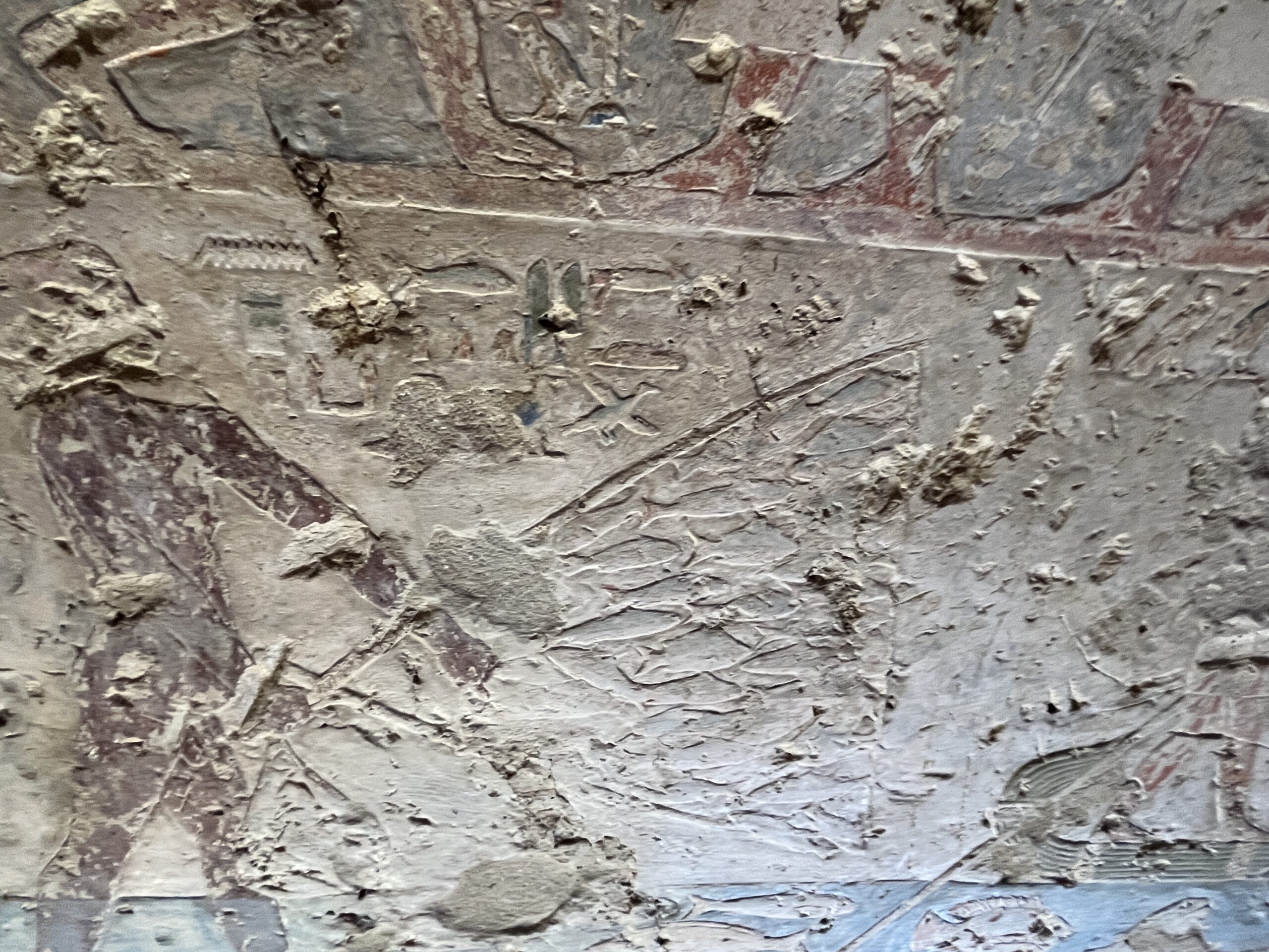 The chapel walls are decorated with both paintings and low reliefs. One wall closely mirrors the “fishing in the marshes” scene from the mastaba of Mereruka, including a crocodile lurking below the papyrus boat and species-specific images of Nile fish.