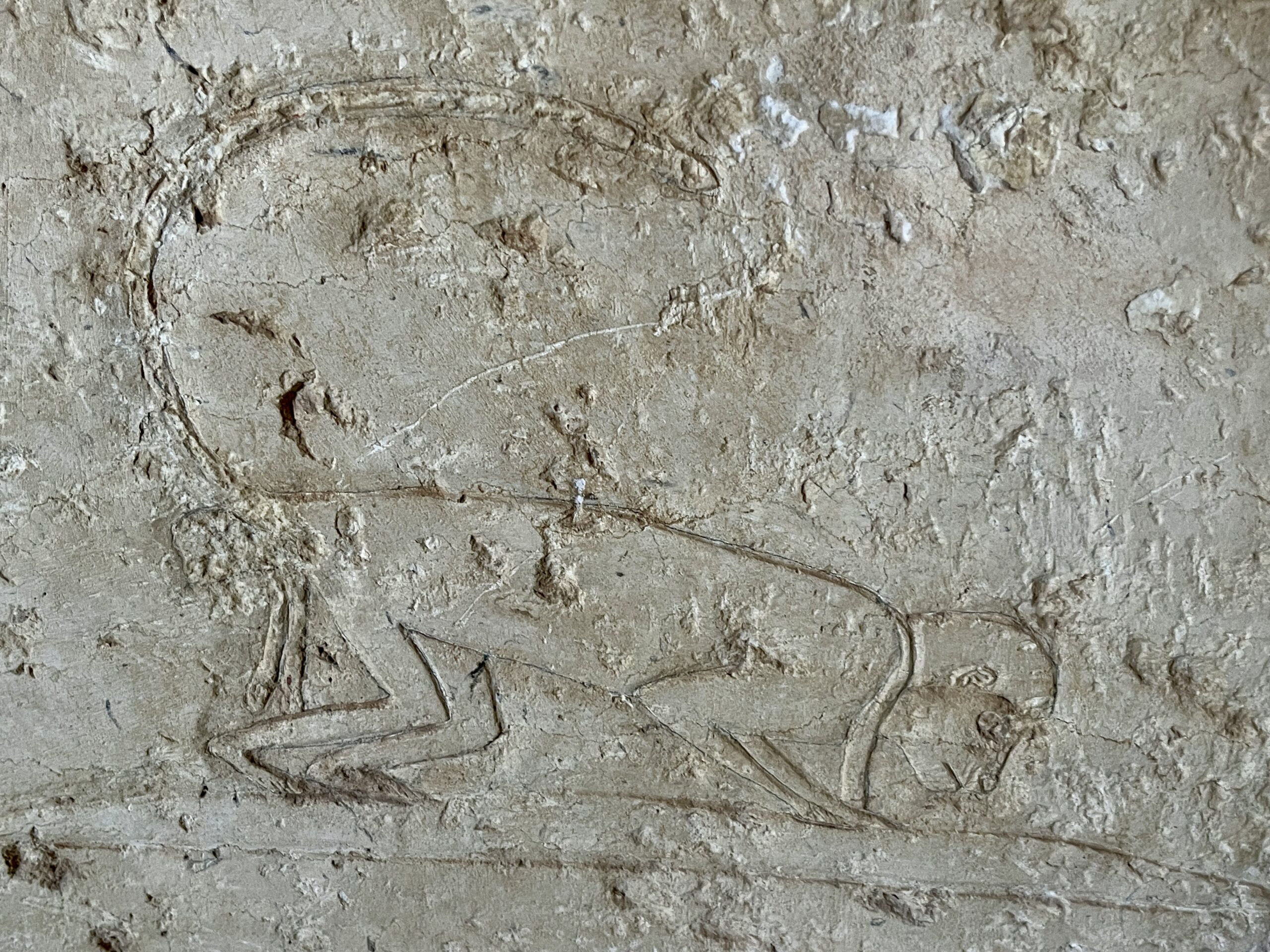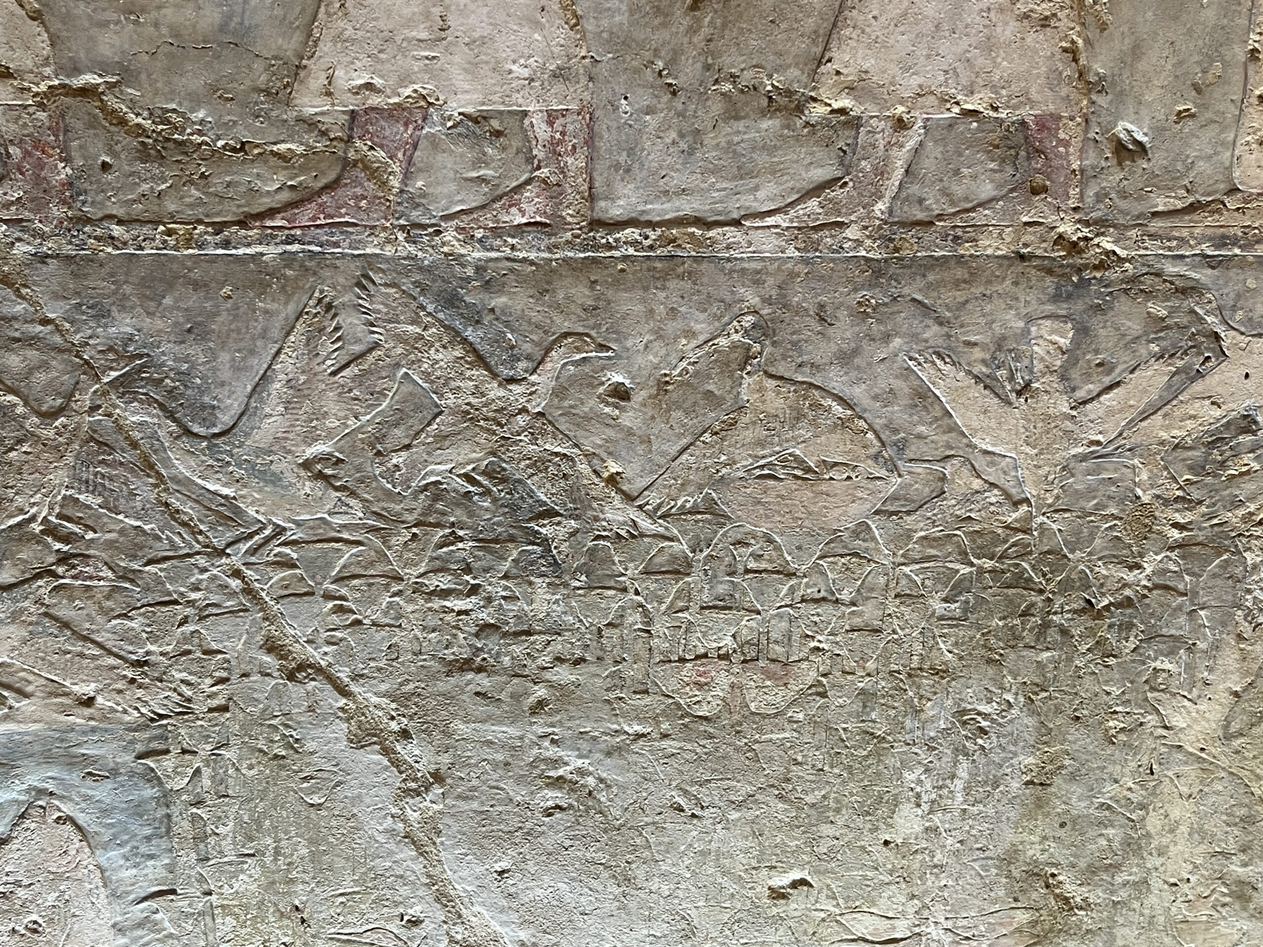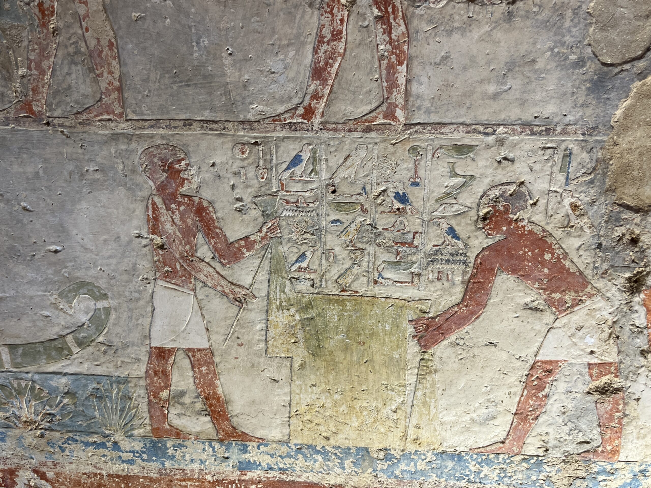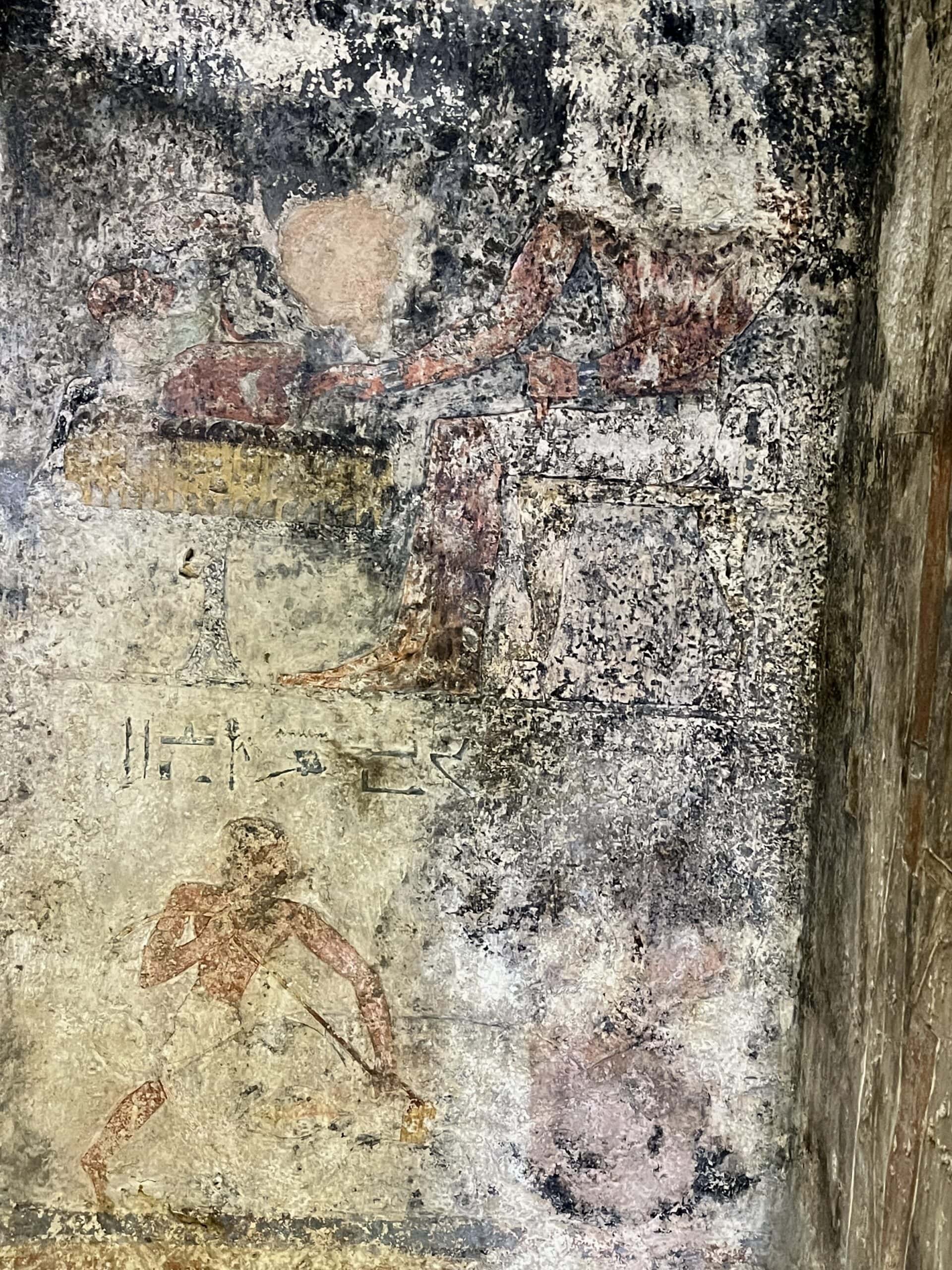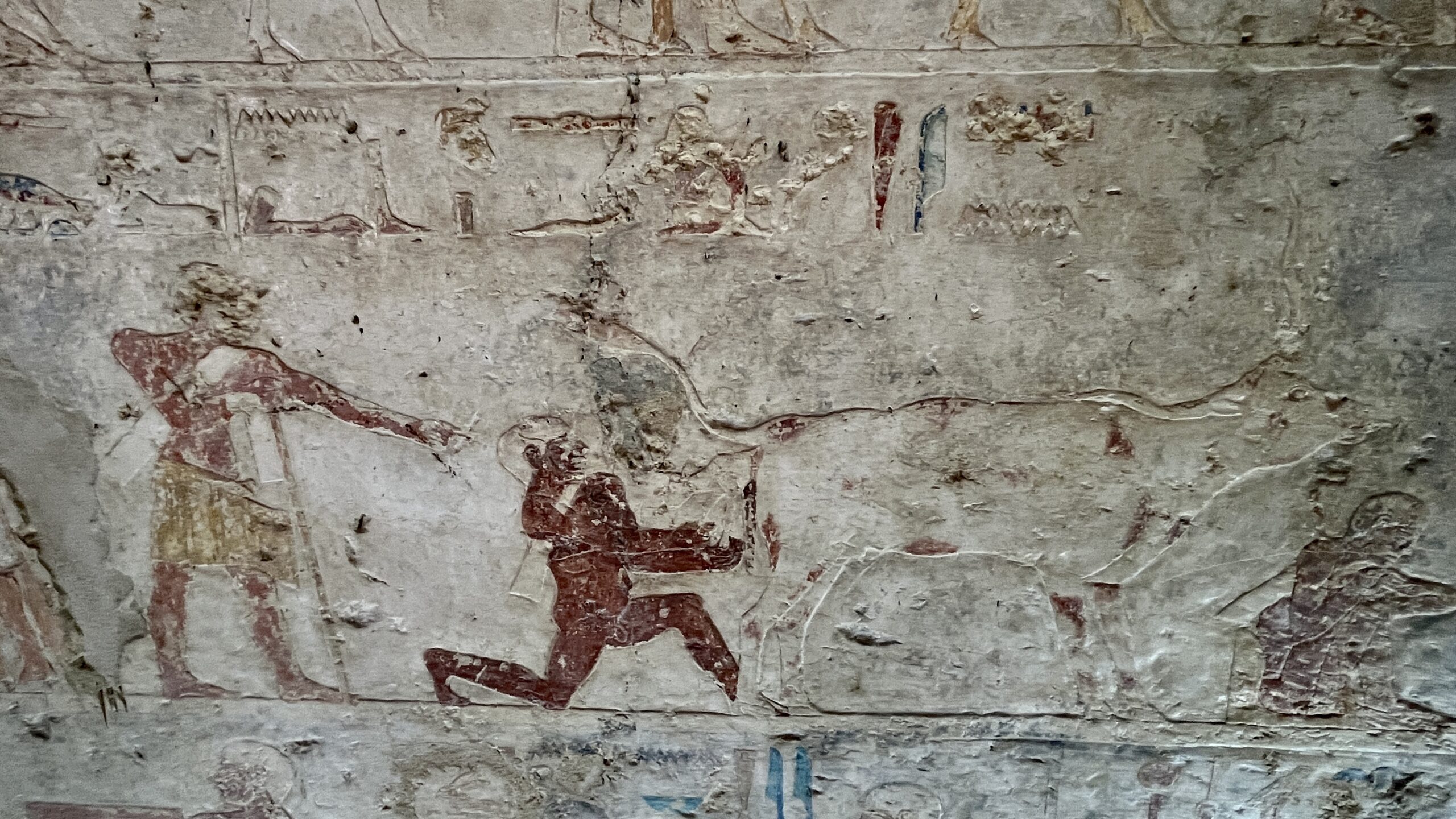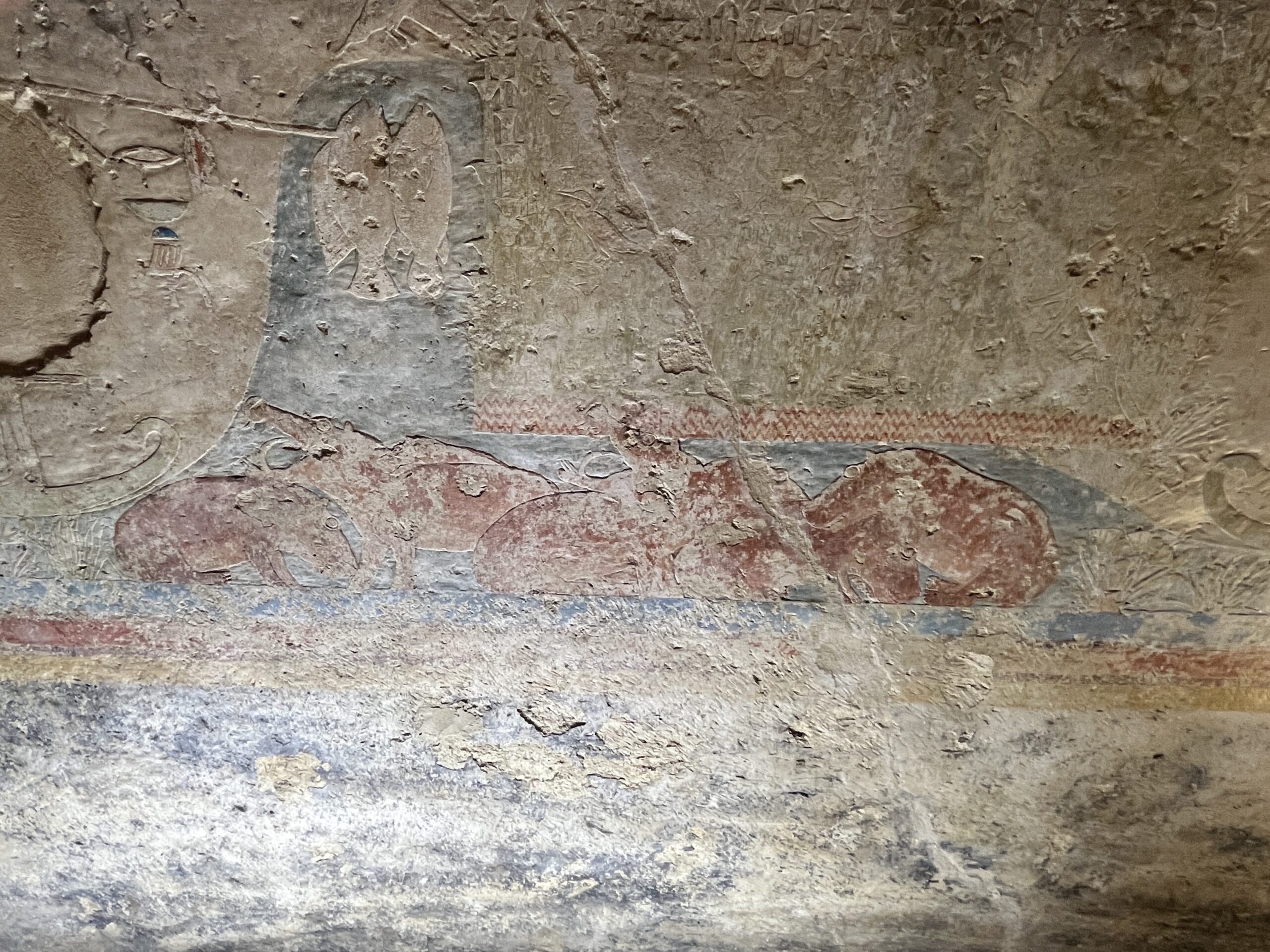 The chapel walls are decorated with both paintings and low reliefs. One wall closely mirrors the “fishing in the marshes” scene from the mastaba of Mereruka, including a crocodile lurking below the papyrus boat and species-specific images of Nile fish.