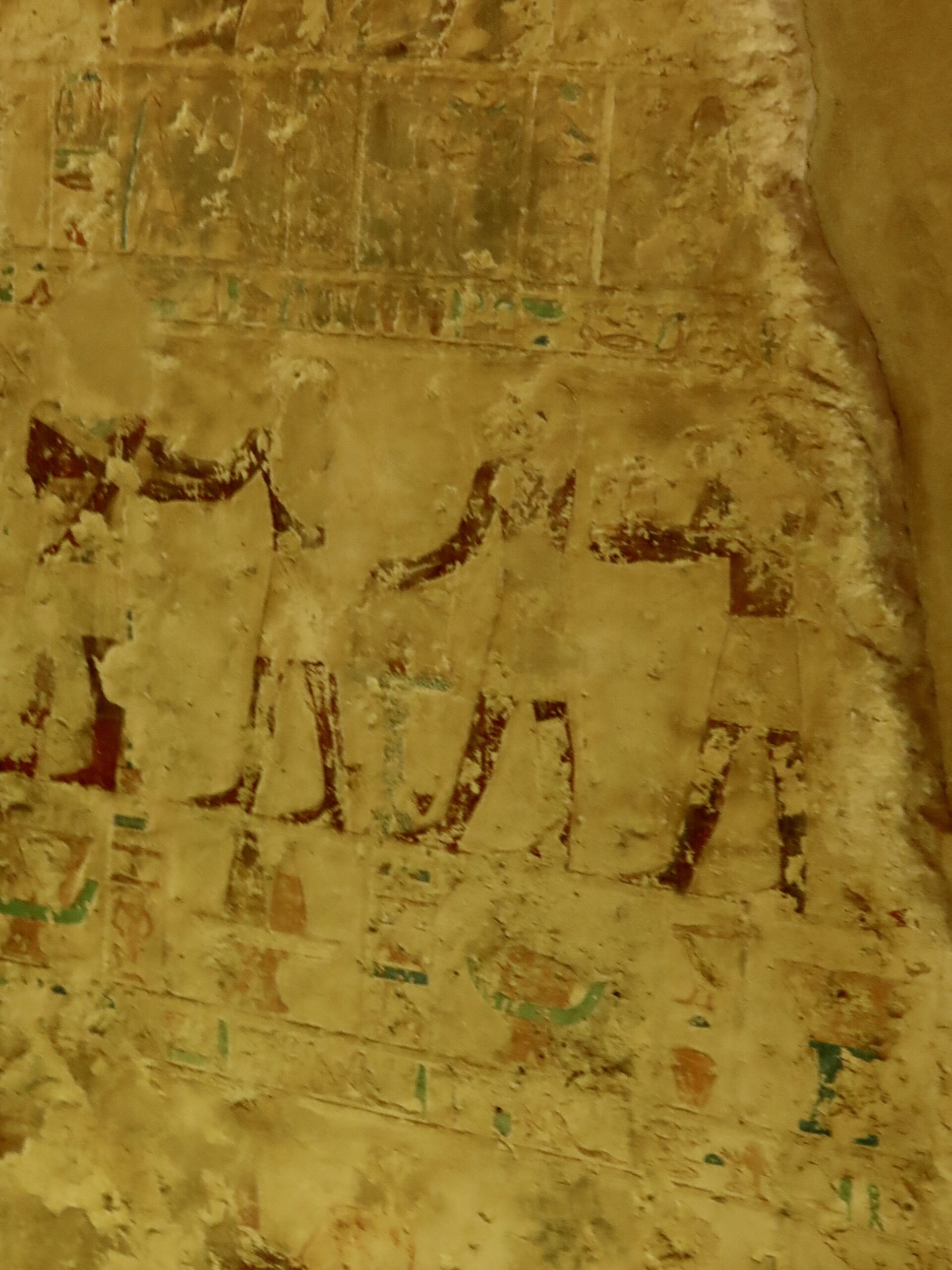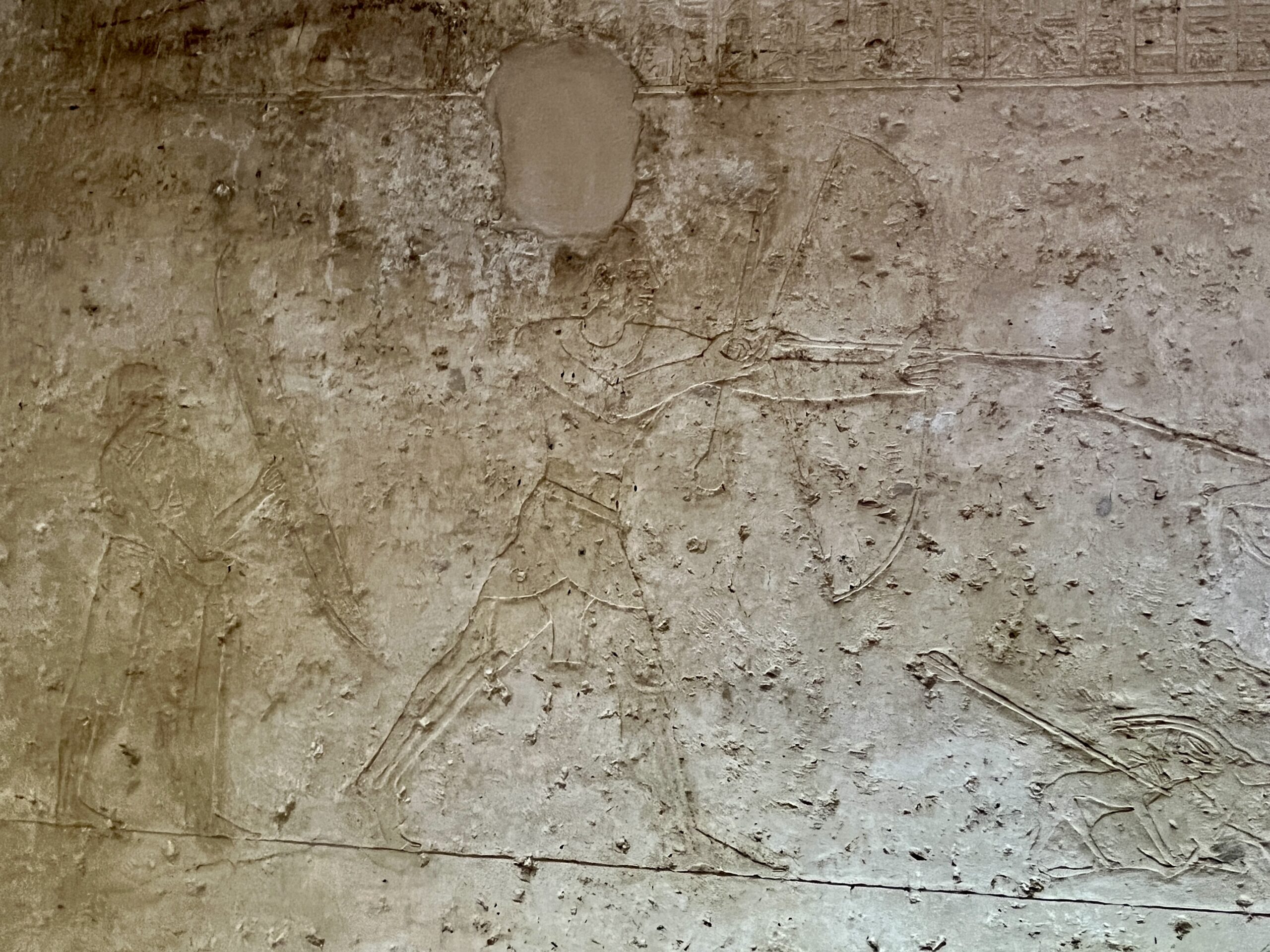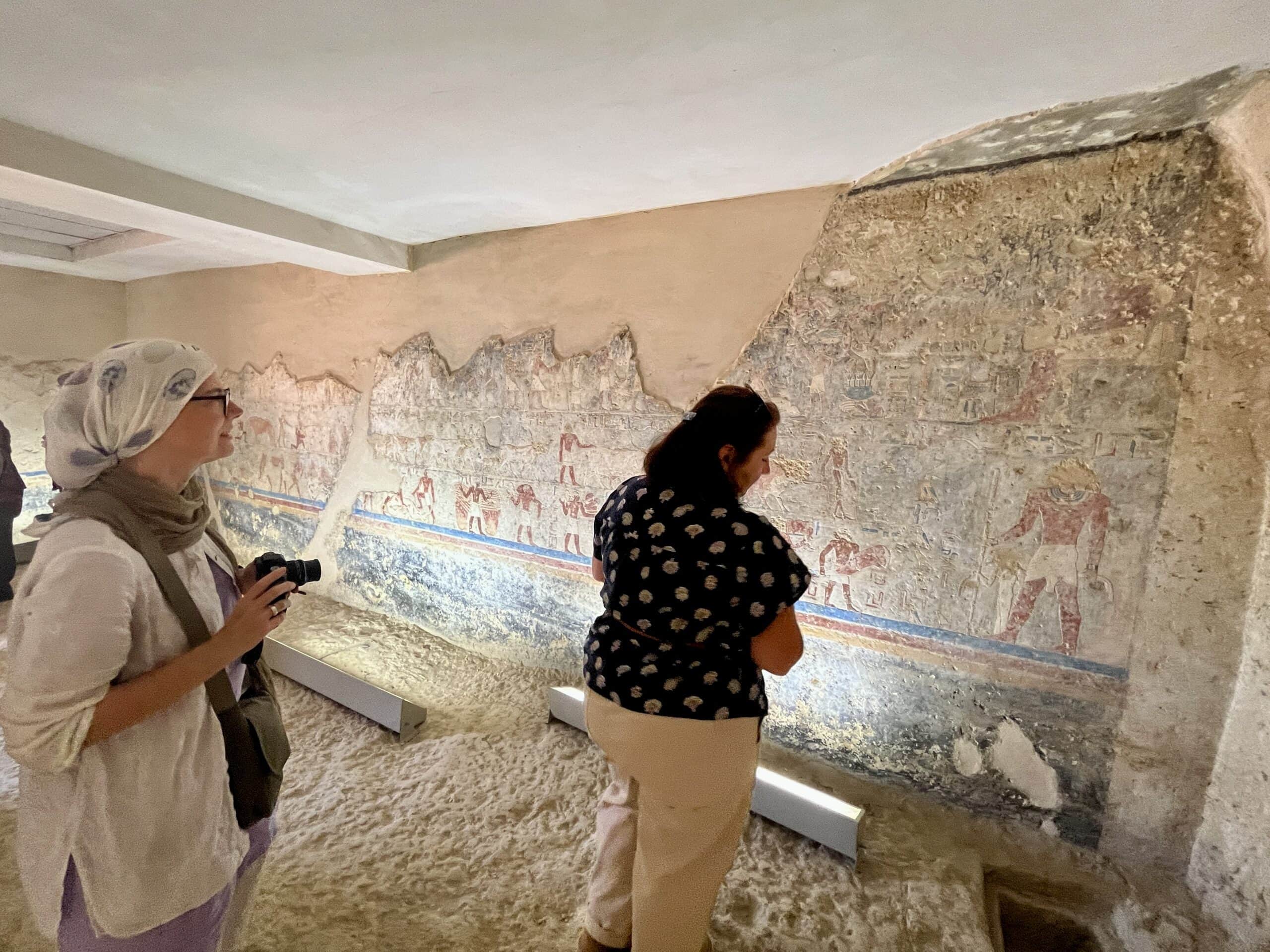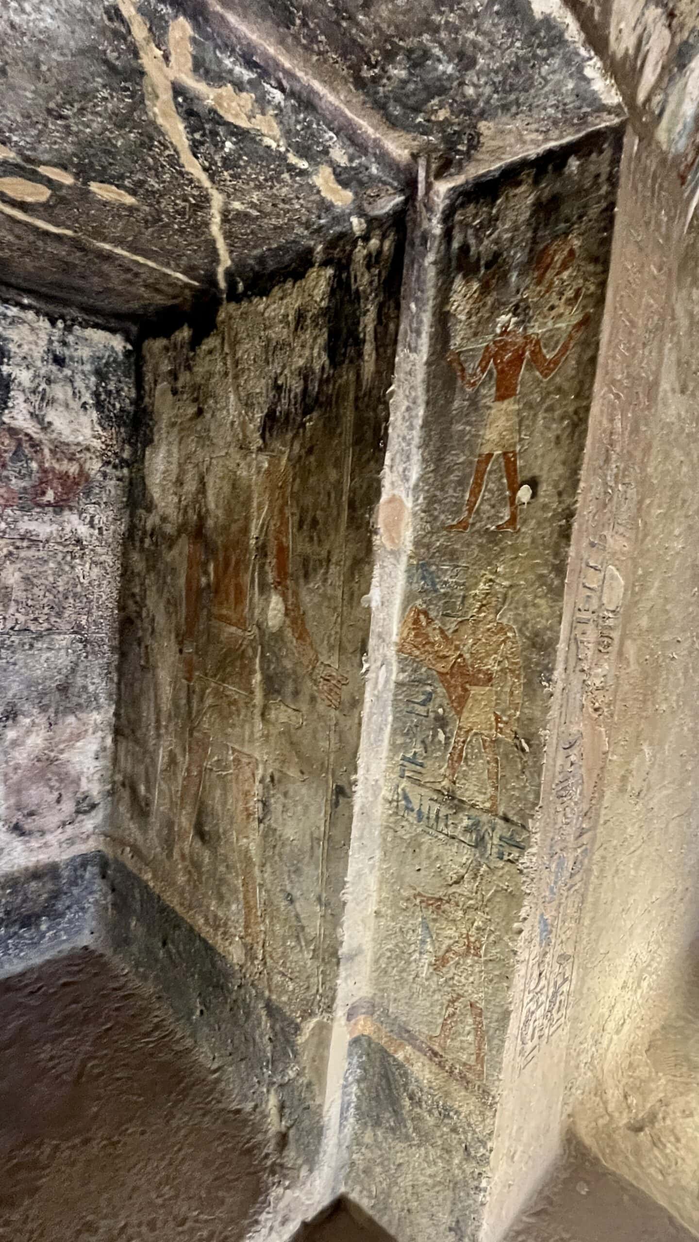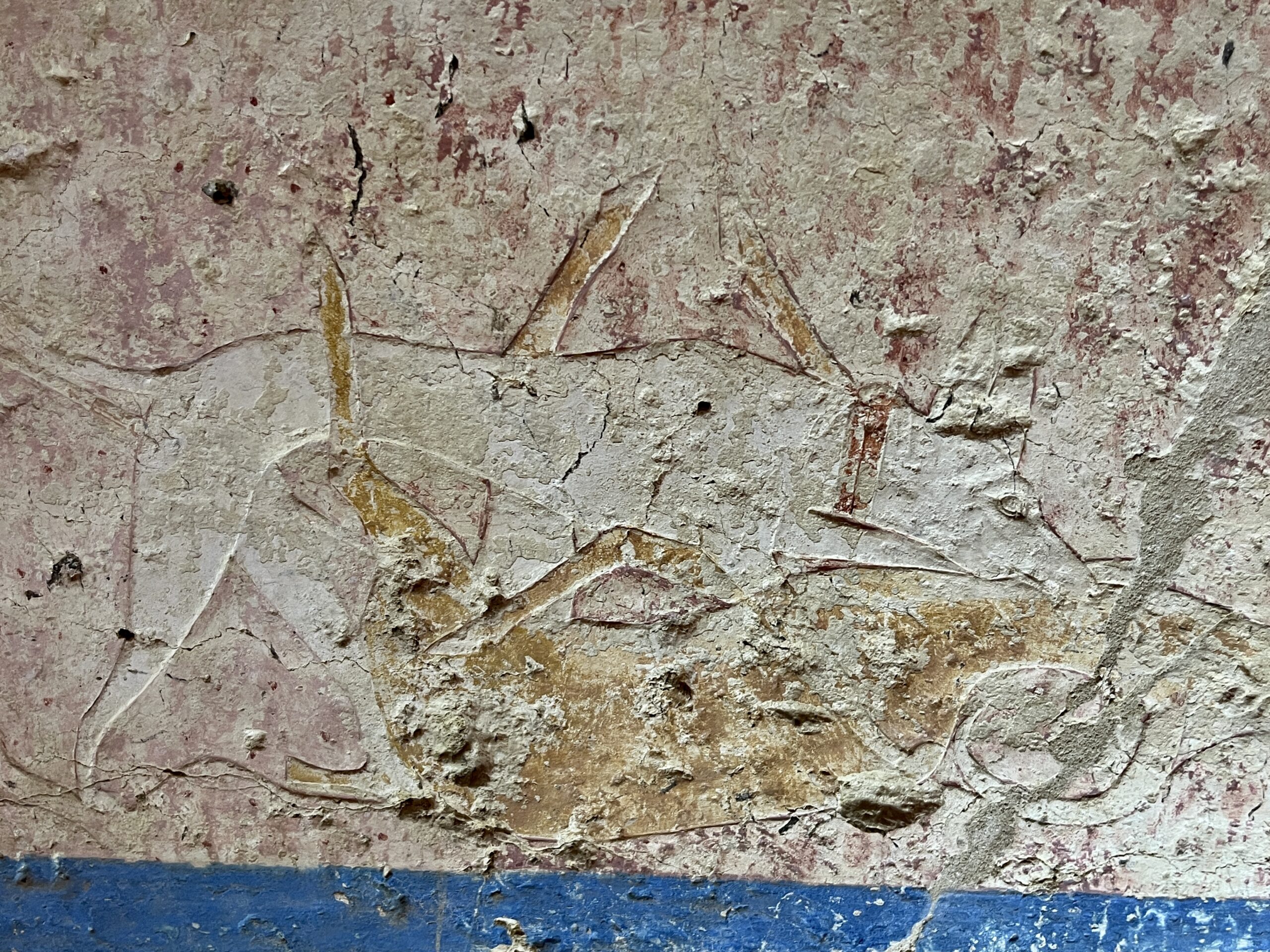 The chapel walls are decorated with both paintings and low reliefs. One wall closely mirrors the “fishing in the marshes” scene from the mastaba of Mereruka, including a crocodile lurking below the papyrus boat and species-specific images of Nile fish.