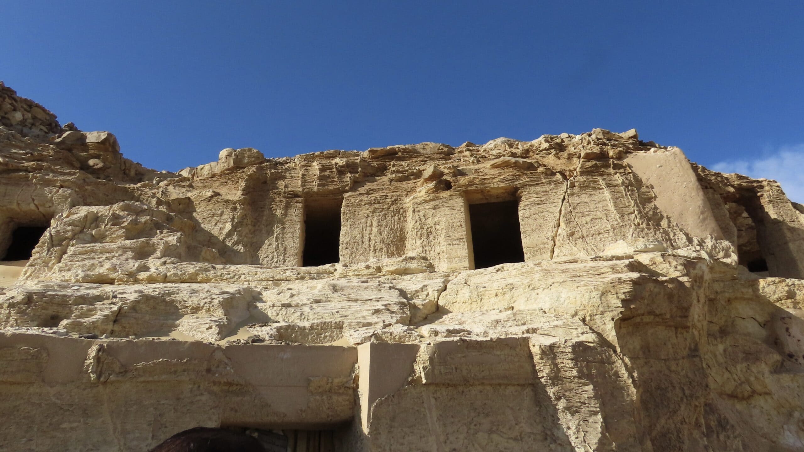 Just like the cemetery at Qaw el Kebir, these cliffs were occupied by Coptic monks from the early Christian era through the Byzantine era (c. 30 BCE – 640 CE, date of the Arab invasion). Egypt’s desert was the location of choice for hermits in Christianty’s early centuries. They would occupy ancient tombs and also hack out cells for themselves in the limestone cliffs.