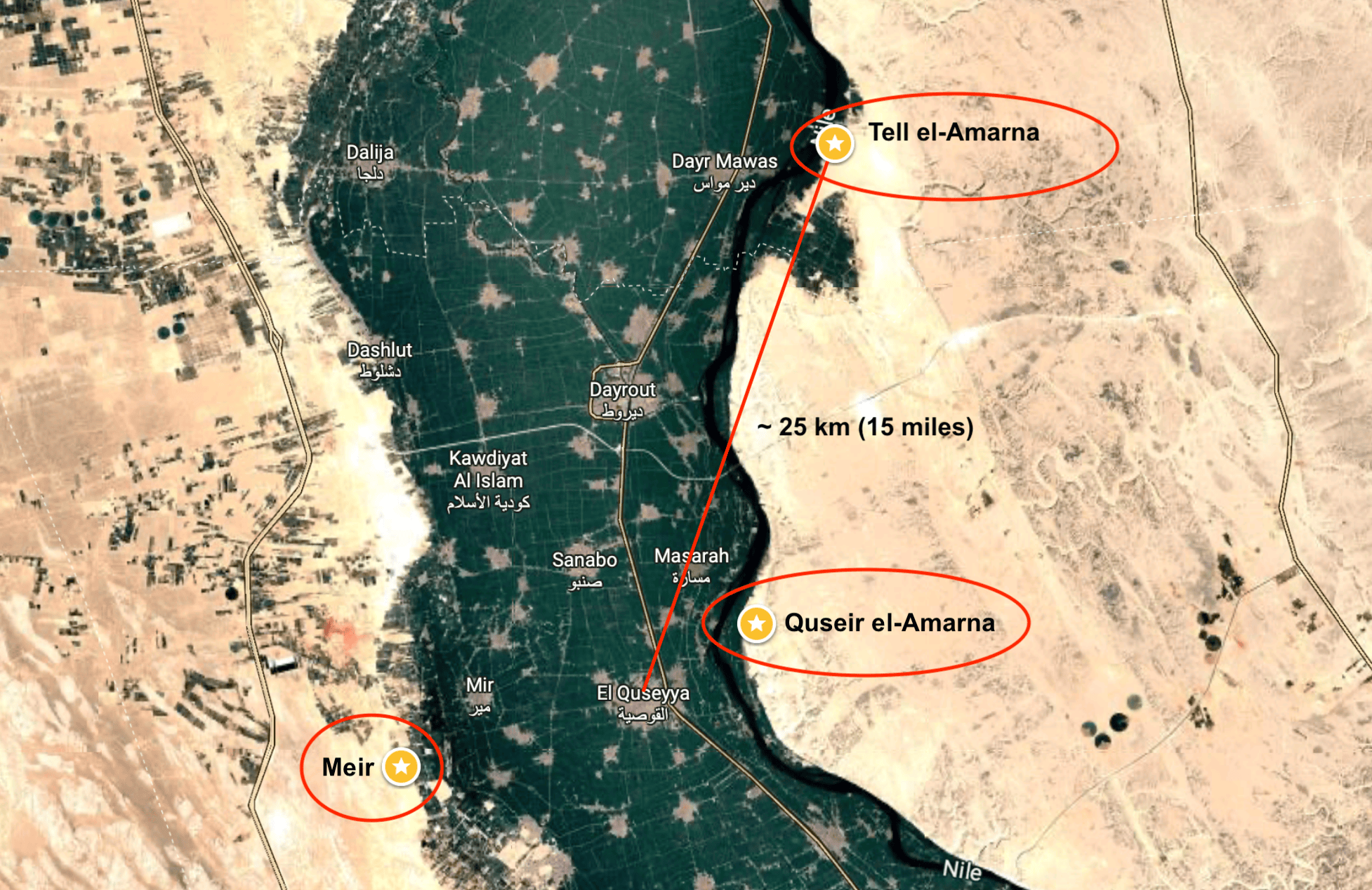 Two cemeteries were used by the nobility of Qis during the 6th Dynasty: Quseir al Amarna, located on the Nile’s east bank, about 5 kilometers (~ 3 miles) northeast of the ancient capital, and Meir, located on the Nile’s west bank about 8 kilometers (~ 5 miles) southwest of Qis.