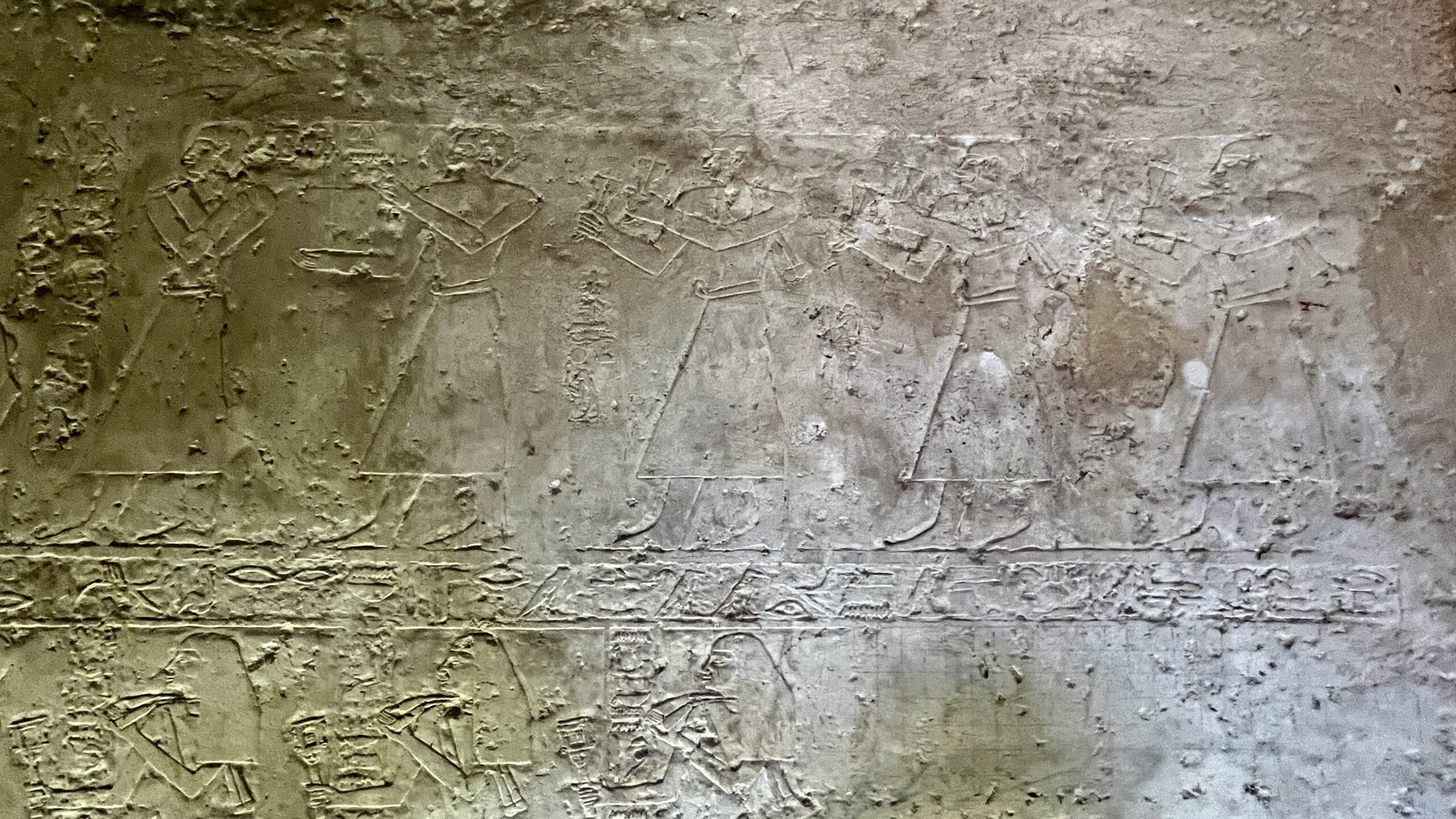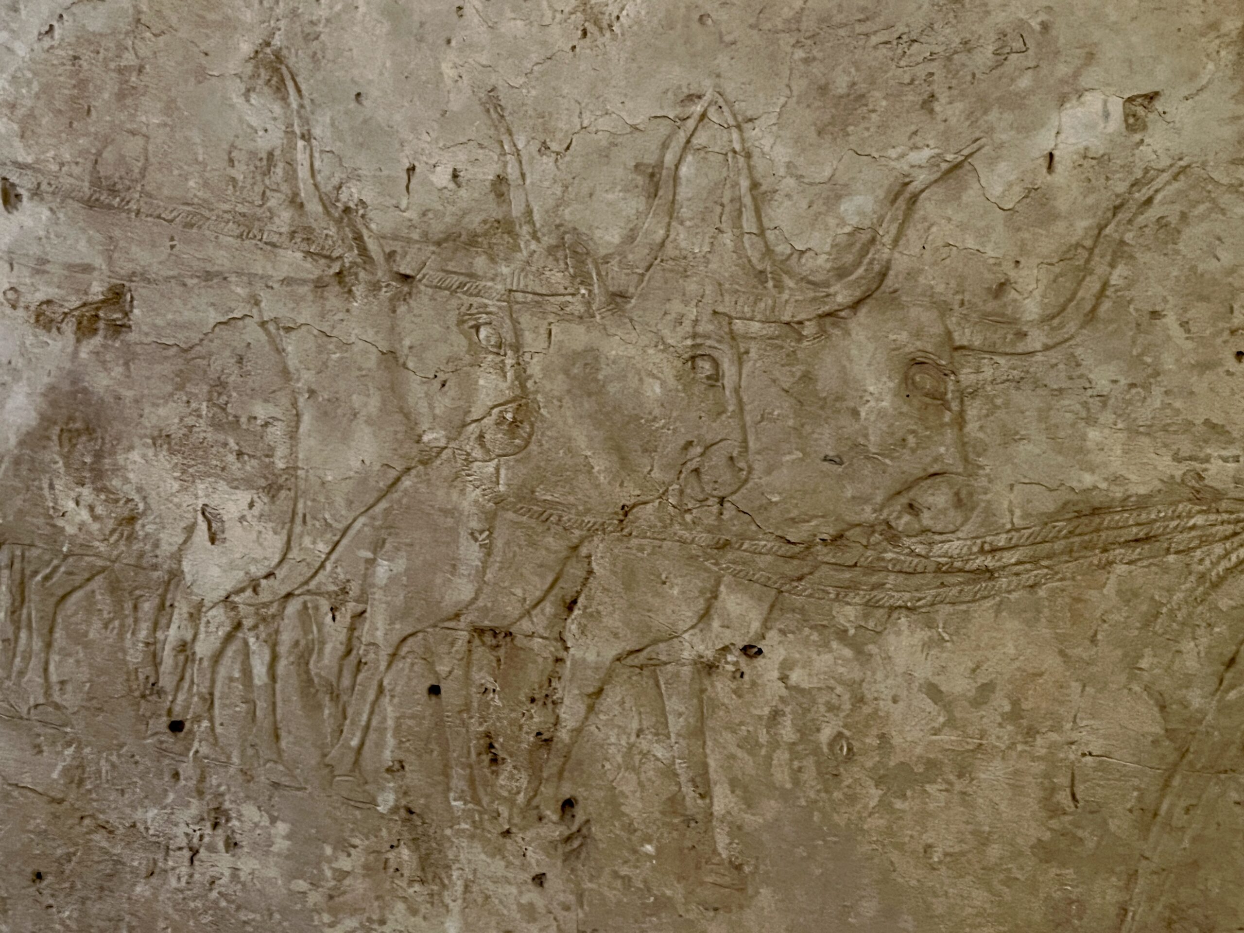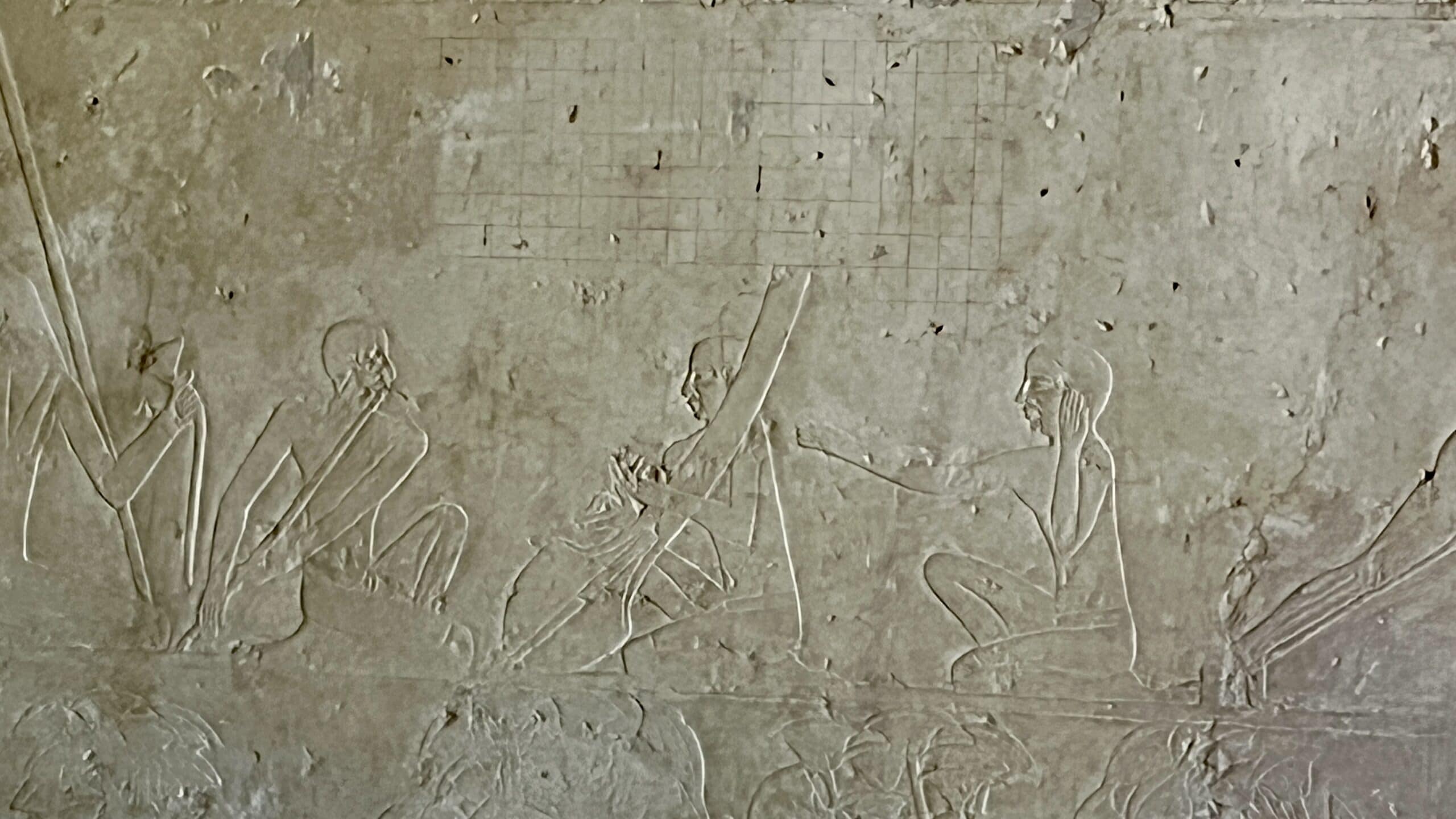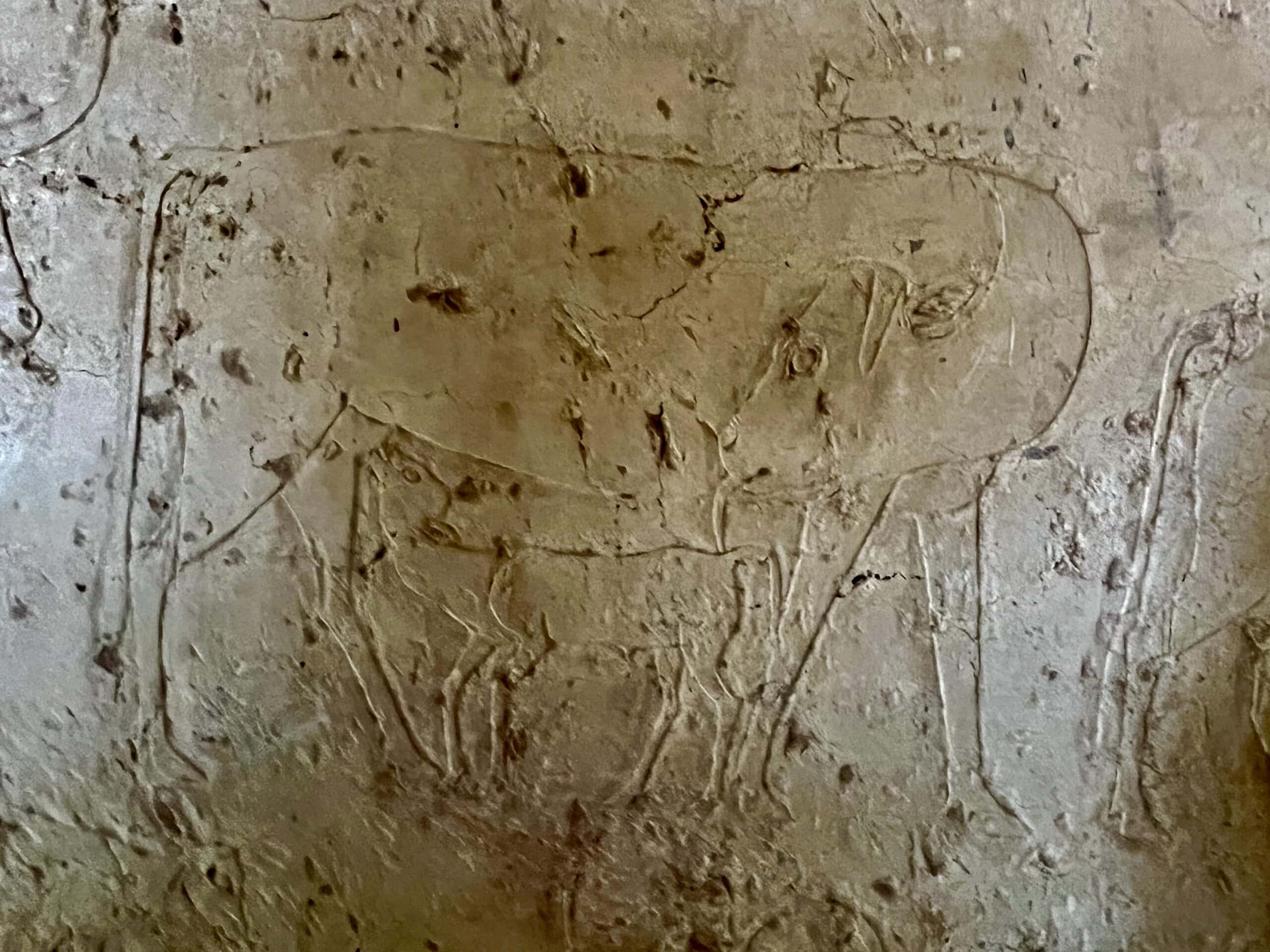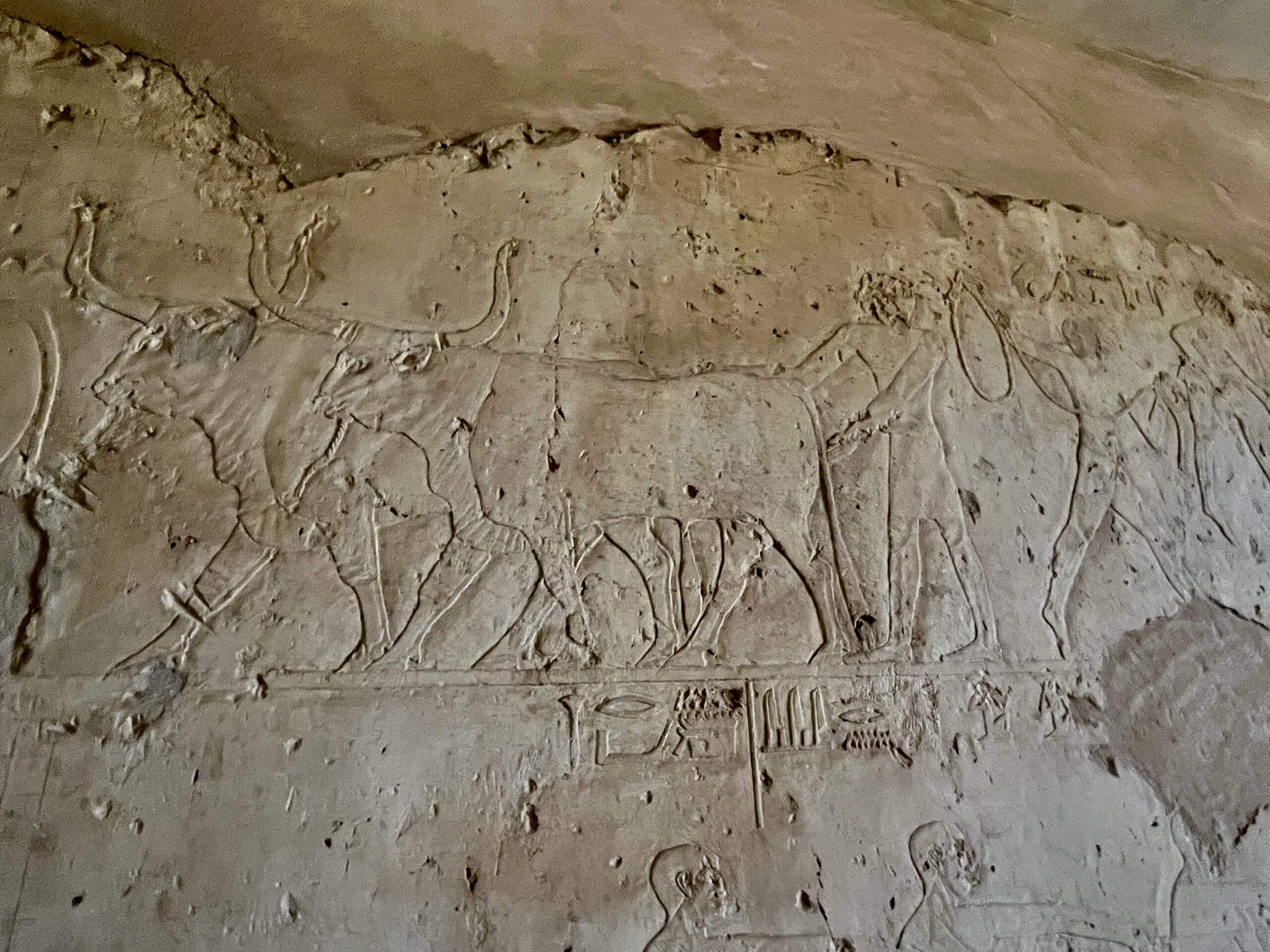 The reliefs in this tomb are noted for their realism, although they are in various stages of completion. Many were never painted. Below are images from the chapel’s north wall, including cattle, bulls fighting, a man carrying papyrus reeds on his back and musicians entertaining Uhkhotep (including the orchestra leader at the back). Note the rectangular grids above the musicians, which were created by artists from Dynasty 26 (c. 664 BC–525 BCE) who were copying these reliefs to re-learn the art, more than 1300 years later.