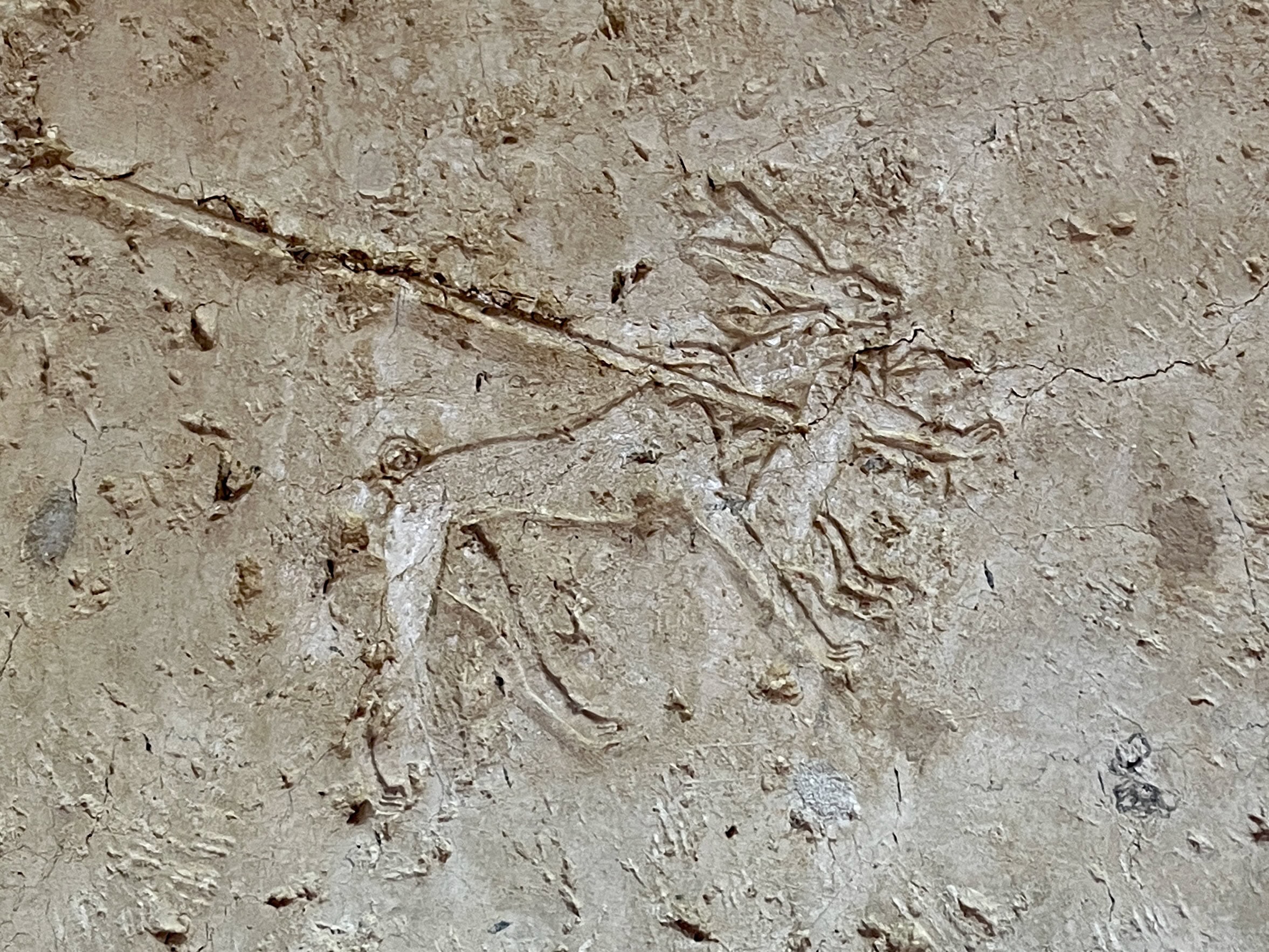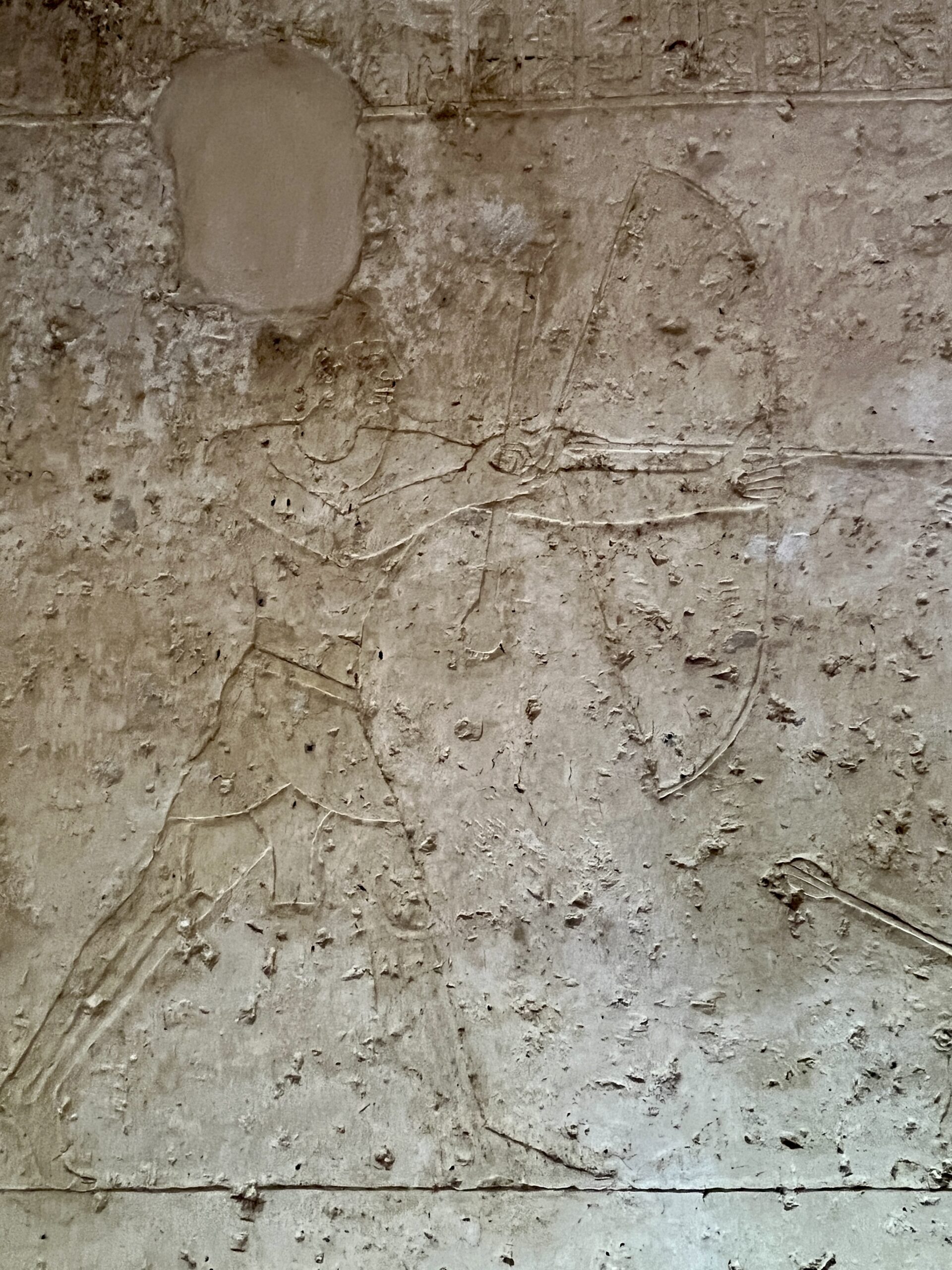 The reliefs lack detail (and were hard to photograph in dim light) but a lot of color remains. Scenes depicted are typical of the period: the tomb owner overseeing a parade of shepherds, butchers, sacrifice bearers, priests, fighting bulls, men leaping over bulls, and a cow giving birth; the tomb owner at a feast with dancers and musicians, offering bearers and wrestlers; people engaged agriculture and craft activities; fishing in the marshes; and a unique hunting scene: Senebi leaning forward as he aims his bow at desert prey (depicted in the sketch below). The high quality of these reliefs suggests that the artists were borrowed from the royal workshops.