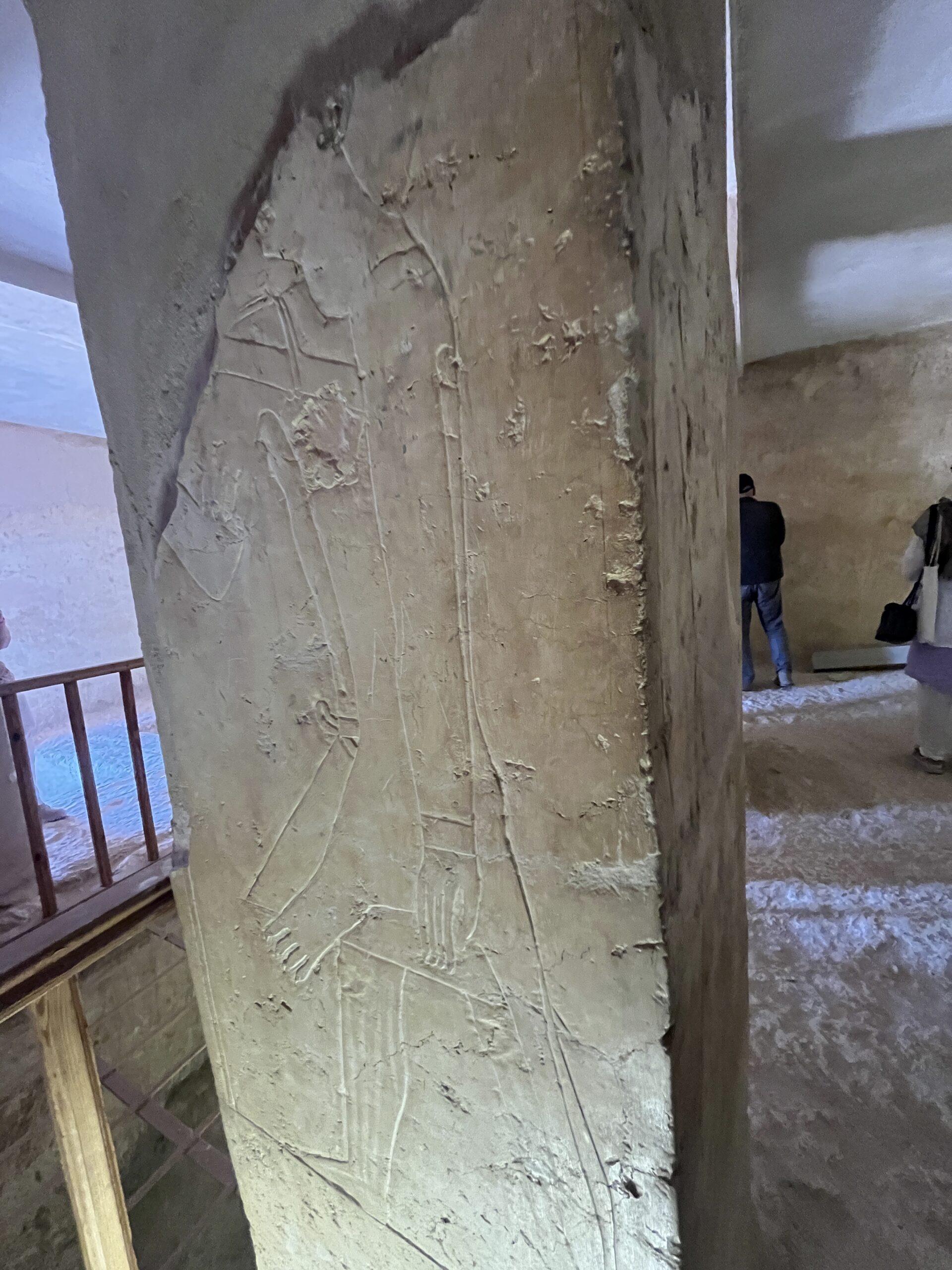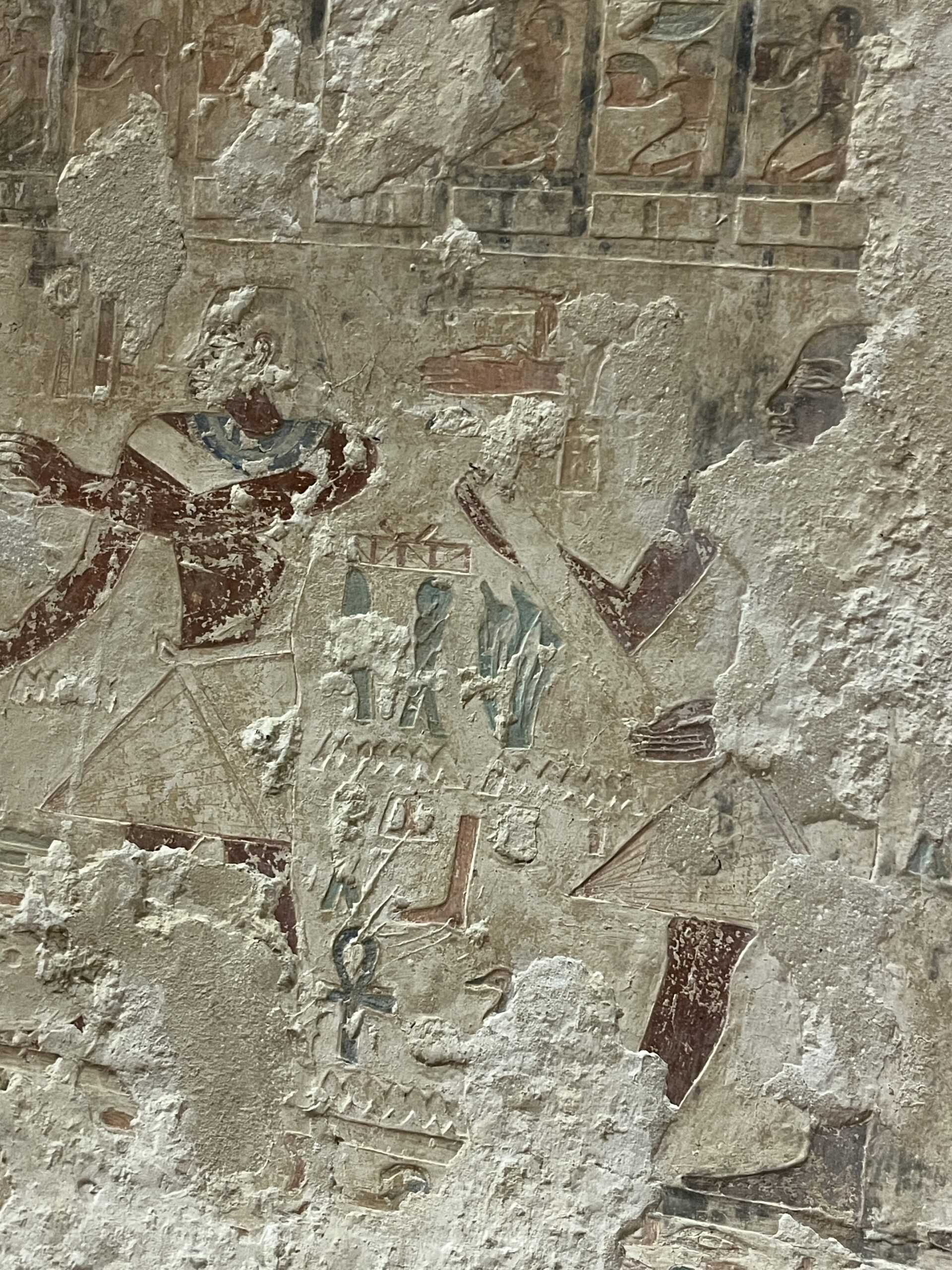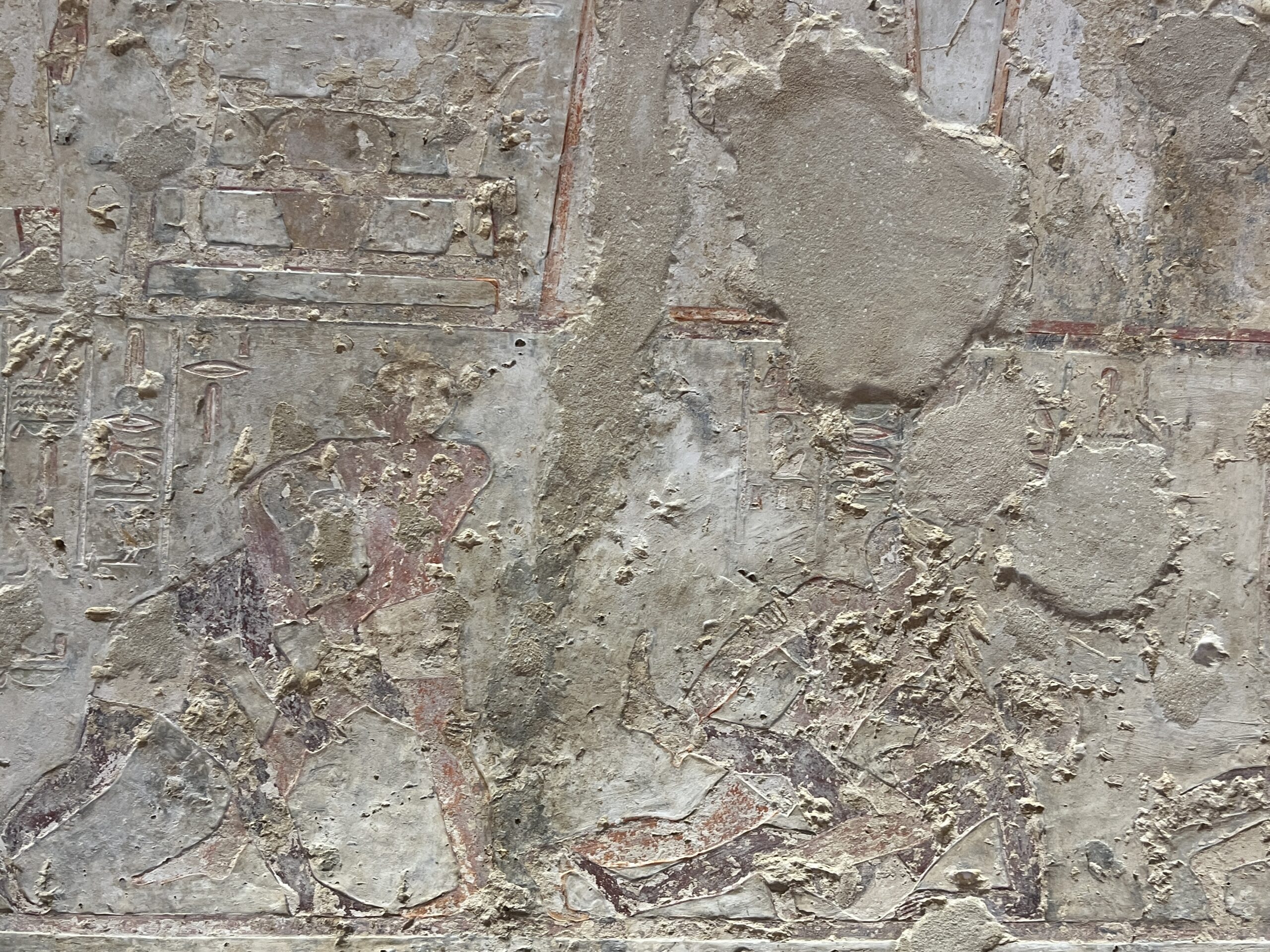 A door was carved through Room F (the east wall of the A2 chapel, possibly belonging to Heny) to create yet another extension whose owner is not firmly identified. This room (H) has unfinished walls and a ka chapel with some empty spots where statues once stood. I find rooms like this especially interesting because we can see how the reliefs were created: sketch artists drew the images, then sculptors carved the images in stone, followed by another set of artists who added color.