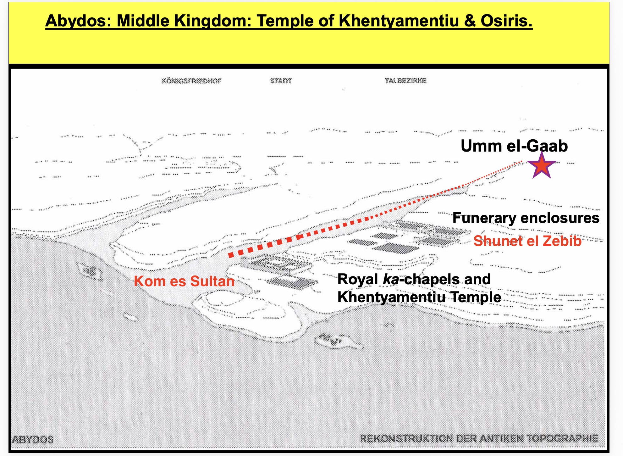 The ceremonies began at the temple of Khentiamentiu (known today as the Kom es-Sultan), then processed west up a shallow wadi to end at Osiris’ mythical tomb. People would bring offerings in pots and leave them at the tomb. Local people named the cemetery Umm el-Qa’ab, “Mother of Pots,” because of the thousands and thousands of potsherds that accumulated over centuries of worship. (Slides from Mumford.)