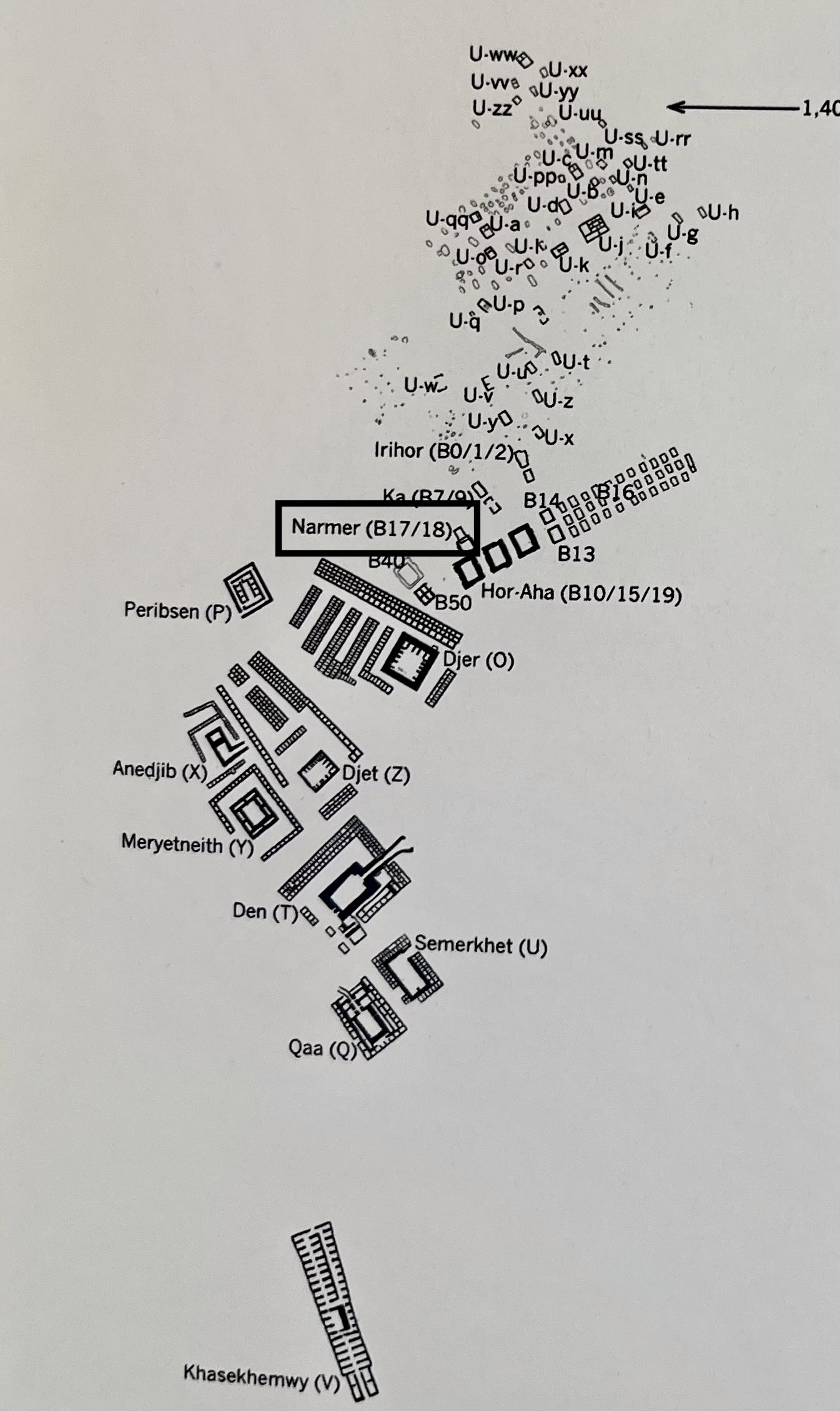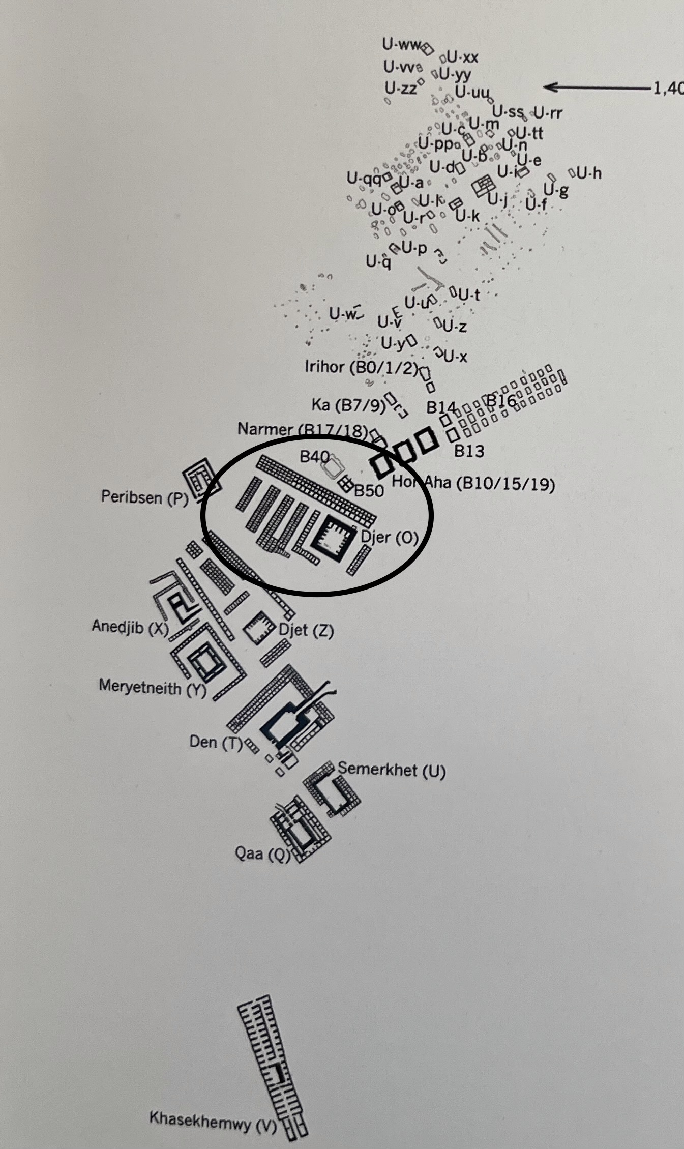 Aha’s tomb, Djer’s predecessor, has 36 subsidiary graves. Djer’s tomb has 318 subsidiary burials. The bodies were buried in long trenches divided by mud brick walls – an efficient way to accommodate a lot of bodies quickly – and cranial trauma is evident. Rosalyn Campbell, whose PhD thesis reflects the most recent work, places these deaths in the cultural context of government violence as a way to reinforce power and enforce unity on a newly unified – and probably still divided – polity. I find some of her comments quite chilling, especially in the context of our modern times. (Some things never change…)