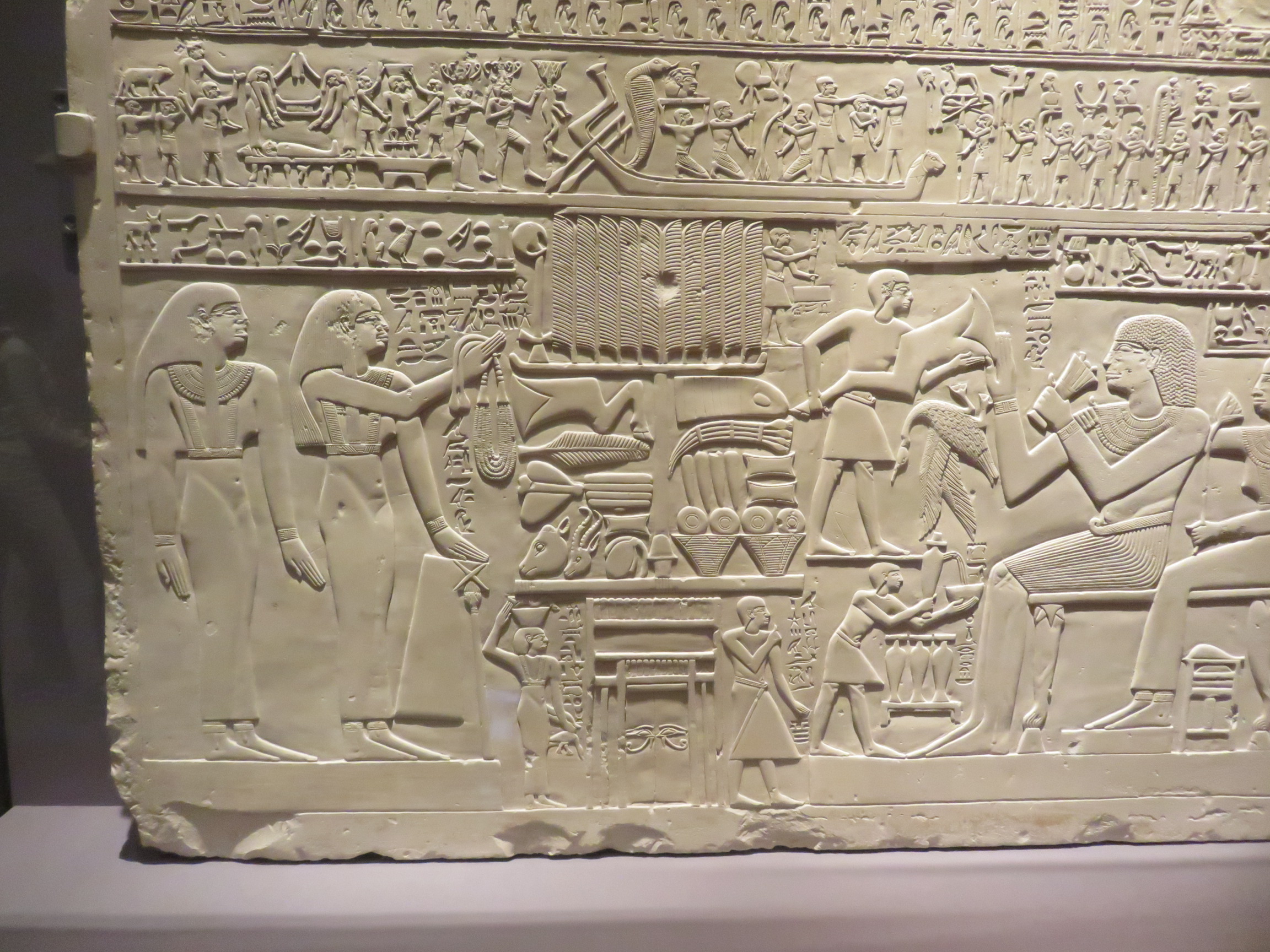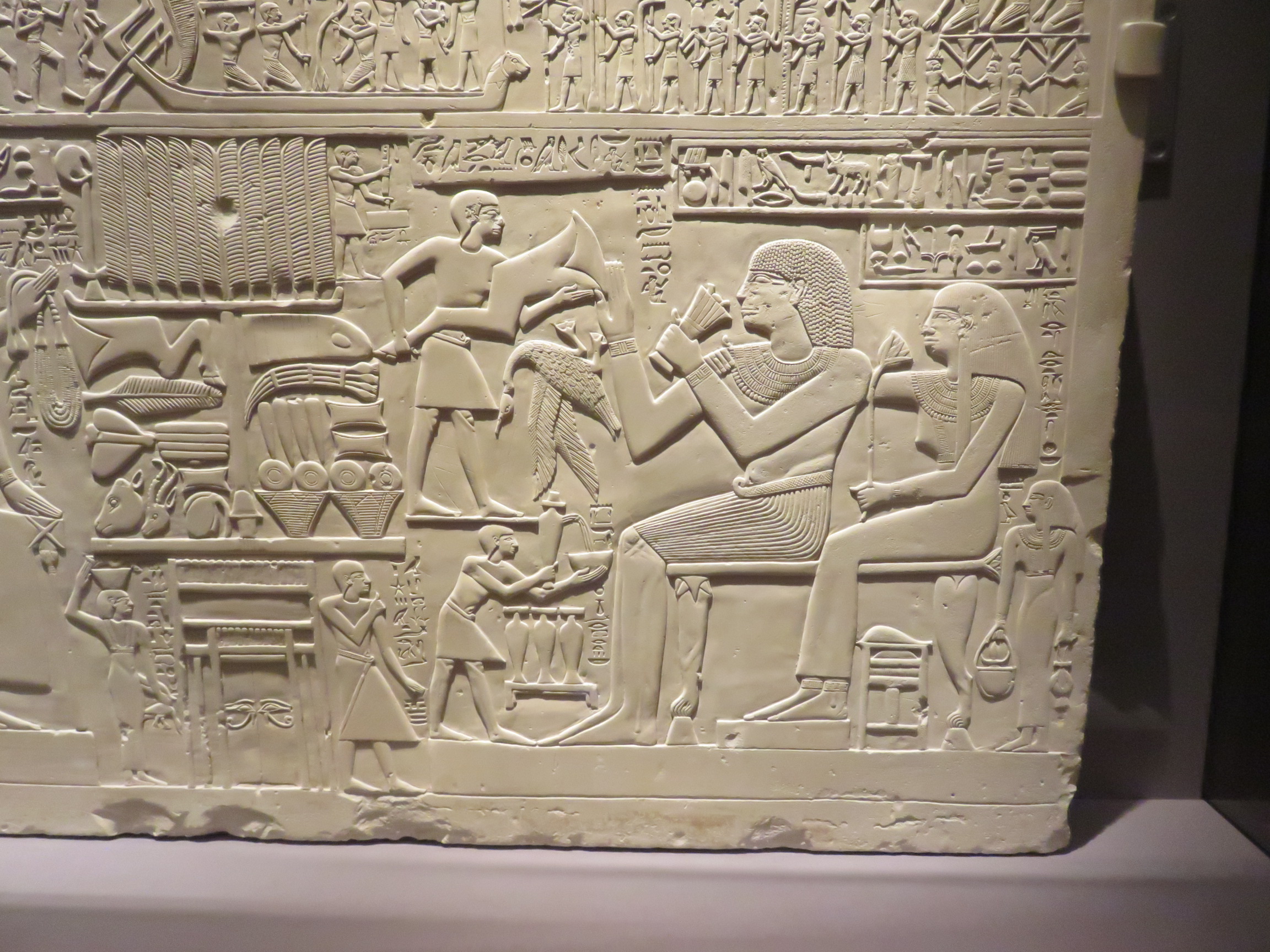 The Louvre has a particularly fine example in the stela of the Overseer of Herds Abkau and his wife, Imemi. The couple sits at a table piled high with offerings while family members and servants recite rituals and bring more food and drink. Inscriptions in the upper register (above the couple) depict scenes from the Osiris story. (First photo is from the Louvre’s files.)