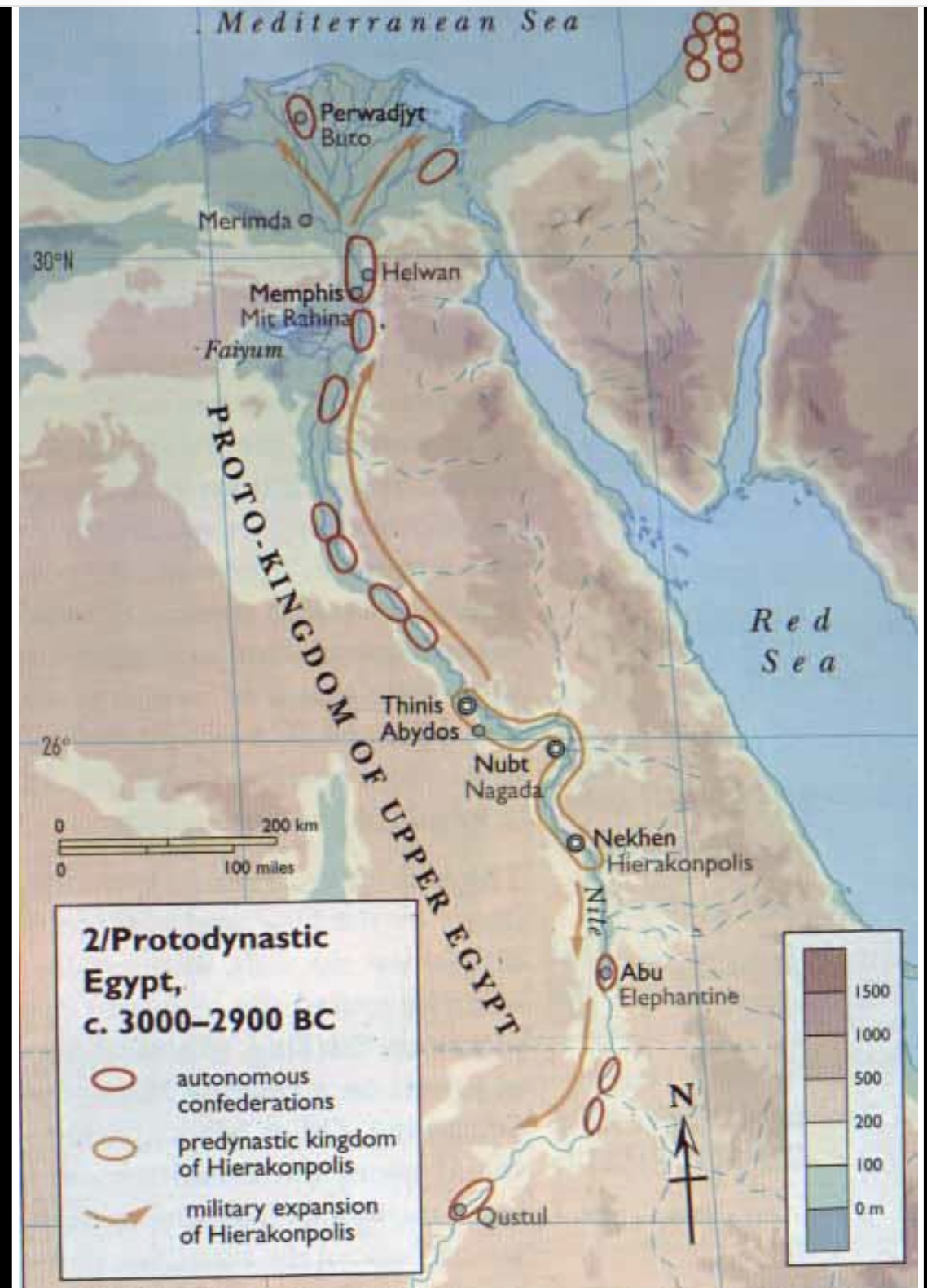 Abydos was perhaps Egypt’s most important religious place for the entire history of pharaonic Egypt. Â The Abydos region was one of the emerging State’s power centers (“proto-kingdoms,” to Egyptologists) in the centuries before Upper (the south) and Lower (the north) Egypt were unified. The process of unification seems to have been a combination of gradual cultural assimilation through trade and migration, plus battles among the major power centers: Nekhen/Hierakonpolis (near Edfu), Coptos/Qis, Â Nubt/Naqada, Thinis/Abydos, and Memphis/Helwan (modern Cairo).