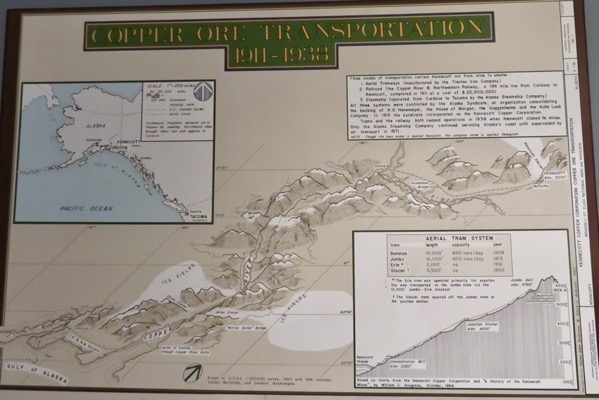 Schematic showing how copper ore was transported from the Kennecott Copper Mine by an aerial tram and the railway to reach the Port of Cordova.