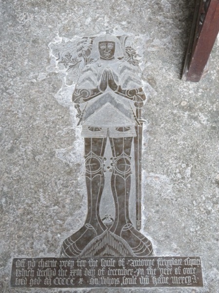 Like many English churches, there are tombs underneath with the dead identified through tablets set in the floor. Here is brass memorial to John Croston (died 1470), memorialized with his 3 (identical) wives and four children.