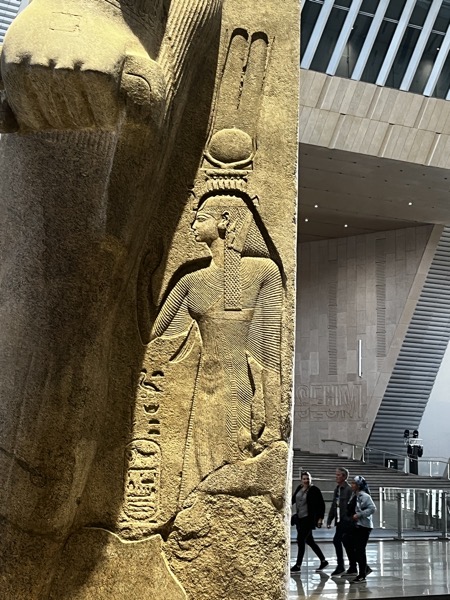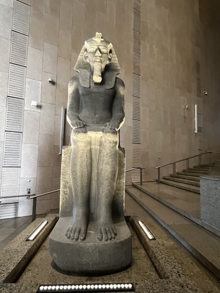 A 30+ foot tall statue of Ramses 2 (found in Memphis/Men-nefer, just south of Cairo) dominates the entry. This statue stood for many years outside Cairo’s main train station, “Ramses station.” The GEM building had to be constructed around the sculpture, since it would not have fit through the doors post-construction.