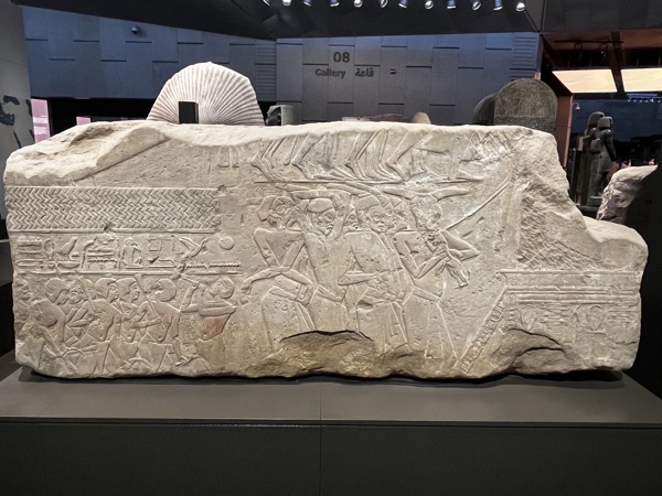 Tutankhamen, Egypt’s best known ruler, backed away from the Aten and restored the cult of Amen-re during his brief reign. (Or, since he was child, it’s more likely that his advisors did). The bulk of the treasures from Tutankhamen’s nearly intact tomb are being moved to the GEM, but those galleries weren’t yet open on my visit. Below are some lovely reliefs from Tutankhamen’s military campaign into Nubia, from Karnak.