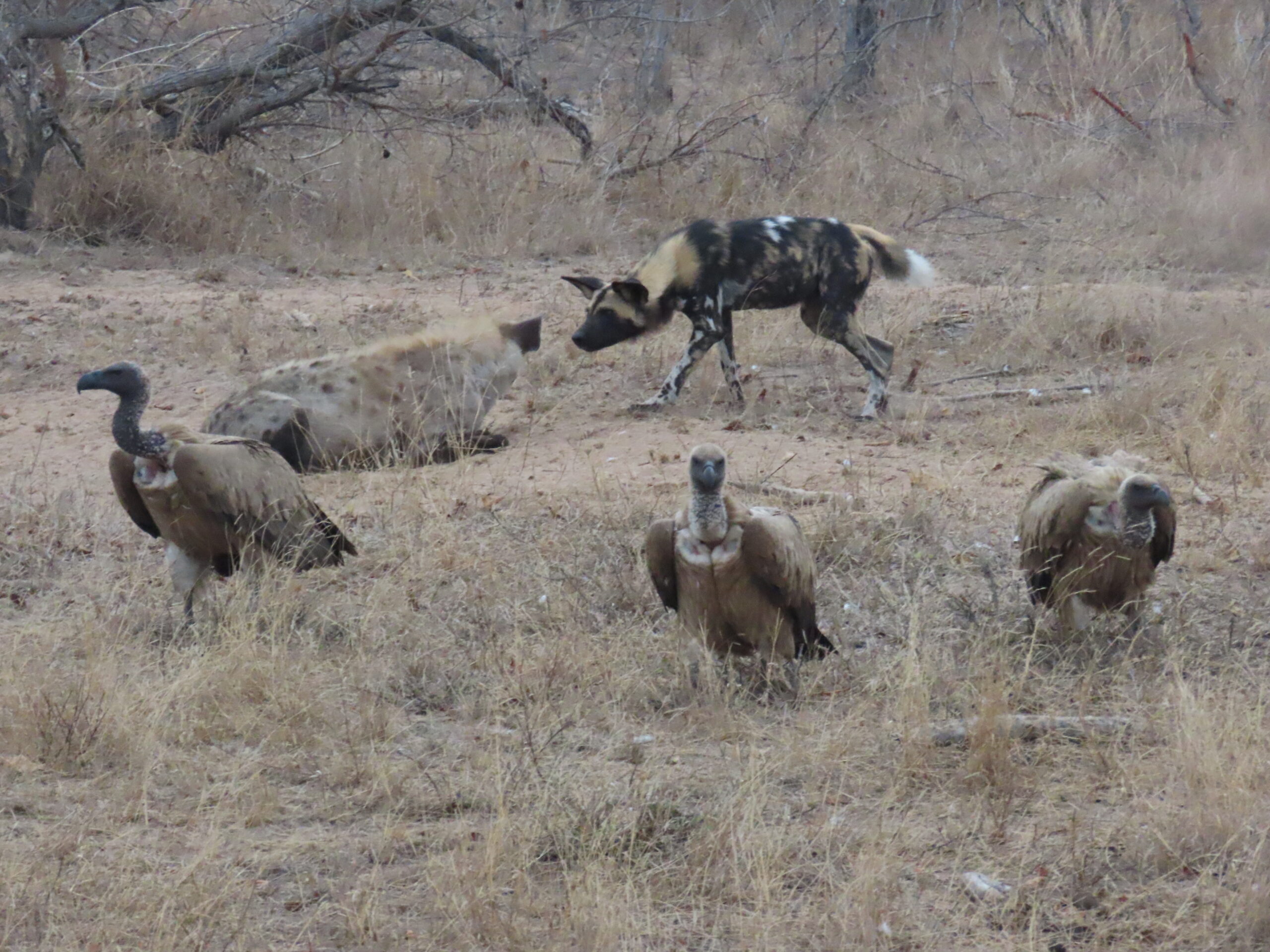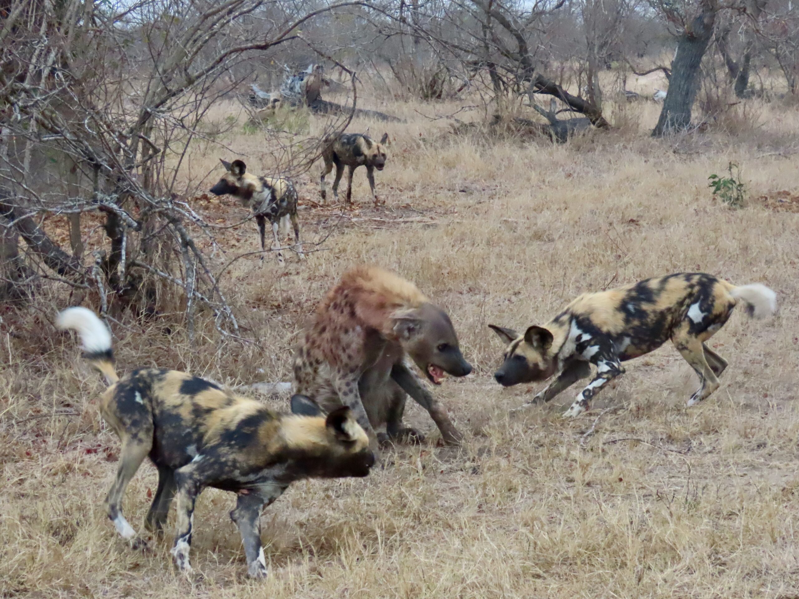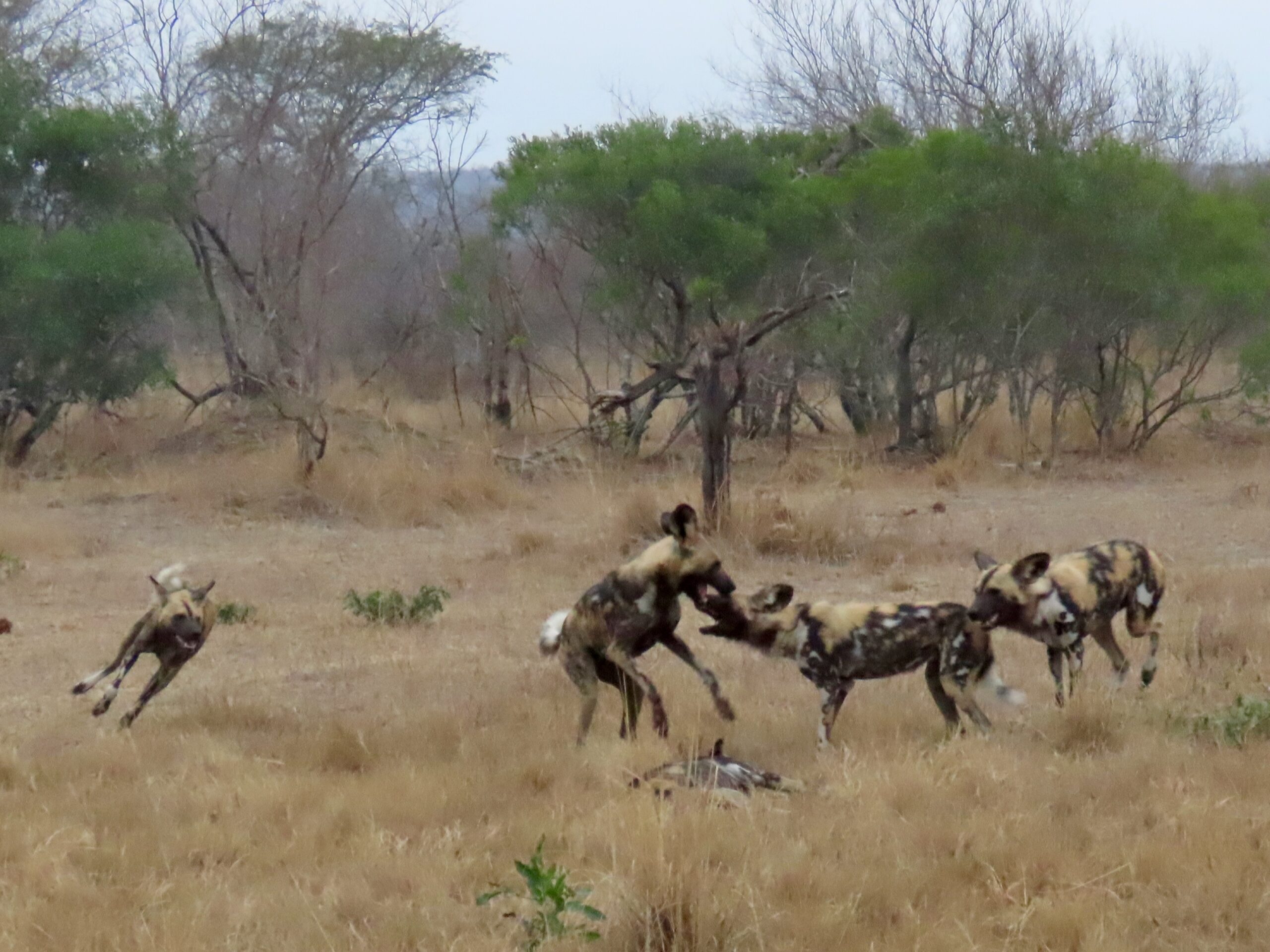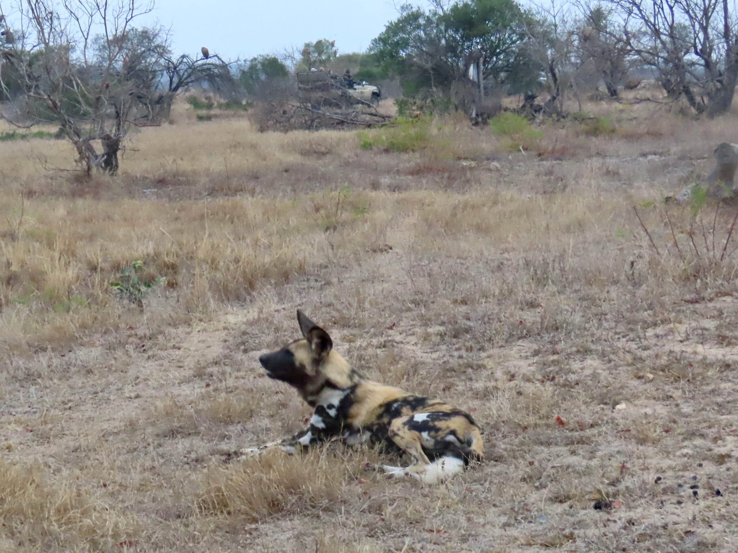 Wild (aka “Painted”) dogs are highly endangered, one of only 5 species for whom the reserves will intervene with veterinary care if one is injured. They are very fast predators, but they are also small, and other African predators regularly take them down and/or steal their kills. So we were very lucky to see a pack of this size and enjoy the antics of the 9 pups and their 2 adult nannies.