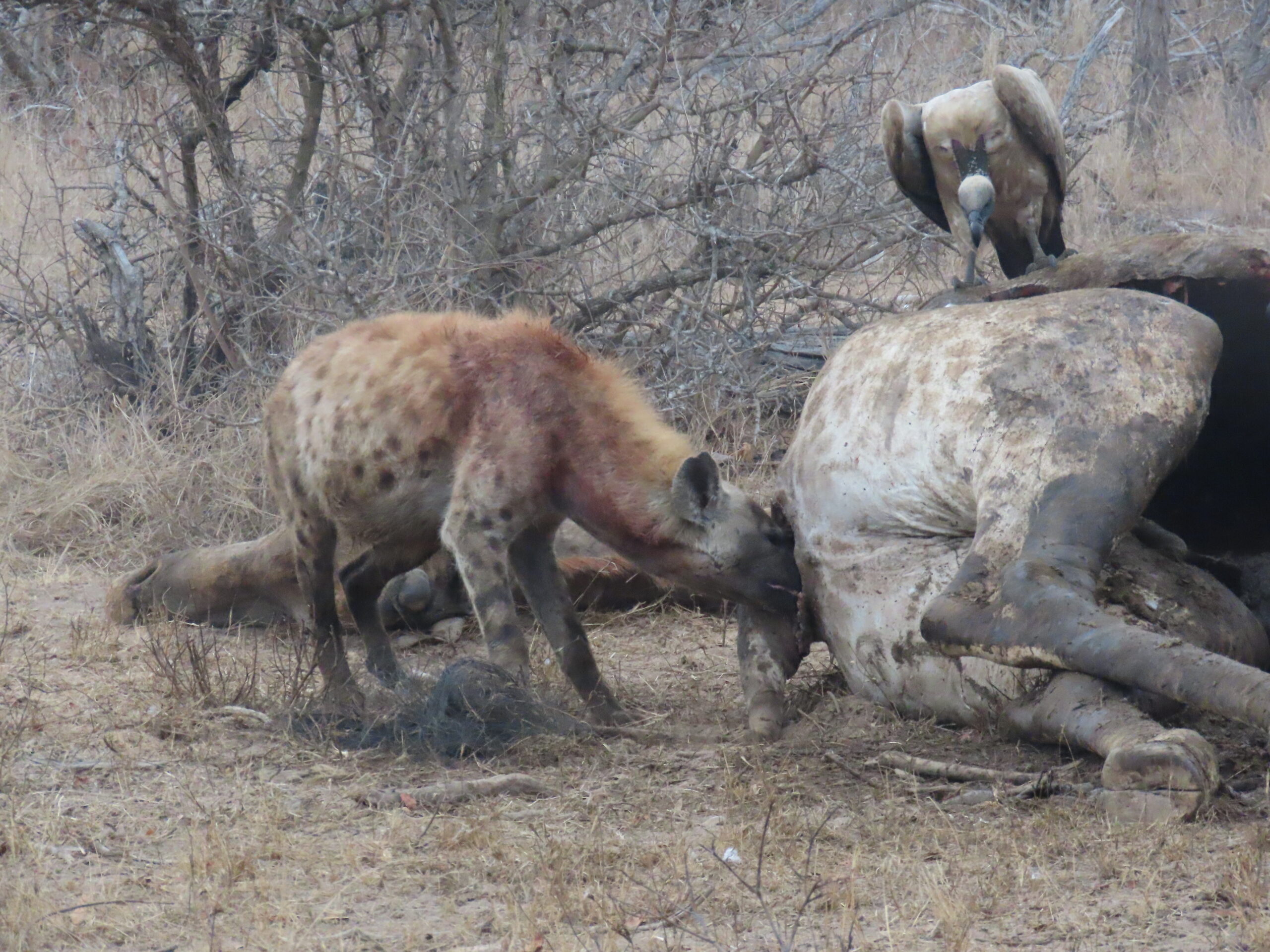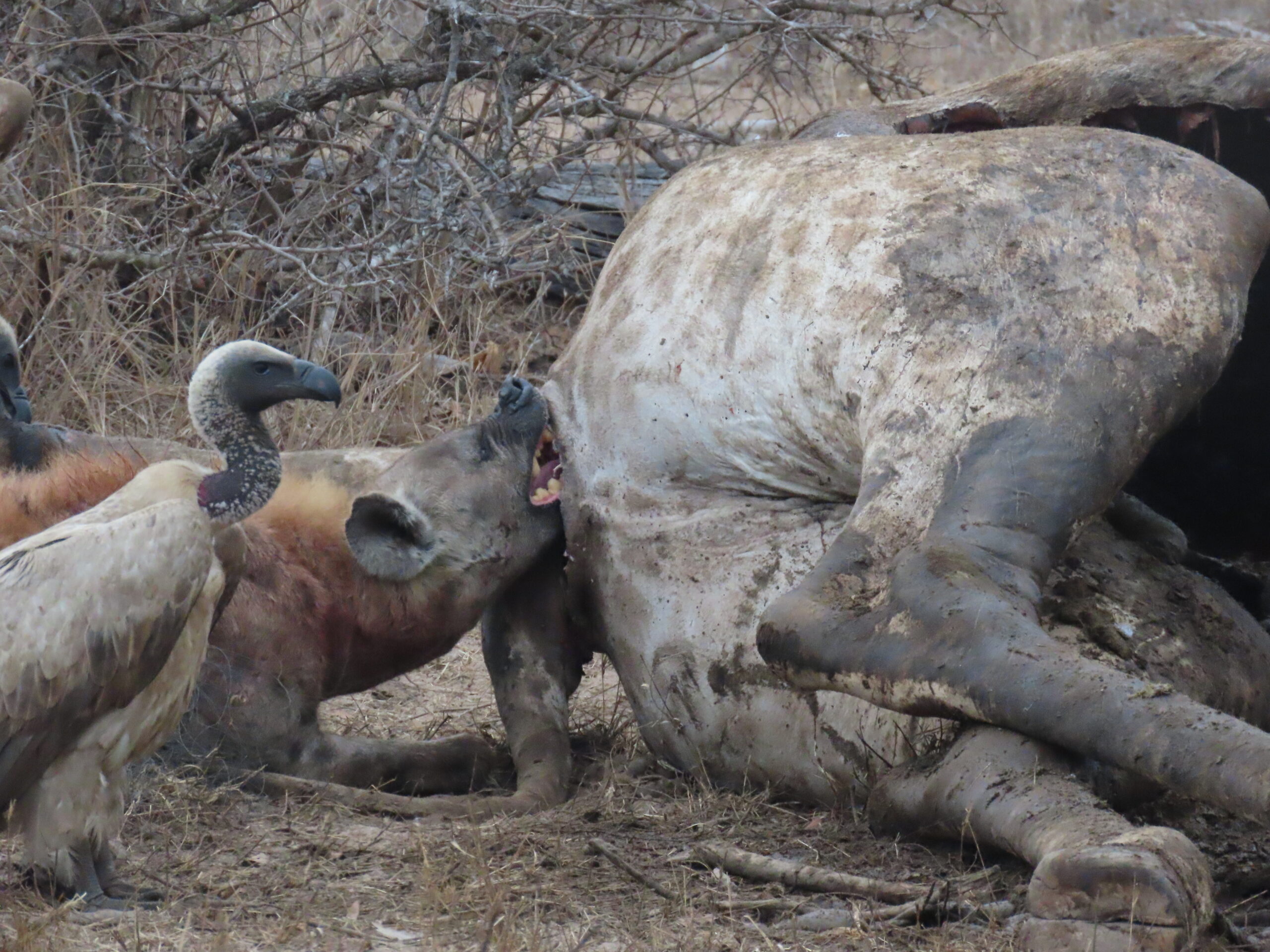 But there was more. A “bomba,” we learned, is a kill.  An old giraffe had died near one of the lodges on the day before, and lodge staff dragged it off into the bush to keep carnivores away from the tender flesh of tourists. Giraffes are big animals (males typically weigh in at 2.5-3 tons) so that’s a lot of meat on the table – and feasting was underway just down the road from the puppy playground.