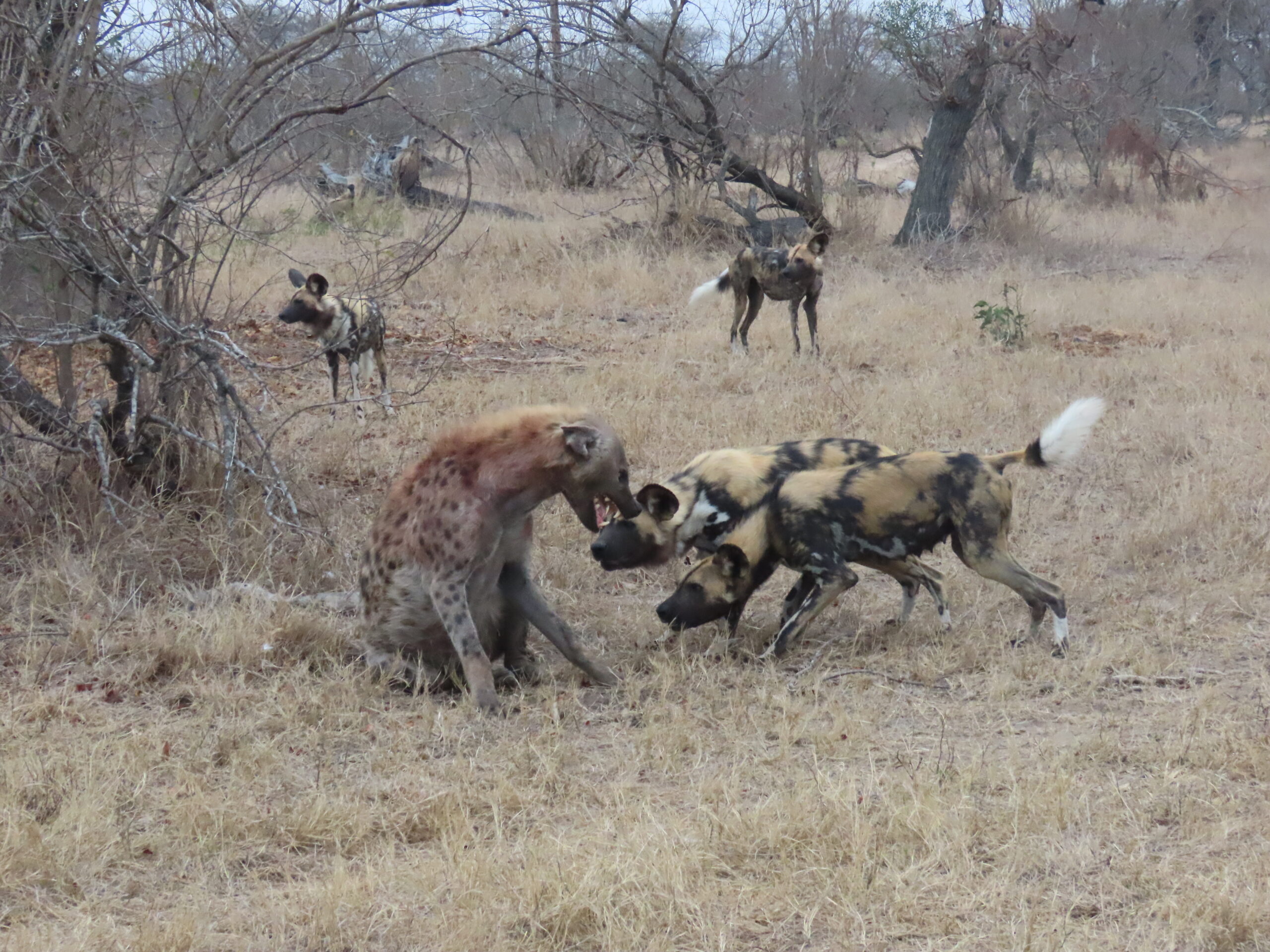 The dogs clearly wanted in on the action, but the hyenas weren’t interested in sharing. Â To our astonishment, the dogs started taunting the hyenas – a very dangerous move since hyenas are bigger and stronger than dogs, with jaws that can easily crunch through bone,