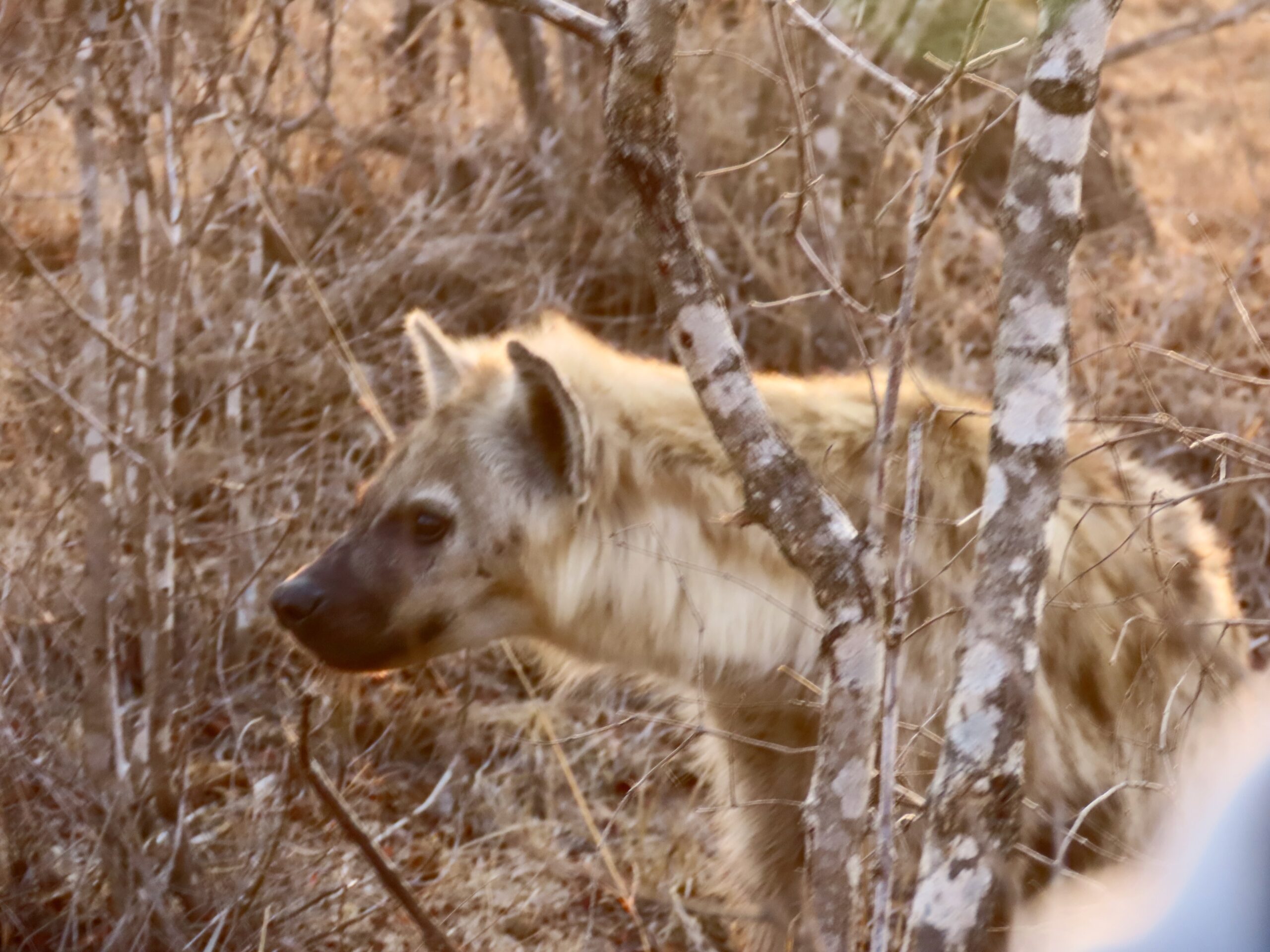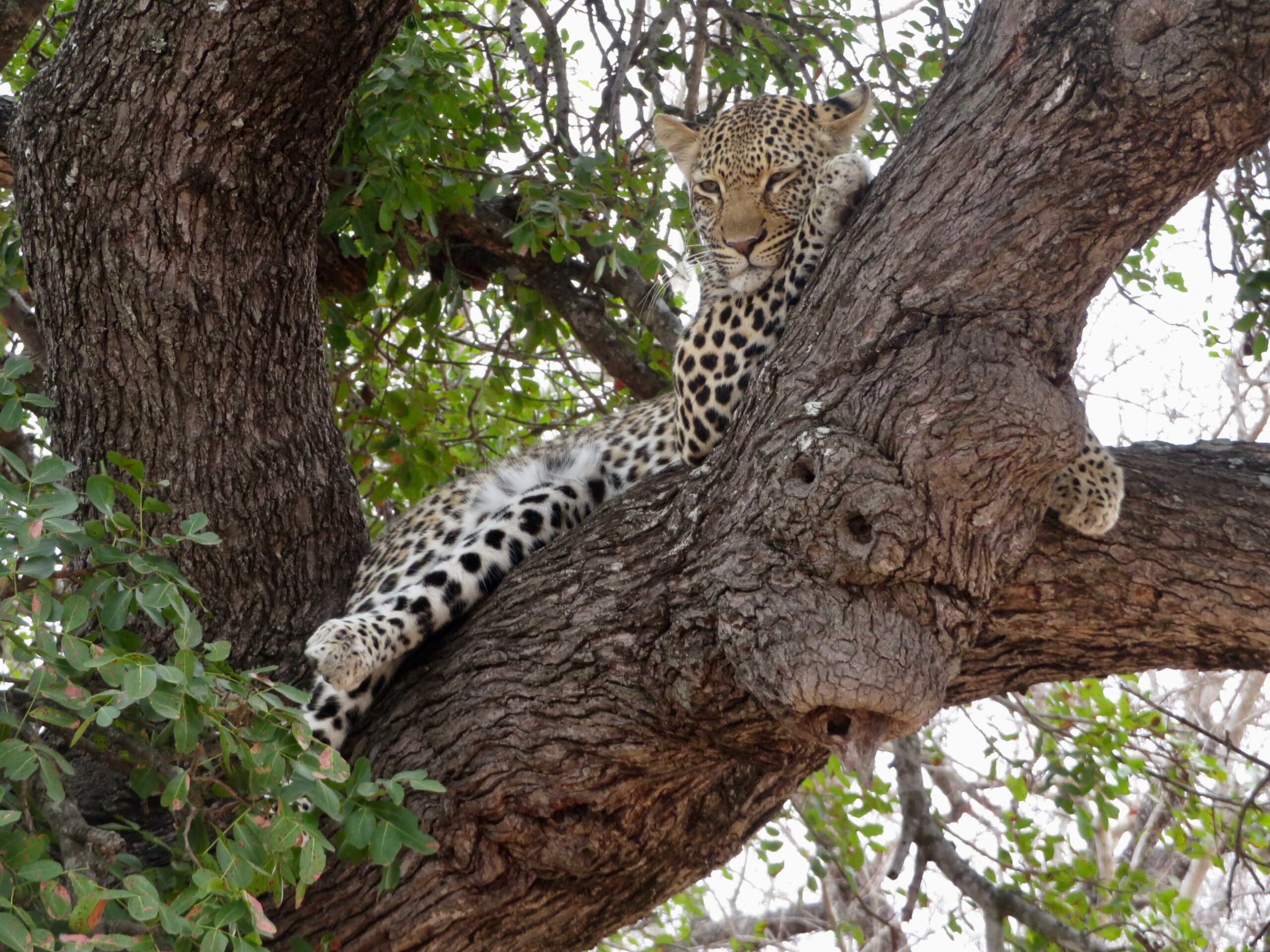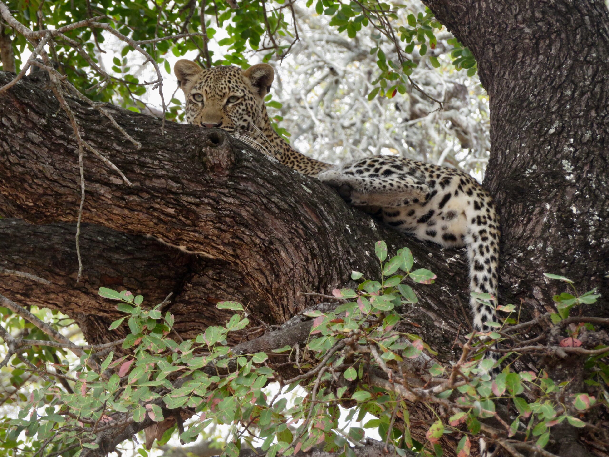 This hyena was scenting what FJ & Mike quickly spotted: a leopard stretched out along the branch of jackalberry tree.