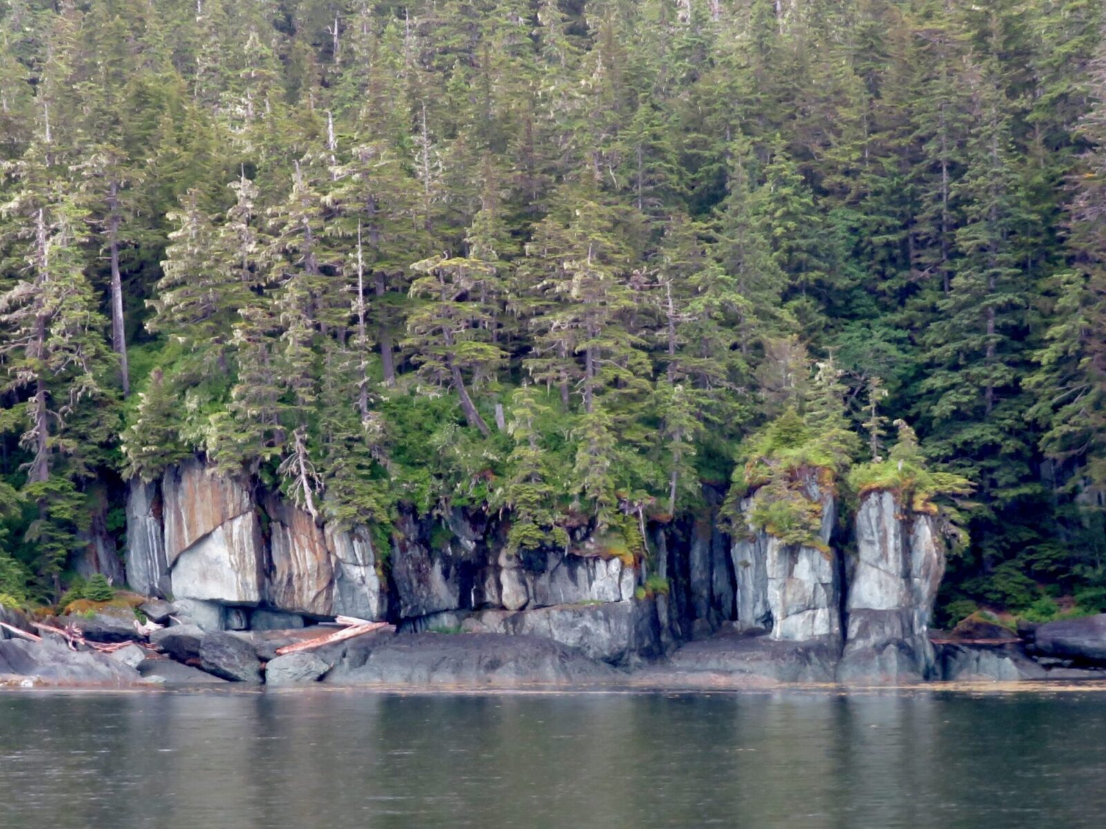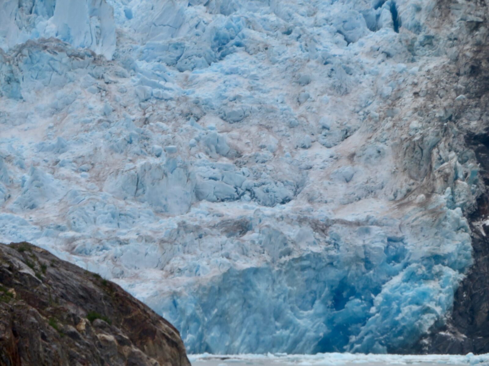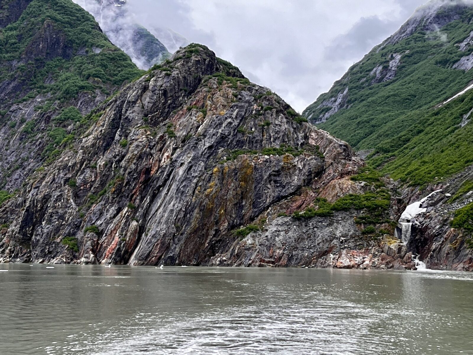 The Tracy Arm is about 600 feet deep, surrounded by steep cliffs rising up to 7000 feet high, with vegetation clinging to every cranny.