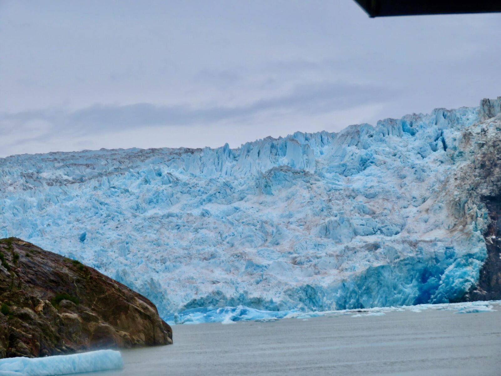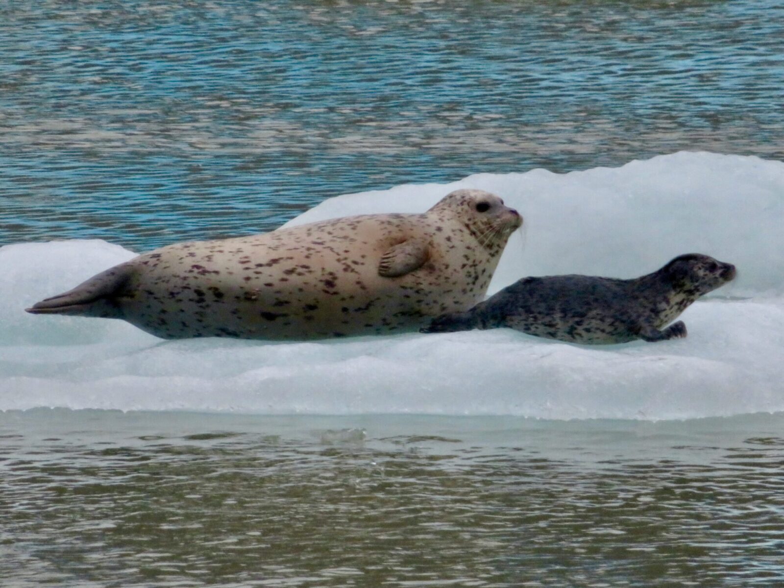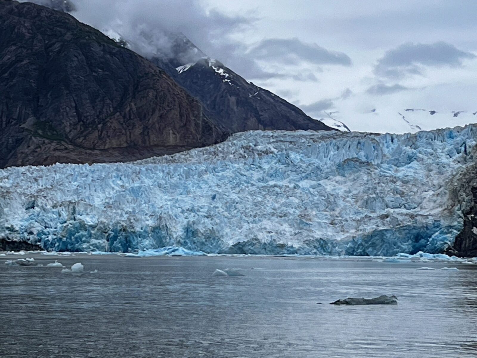 The waters immediately in from of the North Sawyer Glacier are a harbor seal calving area. If you look closely at the picture above, you can see little specks – harbor seals – on many of the icebergs. Their size relative to the wall of ice gives a sense of how massive this glacier is. The glacial silt carried into the fjord makes the water impassable for killer whales, harbor seals’ main predator. So the iceberg’s calves support the harbor seals’ calves – a sweet little circle of life.
