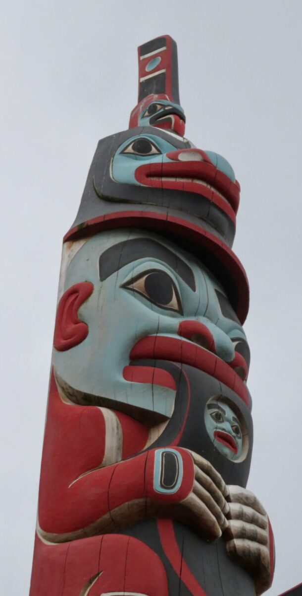 The totems were commissioned and carved by TlingÃt, Haida and Tsimshian artists using imagery representing the history and clan symbols of the tribes. Storyboards explain the poles’ symbolism. Traditionally, totem poles stood on the shores in front of Native villages so they were the first thing seen by visitors. These poles are intended to recreate some of that experience for visitors.Â