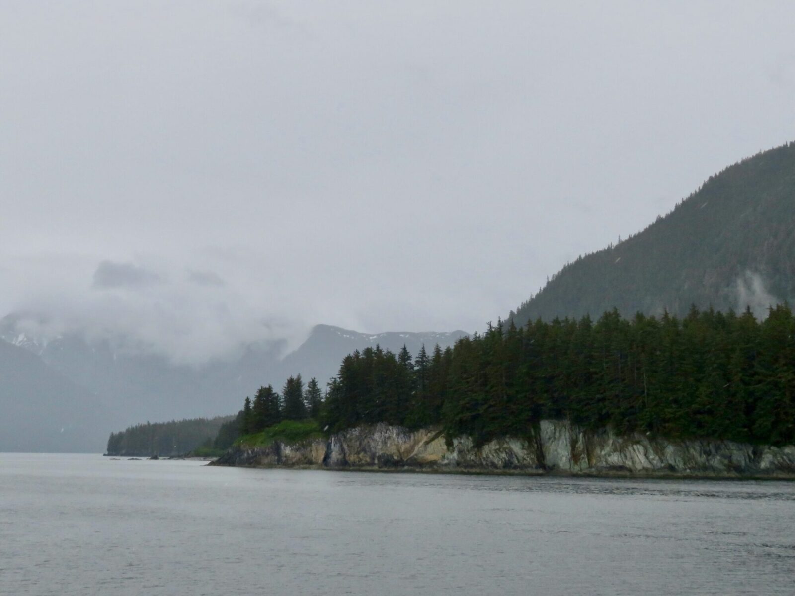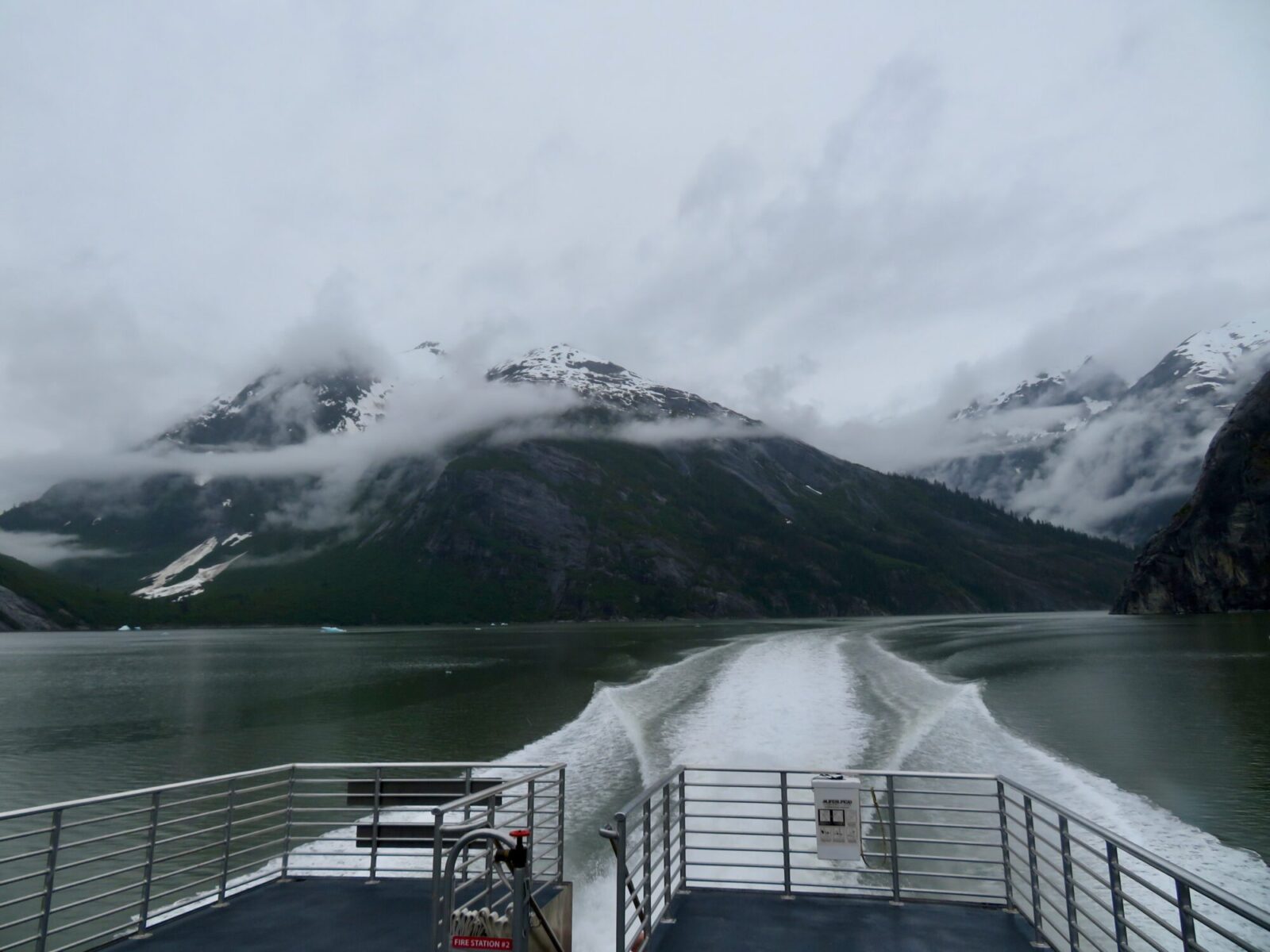 We chugged slowly past the cruise ships with rain drumming down and ominous clouds above. Once we cleared the harbor and picked up speed, the ride got bumpy.