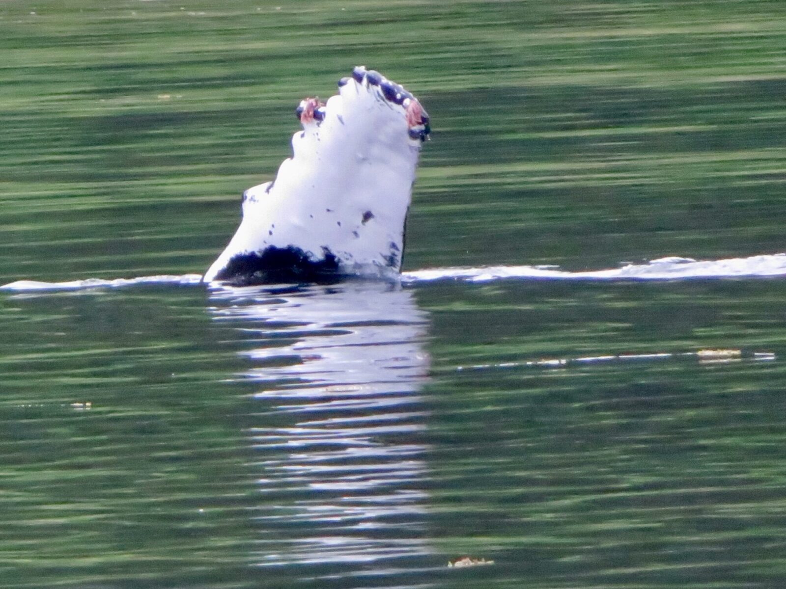 We saw a number of humpback whales on our way back, feeding in the currents as the tide rushed in. Most interesting was one whale in the (relative) shallows who was “flashing” fish. It’s a common humpback fishing strategy: the whale lifts its fins above the water to frighten the fish and drive them towards the shore where the whale can encircle them and gulp the down that giant maw. This graphical image from the Smithsonian illustrates the humpback flashing technique.