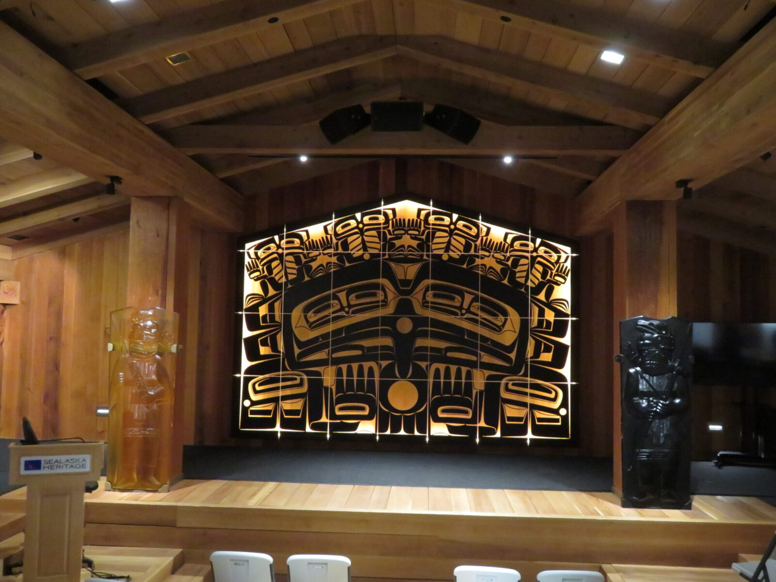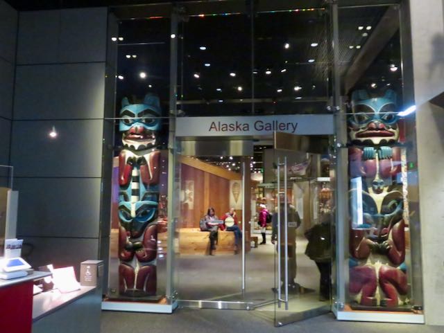 Leaving Takhu, we found a long term parking place (not an easy task – most parking lots and structures in downtown Juneau are reserved for local permit holders) and walked over to the Sealaska Heritage Center. These are the folks responsible for the Celebration we visited on Monday, and for Native art present throughout the area. Formed in 1972, Sealaska is the Native Corporation governing tribal activities in southeast Alaska.