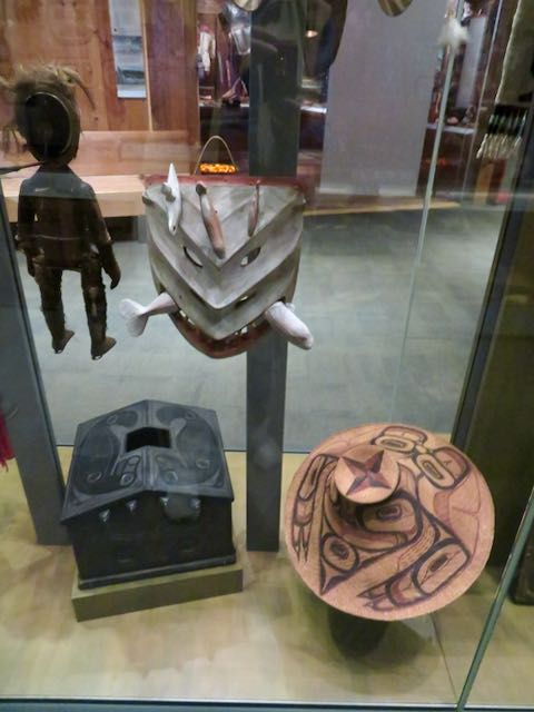 Inside, we found visited the clan house and learned more about Tlingit culture from a lovely lady (Eagle moiety/Thunderbird clan) who accompanied us from the gift shop. The art gallery included both heritage pieces and new works by young Native artists bringing their own spin to ancient traditions.