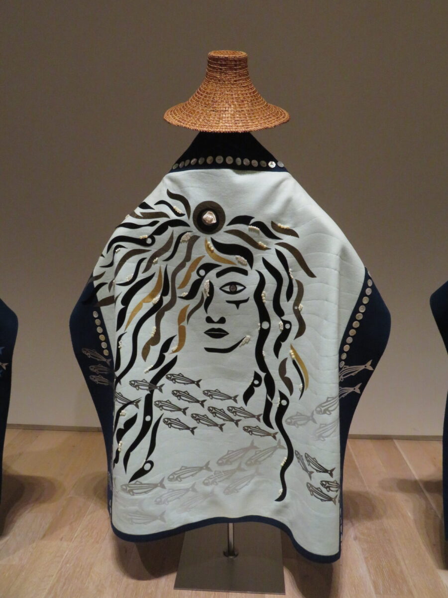 These ornately embroidered cloaks were created as part of the ritual surrounding the herring roe fishery, captured in the video, and now on loan to the museum.