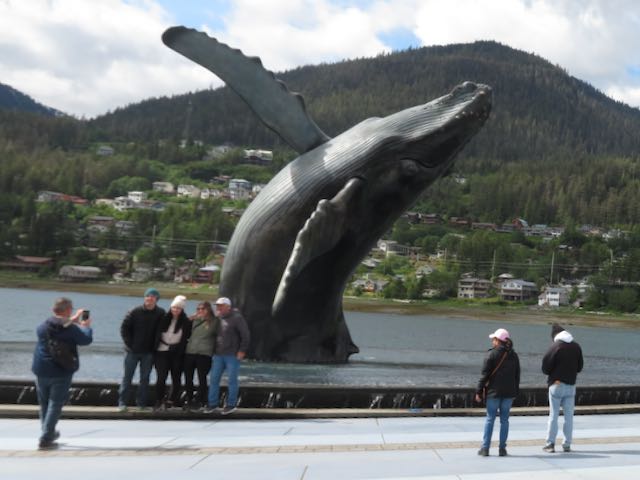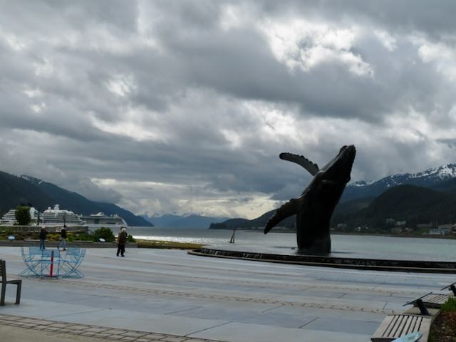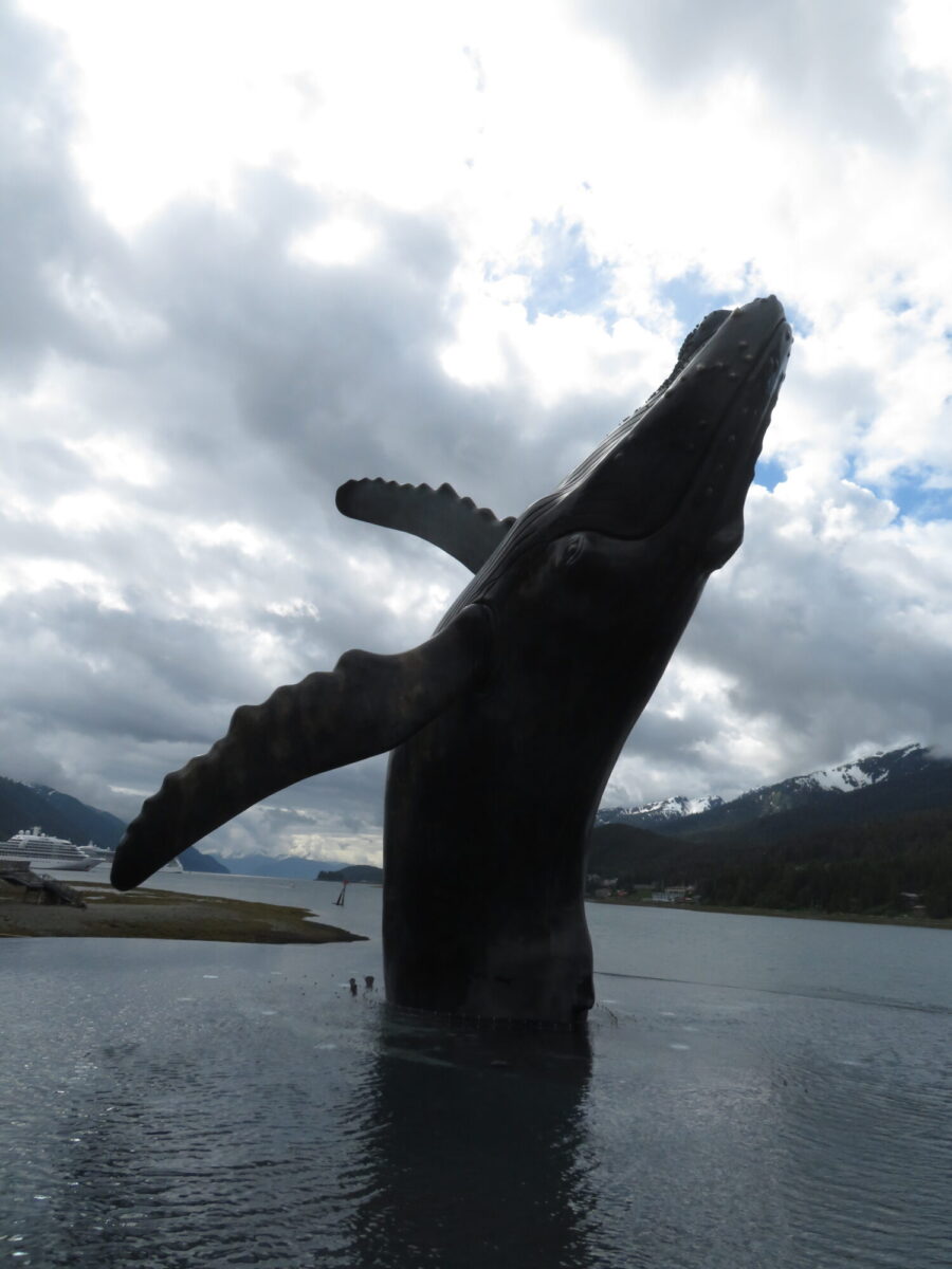 Our first stop was a visit to Takhu, the Whale Sculpture, on the northern end of Juneau’s waterfront. Takhu is a life size humpback whale, 25 feet long, captured in the act of breaching and rolling back into the sea. Sculpted over more than 10 years – first as a two foot model, than an 8 foot prototype – the sculpture is joyous, lively and breathtakingly beautiful. Standing next to Takhu really brought home the size and muscularity of these gentle creatures.
