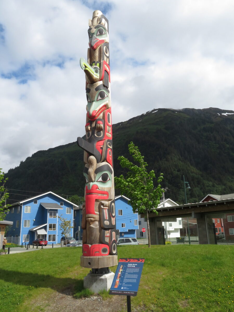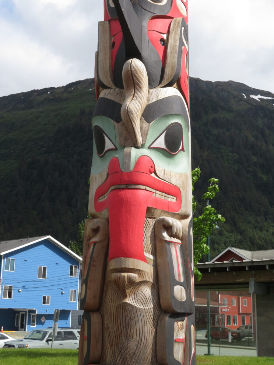 The Raven and Eagle (represented on totems below) are the two major matrilineal descent groups of the Tlingit people. People are born into one “moiety,” and must marry into the other descent groups.