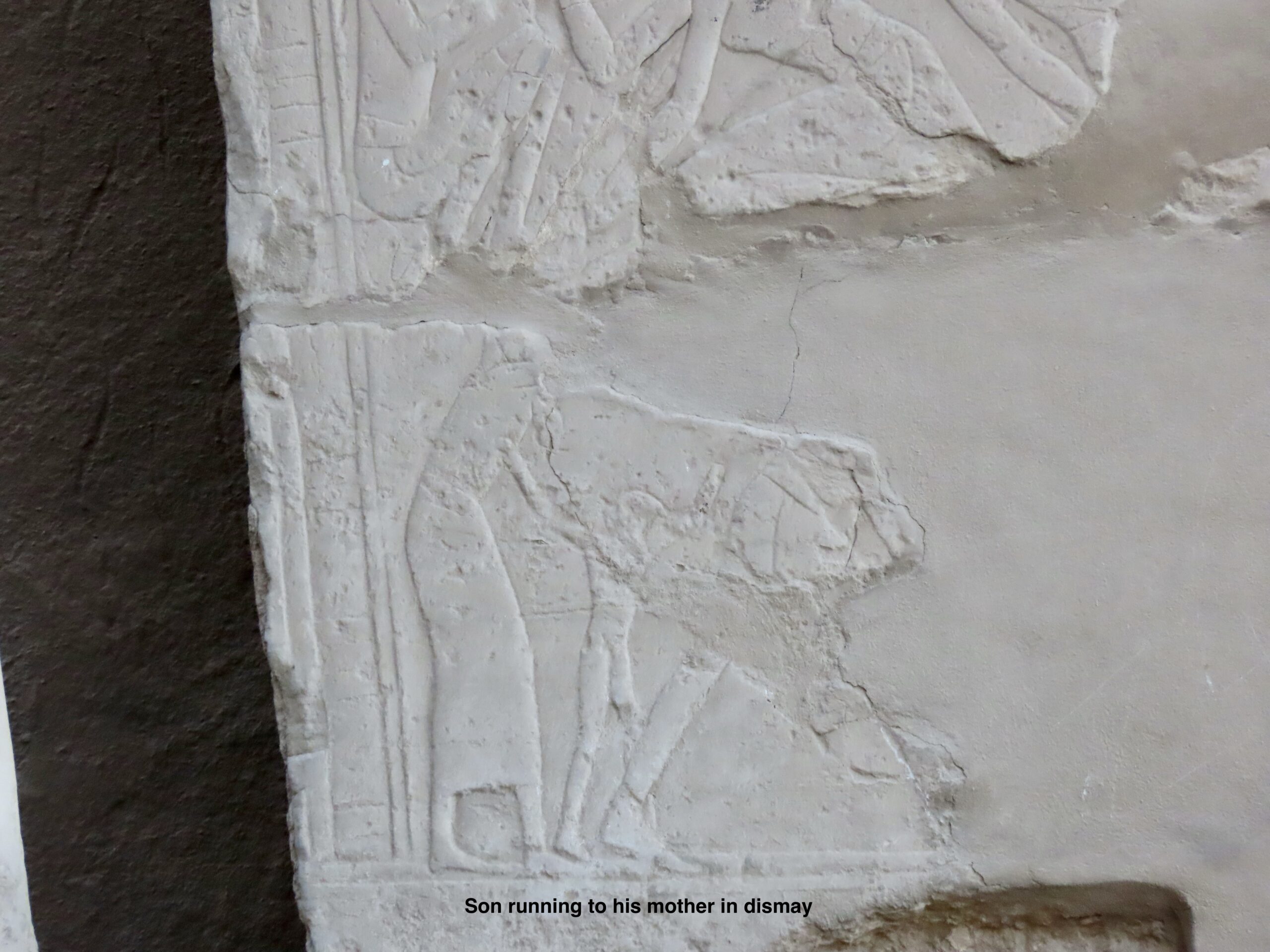 On the way, we stopped to look at a gate containing scenes from Seti 1reflecting  victories over conquered peoples in Phoenicia and Canaan. (These date to the New Kingdom, Egypt’s imperial era.). Amr pointed out some poignant details in the Canaan reliefs: a messenger bringing bad news to his ruler and a boy running to his mother in dismay at the approaching army.  He also noted that Seti 1’s cartouche on this gate includes the Seth animal – an image he later dropped because Seth got a bad rap as an agent of chaos and enemy of Osiris. (Seti means “of Set,” so go figure.)