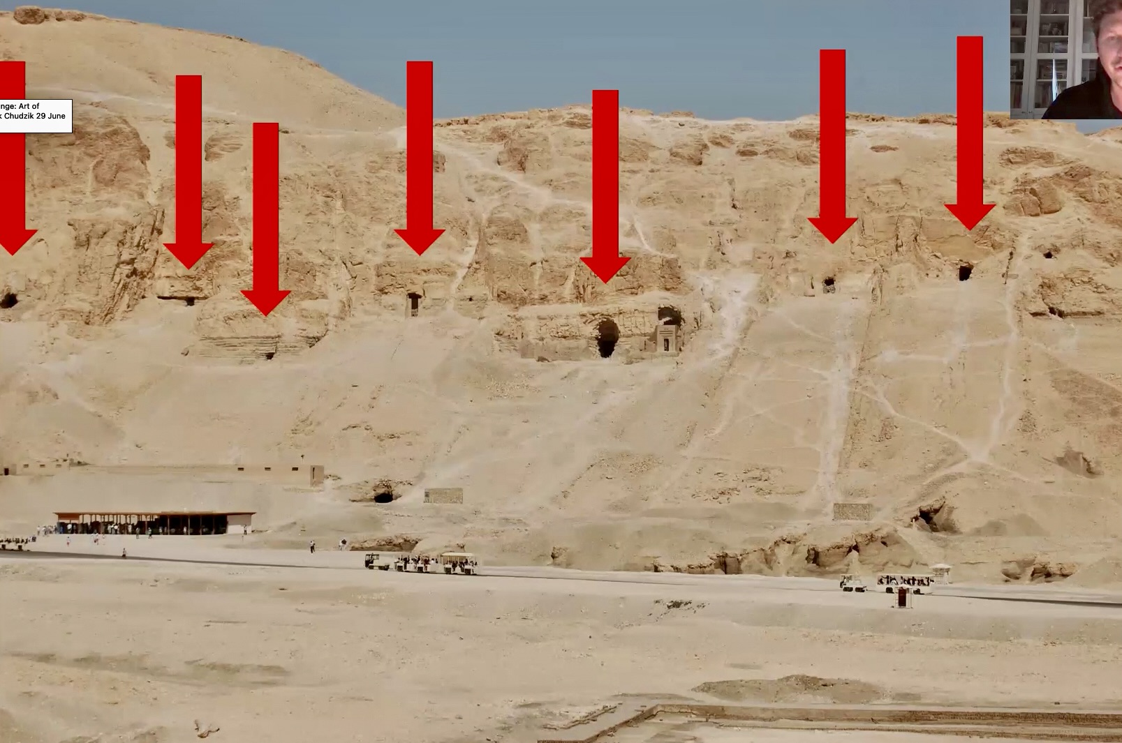 We got a delightful surprise when Dr. Patryk Chudzik (of the Polish Expedition) dropped in on us as we were wrapping up our visit to the temple. Patryk and his team have been working for several years on a set of nobles’ tombs located south and east of the temples on a ridge known as the Asasif. Earlier in the year, he delivered an excellent Kemet Club course on the team’s work in the context of the evolution of Middle Kingdom Art.  These tombs were originally constructed by people serving Mentohotep 2, but reused in later times (a common practice). All were looted and robbed in antiquity, creating a mass of artifacts from different eras all jumbled together. The current work focuses on sorting through the jumble and conserving the walls, with some tombs to possibly be opened to the public in future.