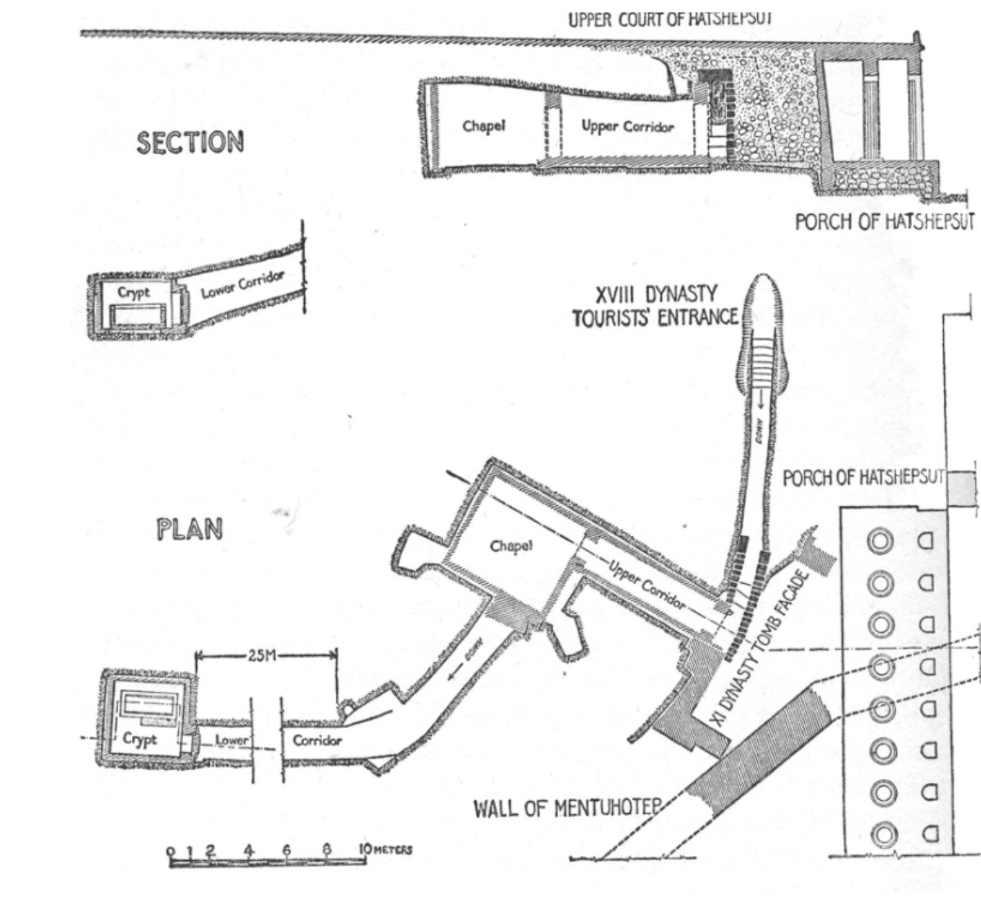 The Polish-Egyptian team’s conservation work was the subject of our next very special visit: a trip inside the tomb of Mentuhotep’s sister-wife, Neferu.  Her tomb is located on the north side of Mentohotep’s temple, between the two temples, in a position that is now covered by Hatshepsut’s grand plaza. Like her brother, Neferu was revered by later generations and her tomb chapel was still in active use when Hatshepsut’s temple was built, 600 years later. To allow continued access to Neferu’s chapel, those 18th Dynasty builders constructed a tunnel beneath Hatshepsut’s temple to the chapel’s entry corridor.