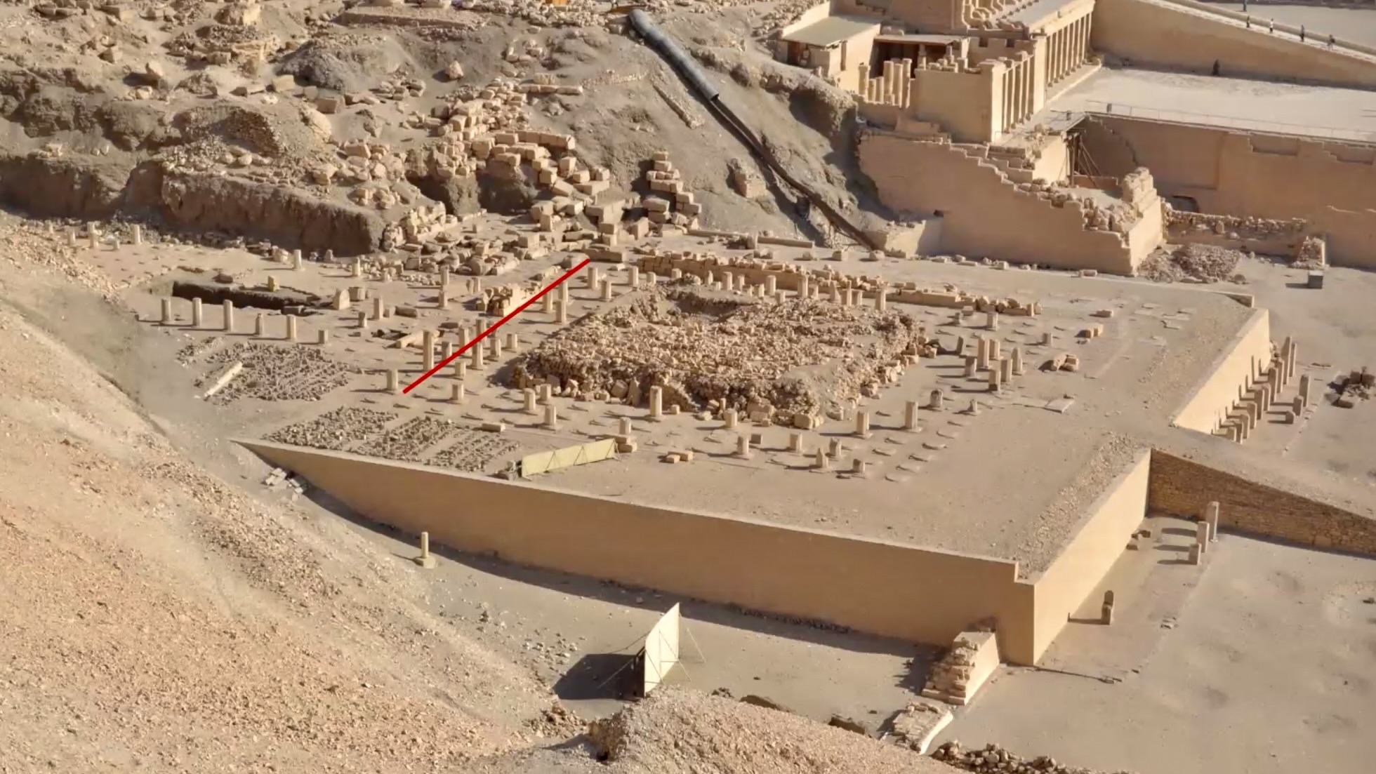 These slides made by Gregory Mumford (who makes the lecture notes from his Egyptology classes available for download on Academia) show the plan of Mentuhotep 2’s terraced temple. There was a very large plaza in front of the temple containing a grove of sacred sycamore trees and loads of statues of Mentuhotep, a few of which have been left in place.