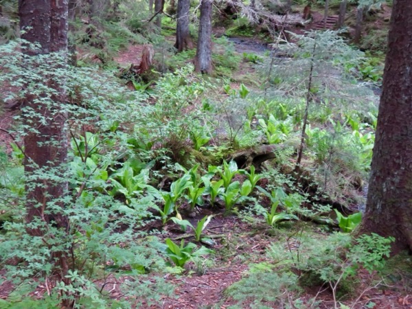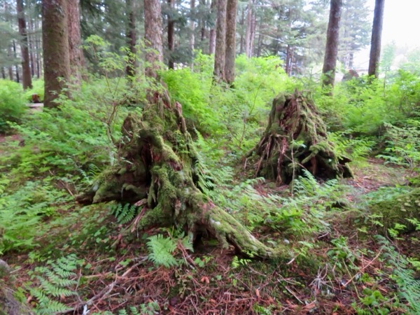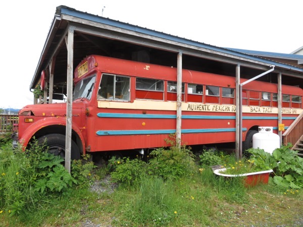 We stopped and tried to take a walk around Nirvana Park, but a heavy rain shower stopped our visit. This site holds both an Eyak cemetery and the faint remains of what was once a large “folly,” a park with bridges and gazebos made from branches. Only the park’s paths remain today.