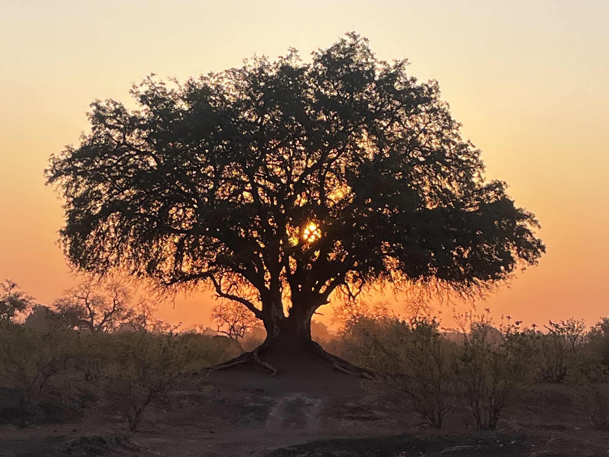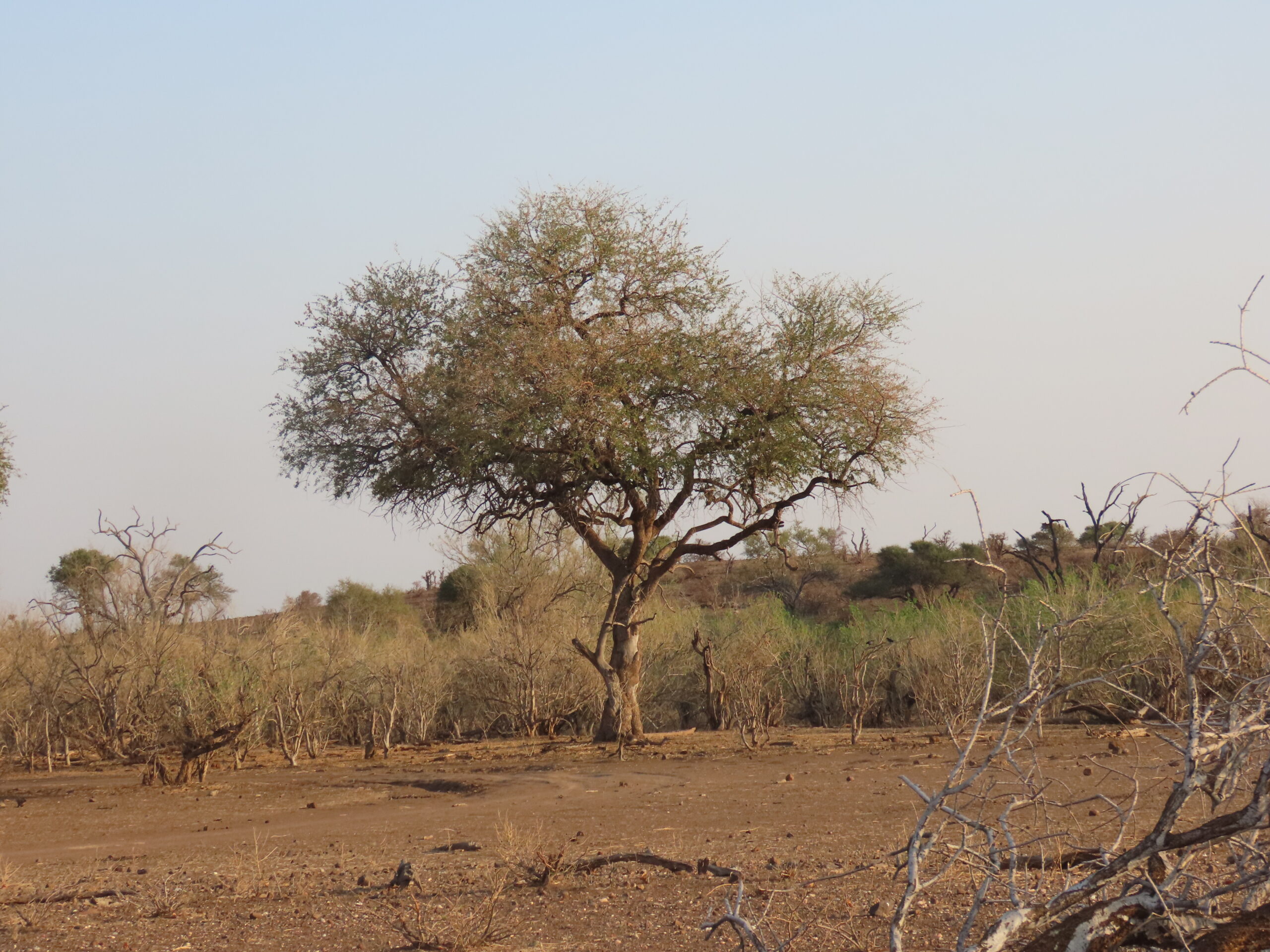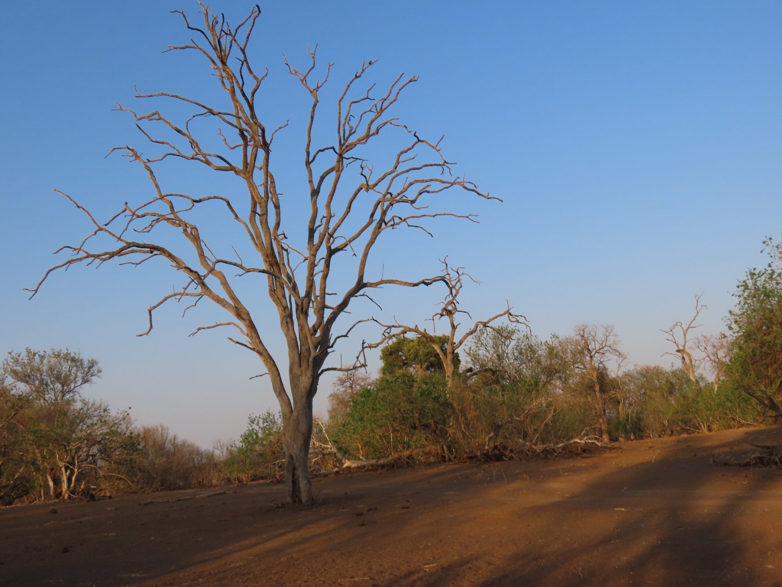 After High Tea at 3:30 pm with way too much food (we misunderstood what we were ordering), we headed out at 4pm for an evening game drive. Leaving the camp, the road passed over barren, rocky hills through stunted Mopane and Shepherd’s trees, dipping down through rock-bottomed gullies and sand-filled dry stream beds to an area with enough underground water to retain tall trees and shrubs.